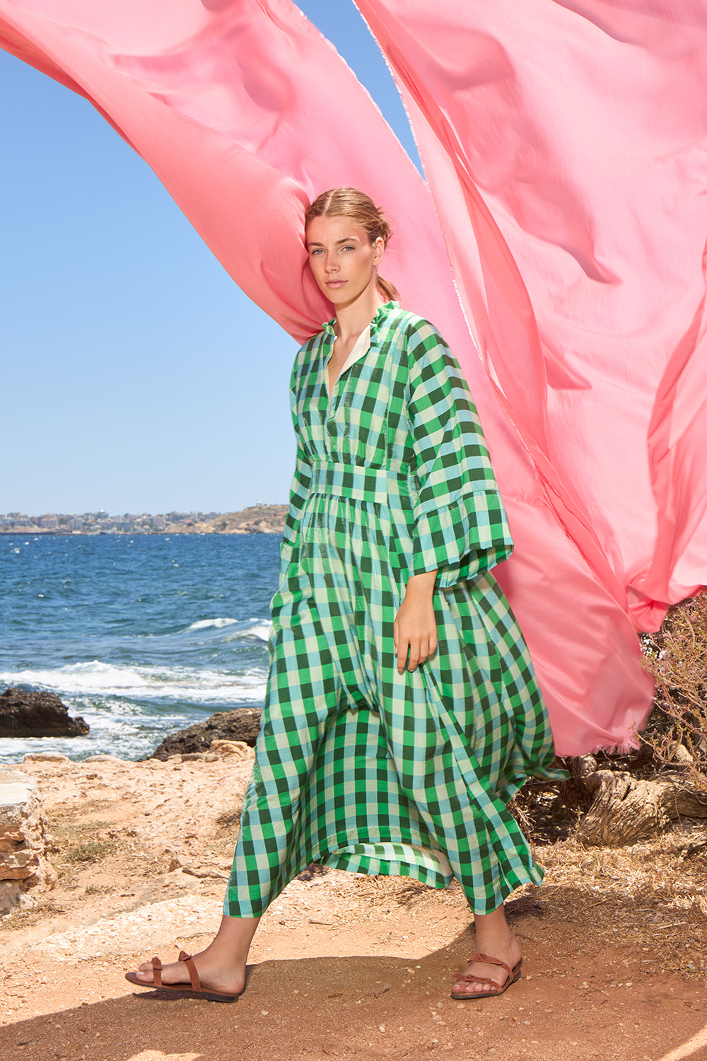 The Nadine Green Dress is a maxi slim fit dress with a zipper on one side. This playful plaid design with the long bell sleeves with pipping around the hem and the side pockets creates a remarkable image fool of joy. The V neckline with the distinctive ruffle at the end of it along with the large waistband complete a delightful image.