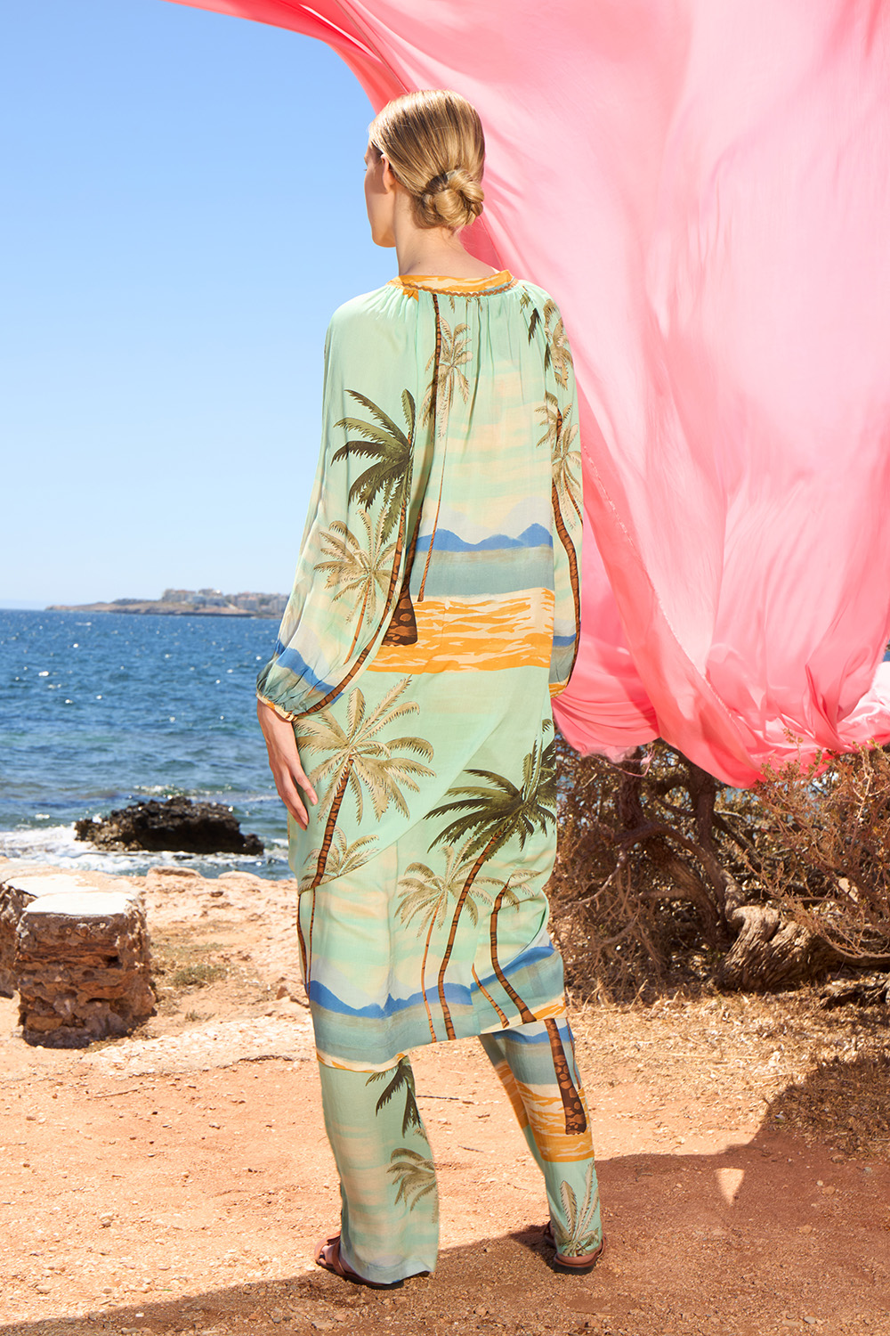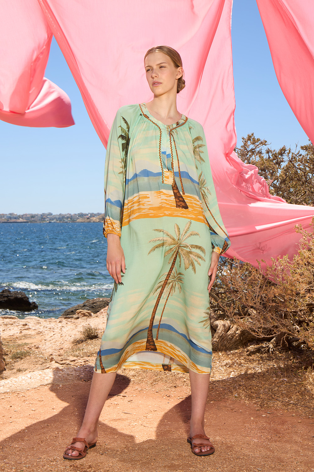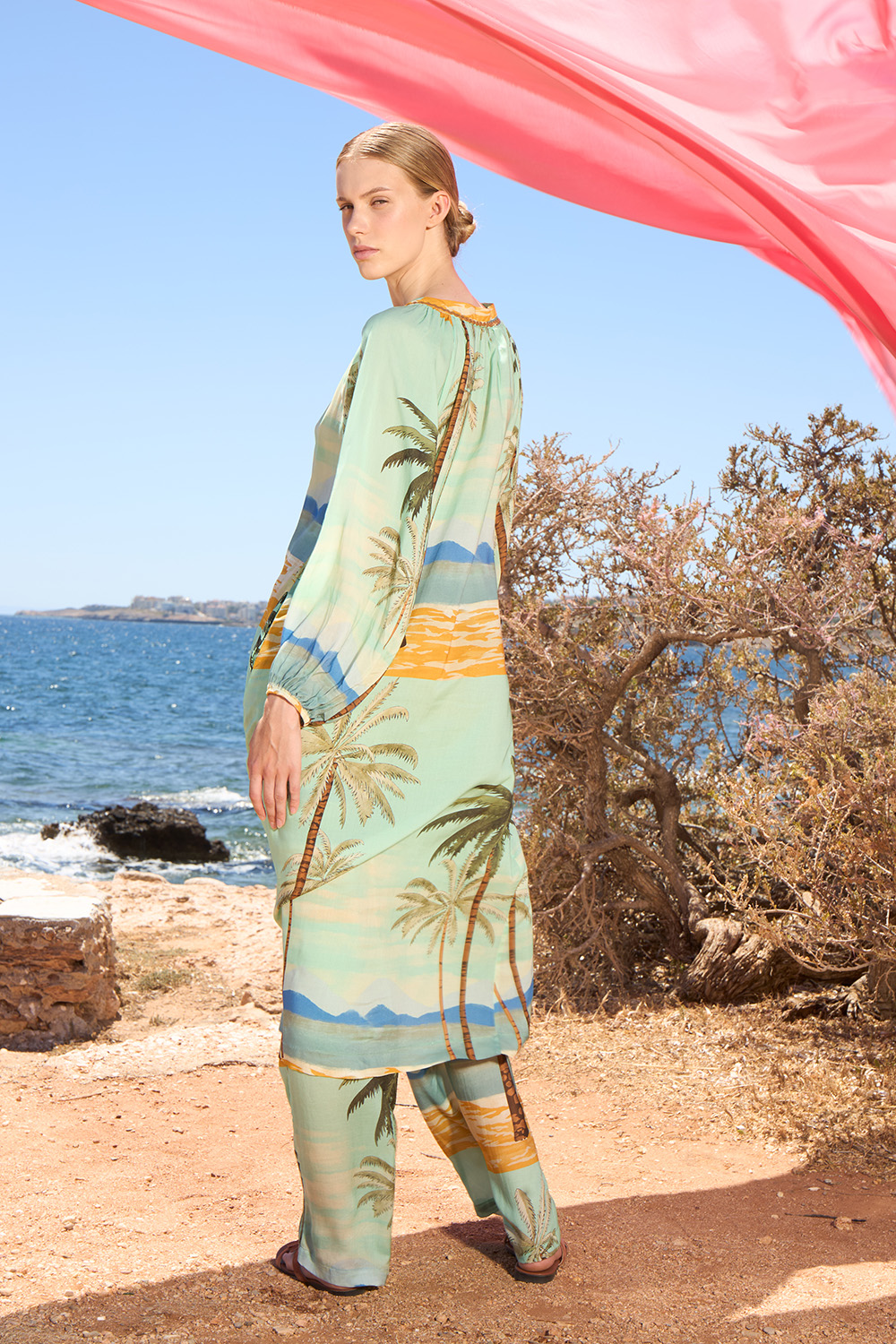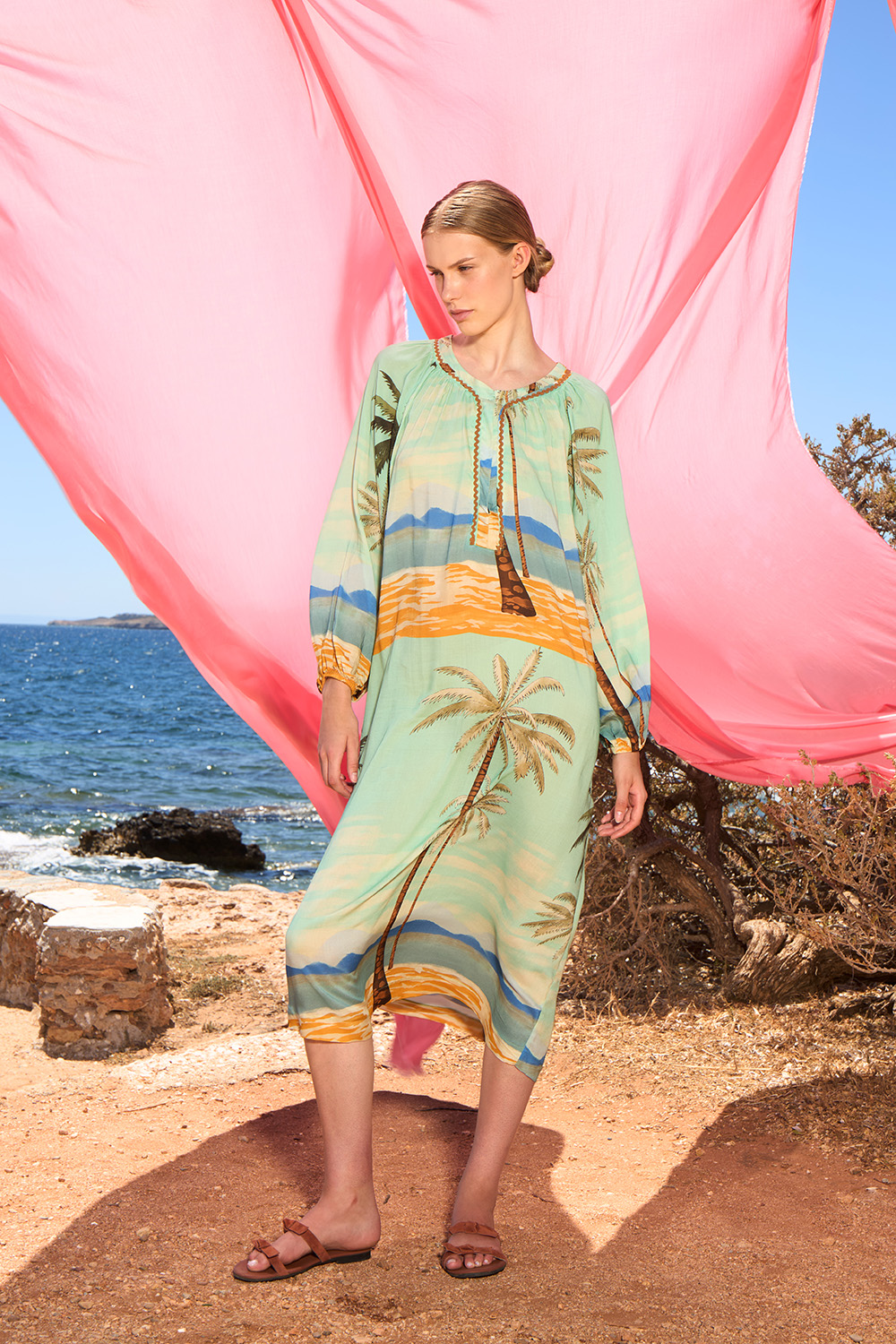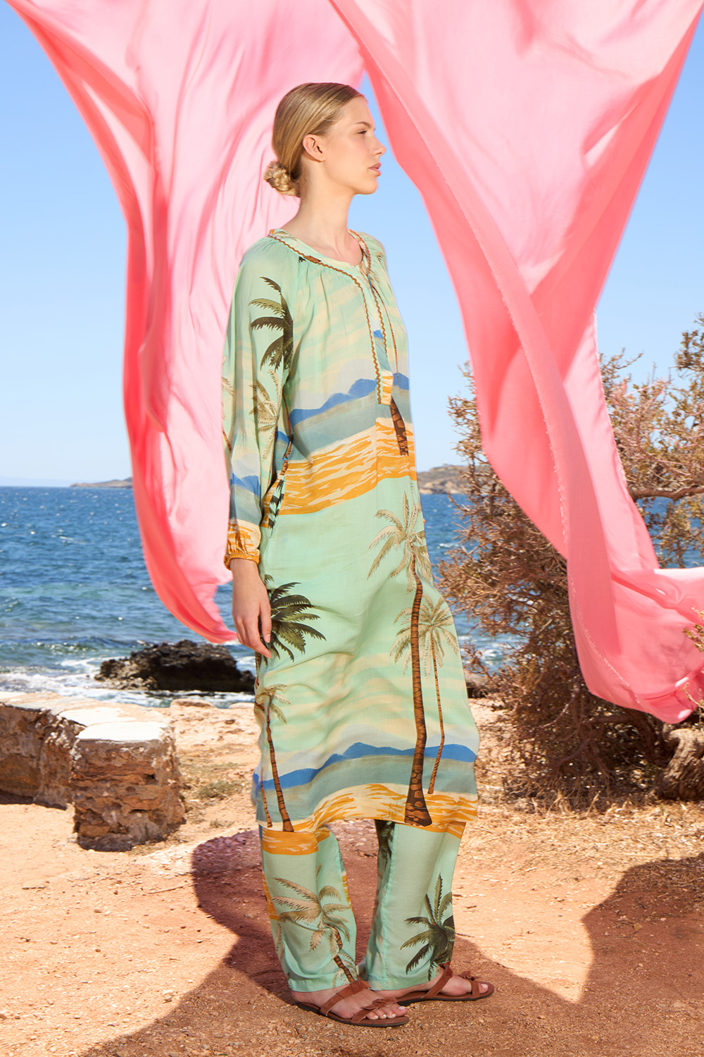 The Adelita dress is a regular fit design made of the excellent textile of tencel. The midi length along with the long elasticated at the end sleeves are creating an image full of summer and carelessness. The deep V neckline add even more freedom to this piece that knows how to handle the warm temperatures.