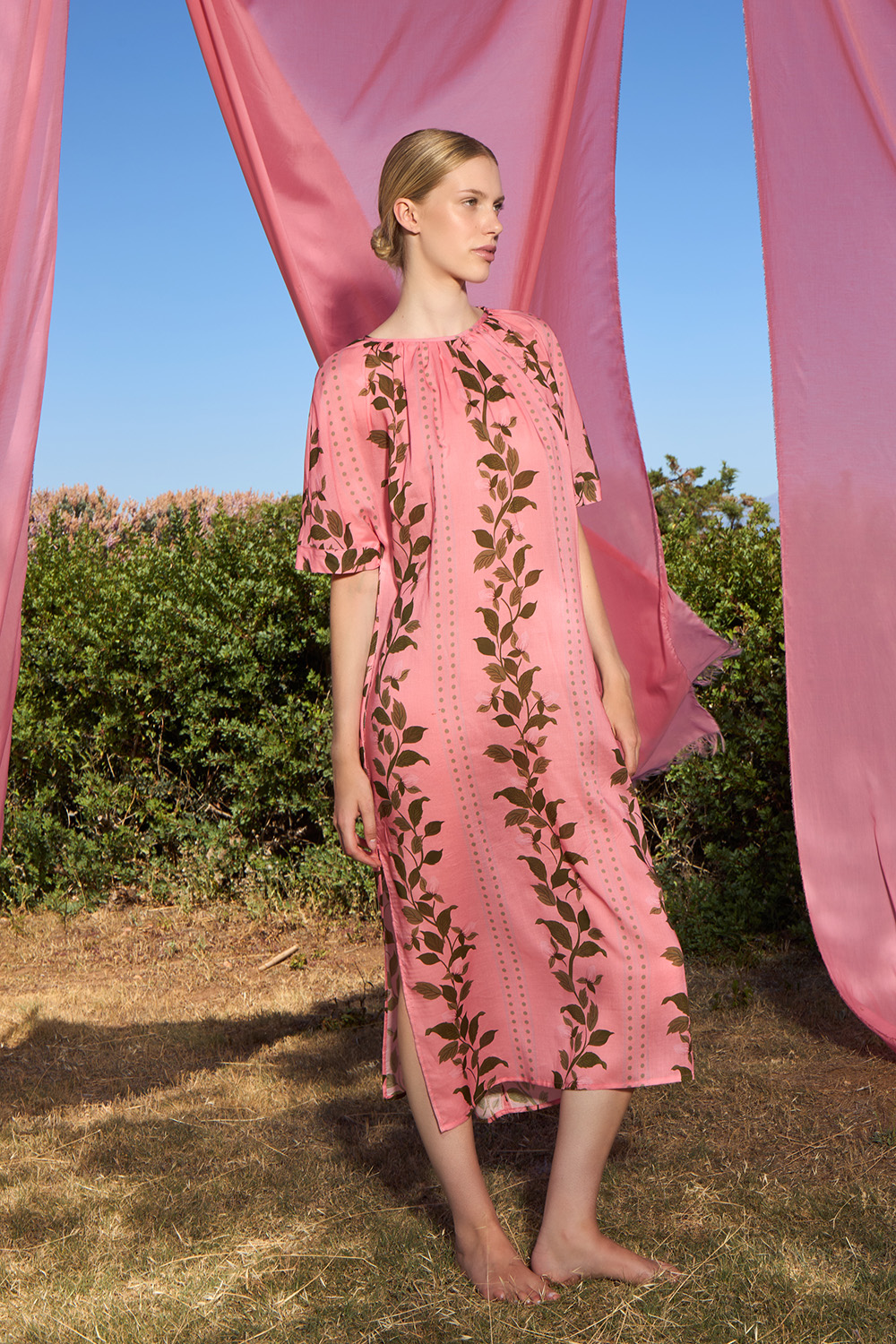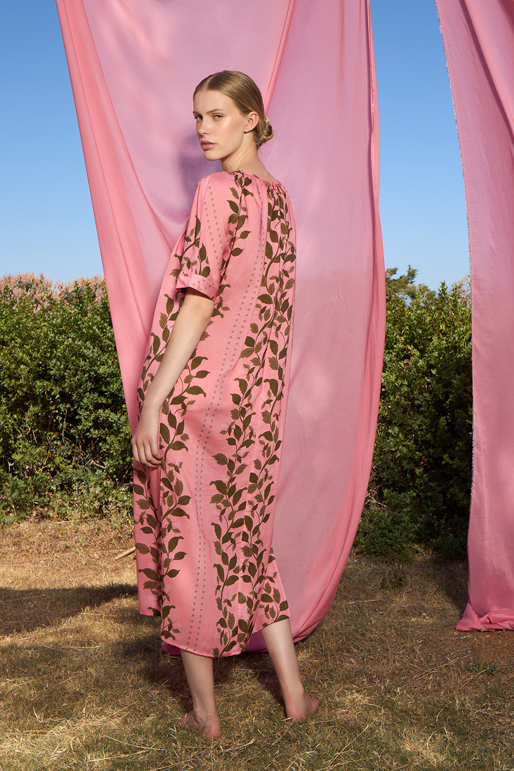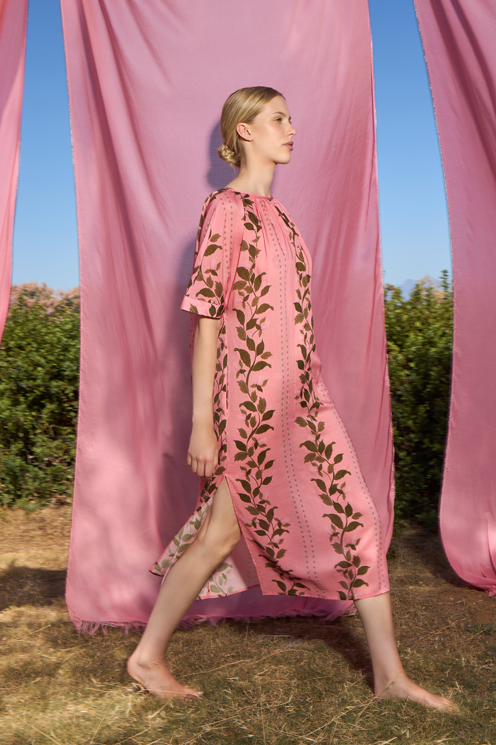 The Adin Pink Dress is a short sleeve midi length design made of the fine textile of tencel. The distinctive frills around the round neckline are adding some more charm to the whole image while the slits on both sides are making that look effortless.