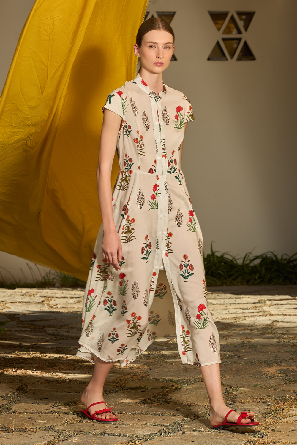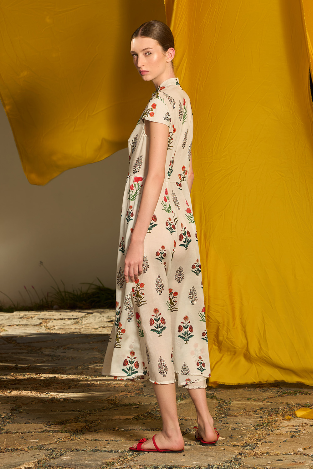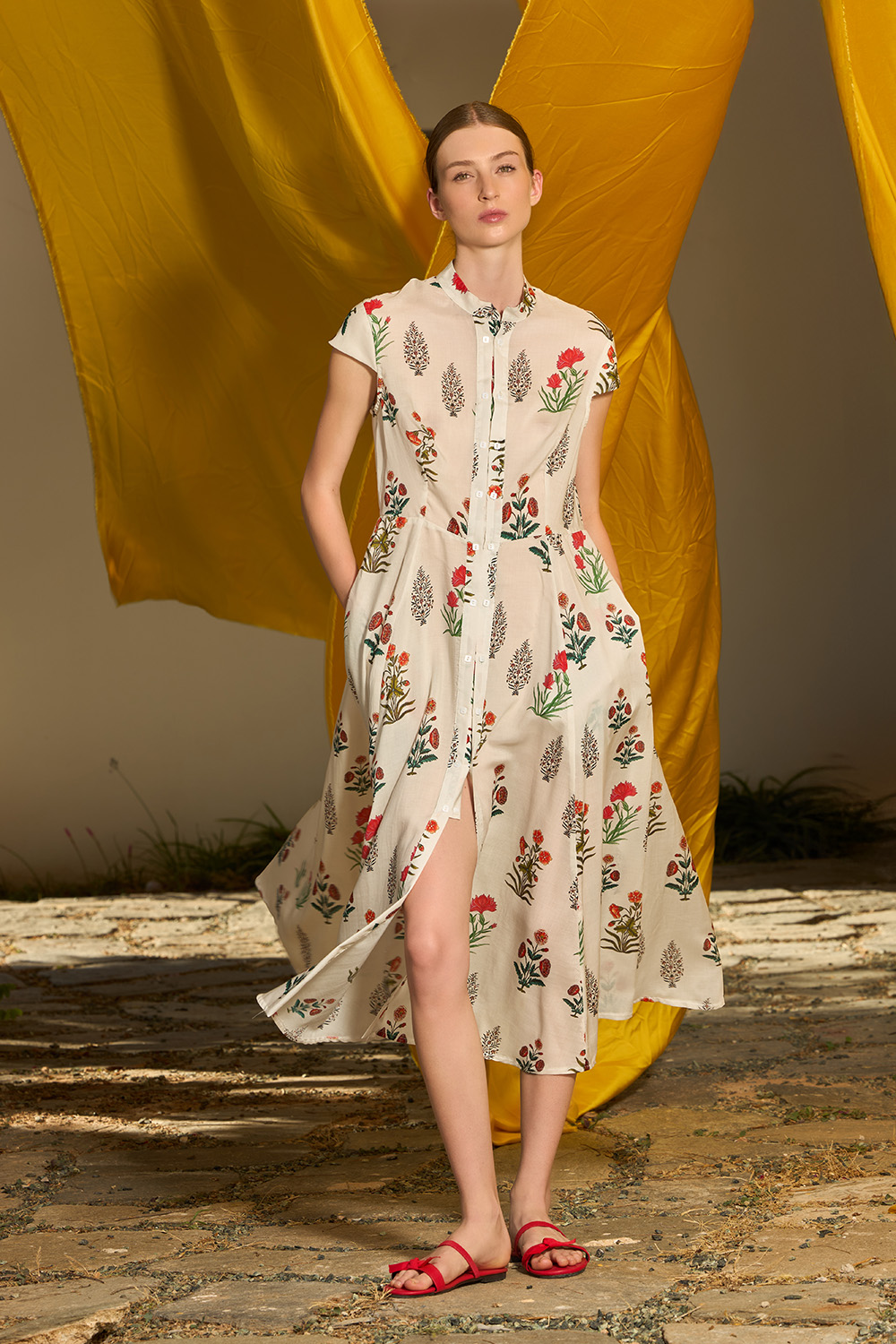 The Aliza Cream Dress is an endearing midi dress with short sleeves made of the fine textile of tencel. The small stand collar along with the distinctive front buttons give away an elegant appearance full of style while the side pockets offer the hands some chilling time.