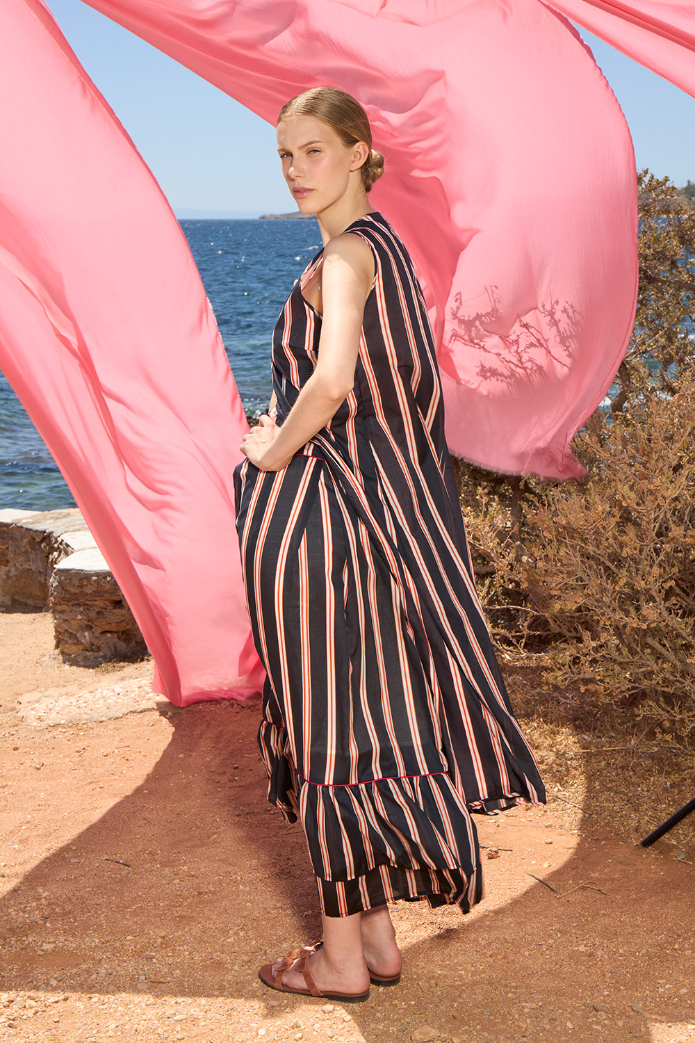 The Astree Blue Skirt is a slim fit high waisted piece made for a unique appearance. The maxi length along with the large waistband and the playful ruffles at the end are giving away the most delightful vibes. The zipper on the center back offers the perfect adjustment.