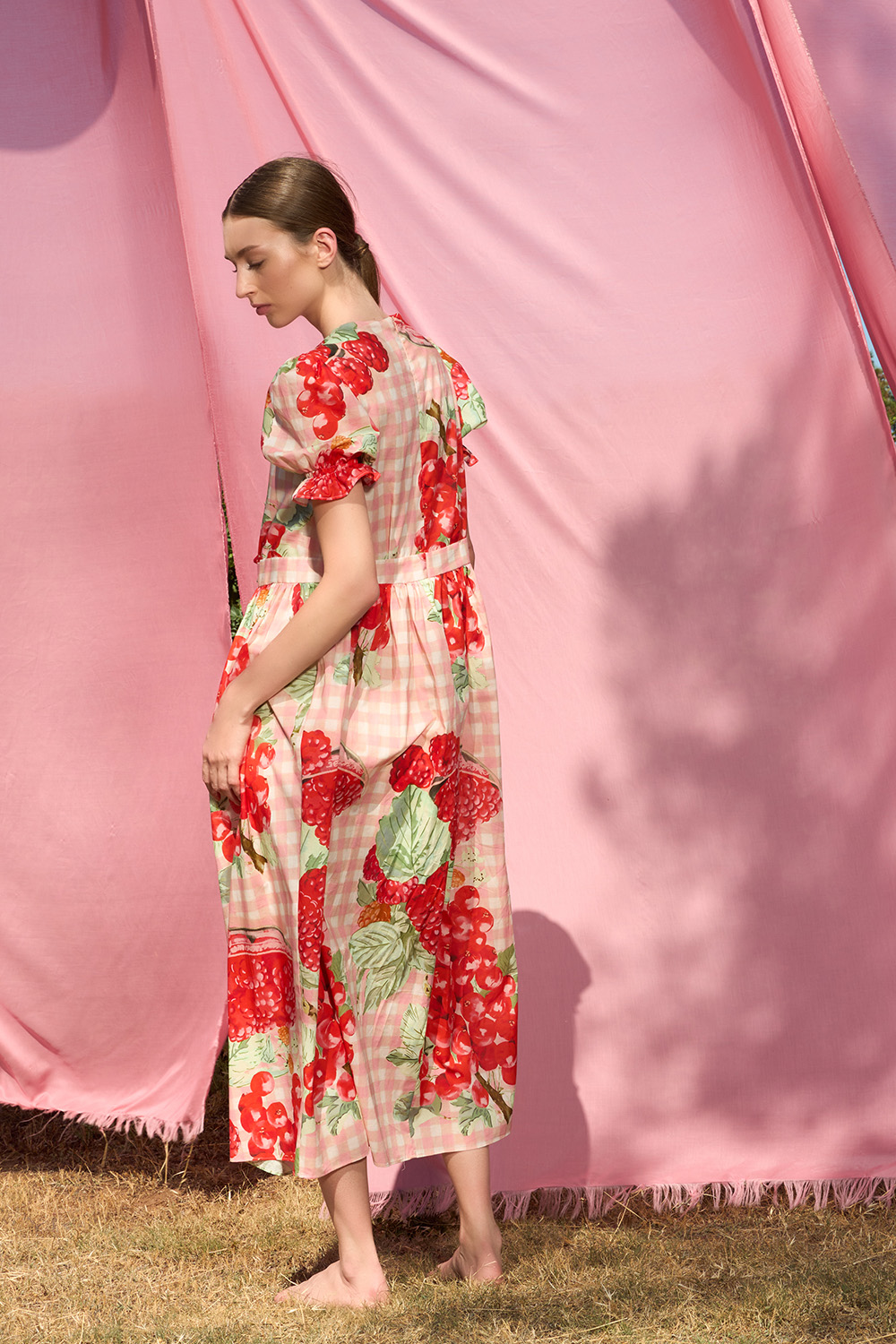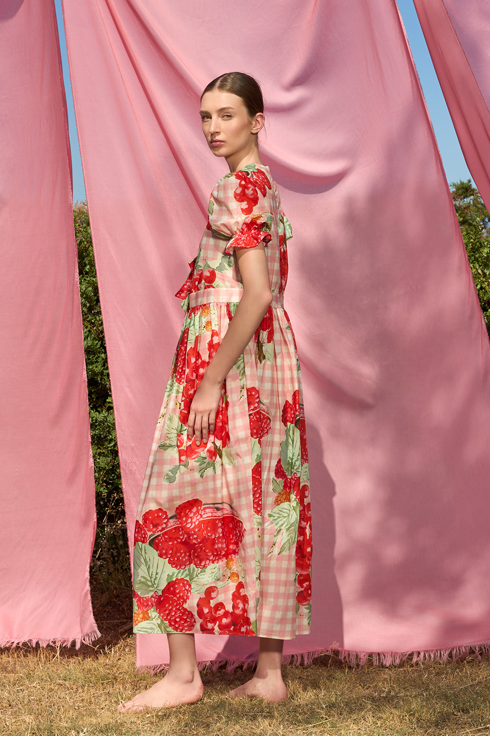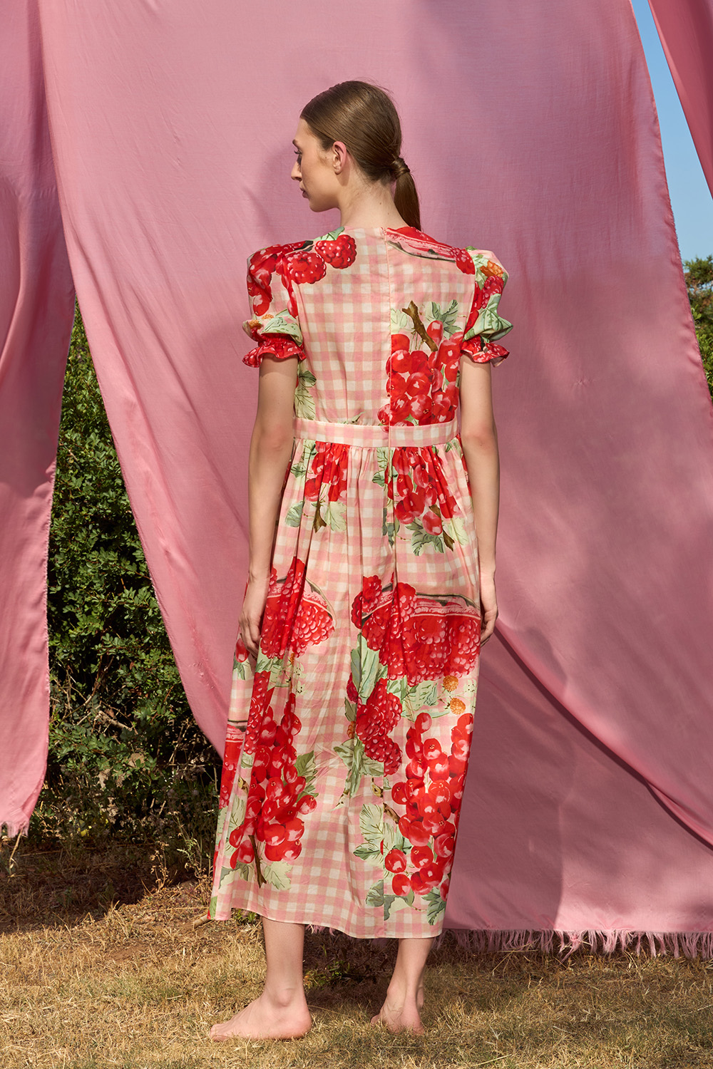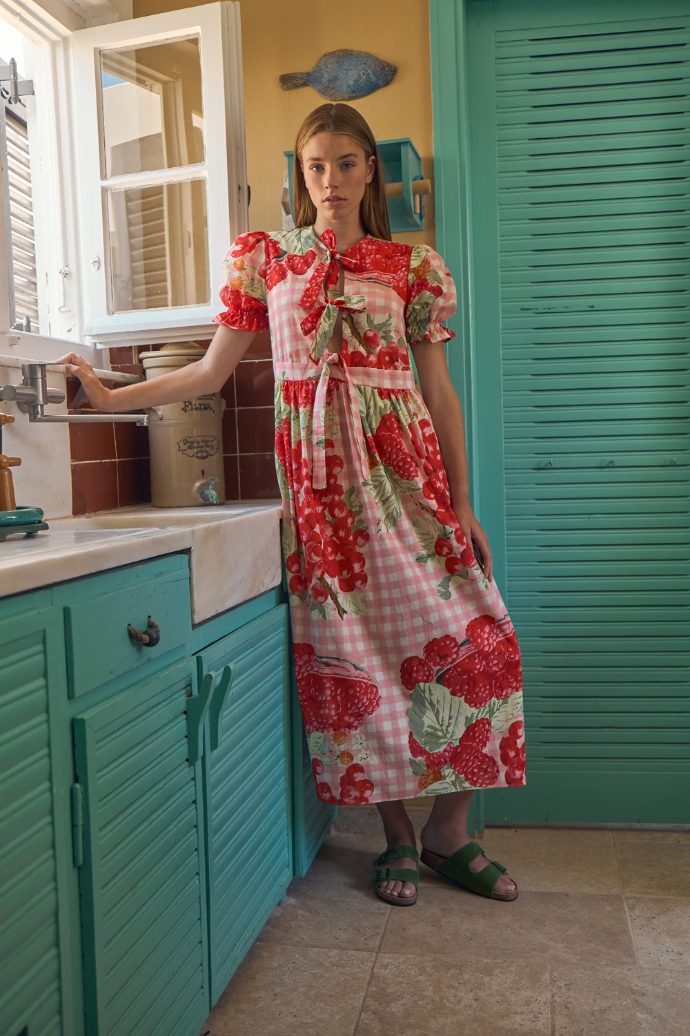 The Burry Dress is a beautiful midi piece made of cotton. Its print features a pink and white gingham backdrop with red berries. Its , short puffy sleeves and string front closures that tie as cute bows that go up to the waist showing part of the sternum make it romantic yet daring.
