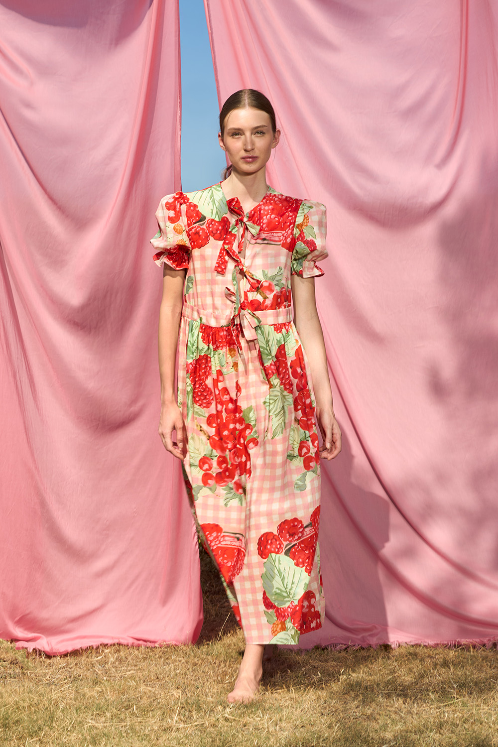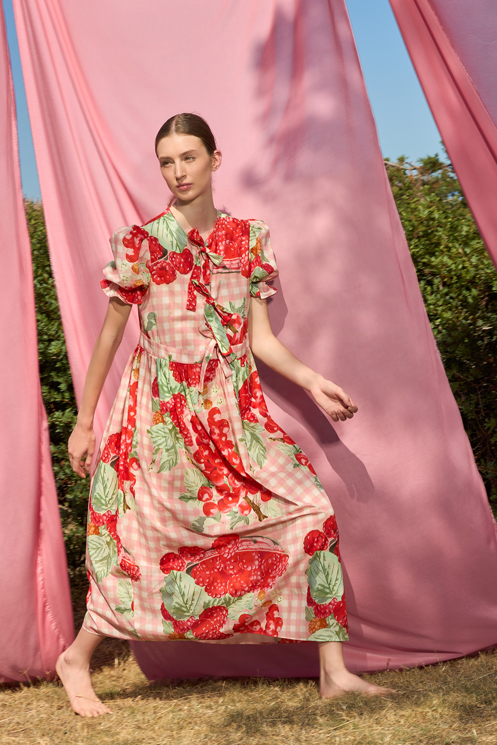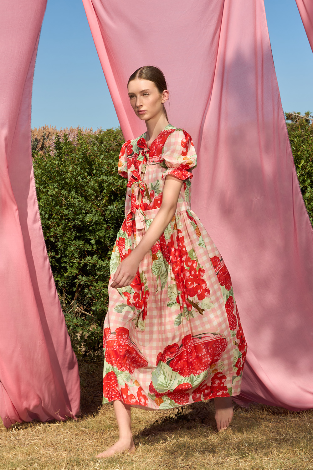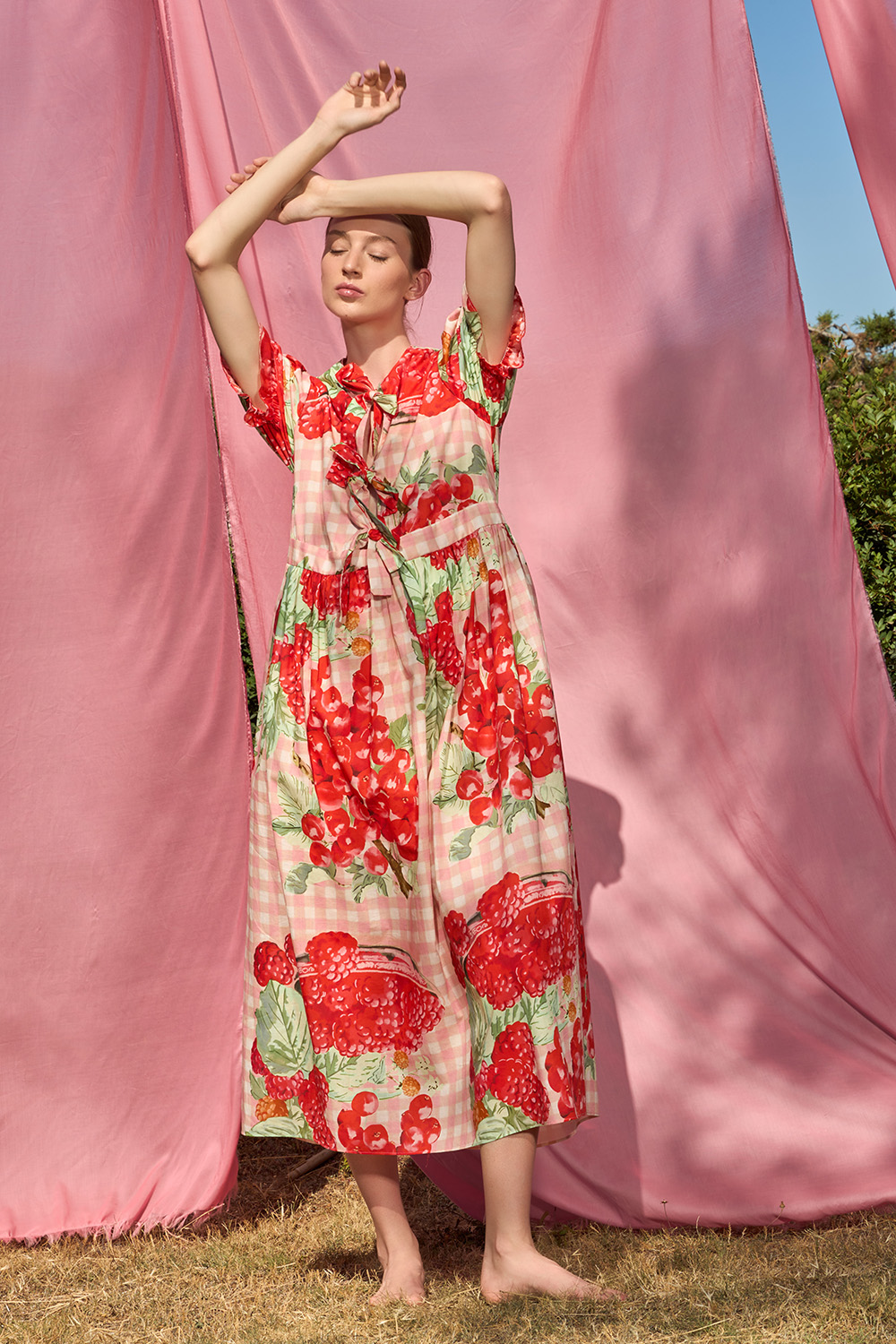 The Burry Dress is a beautiful midi piece made of cotton. Its print features a pink and white gingham backdrop with red berries. Its , short puffy sleeves and string front closures that tie as cute bows that go up to the waist showing part of the sternum make it romantic yet daring.