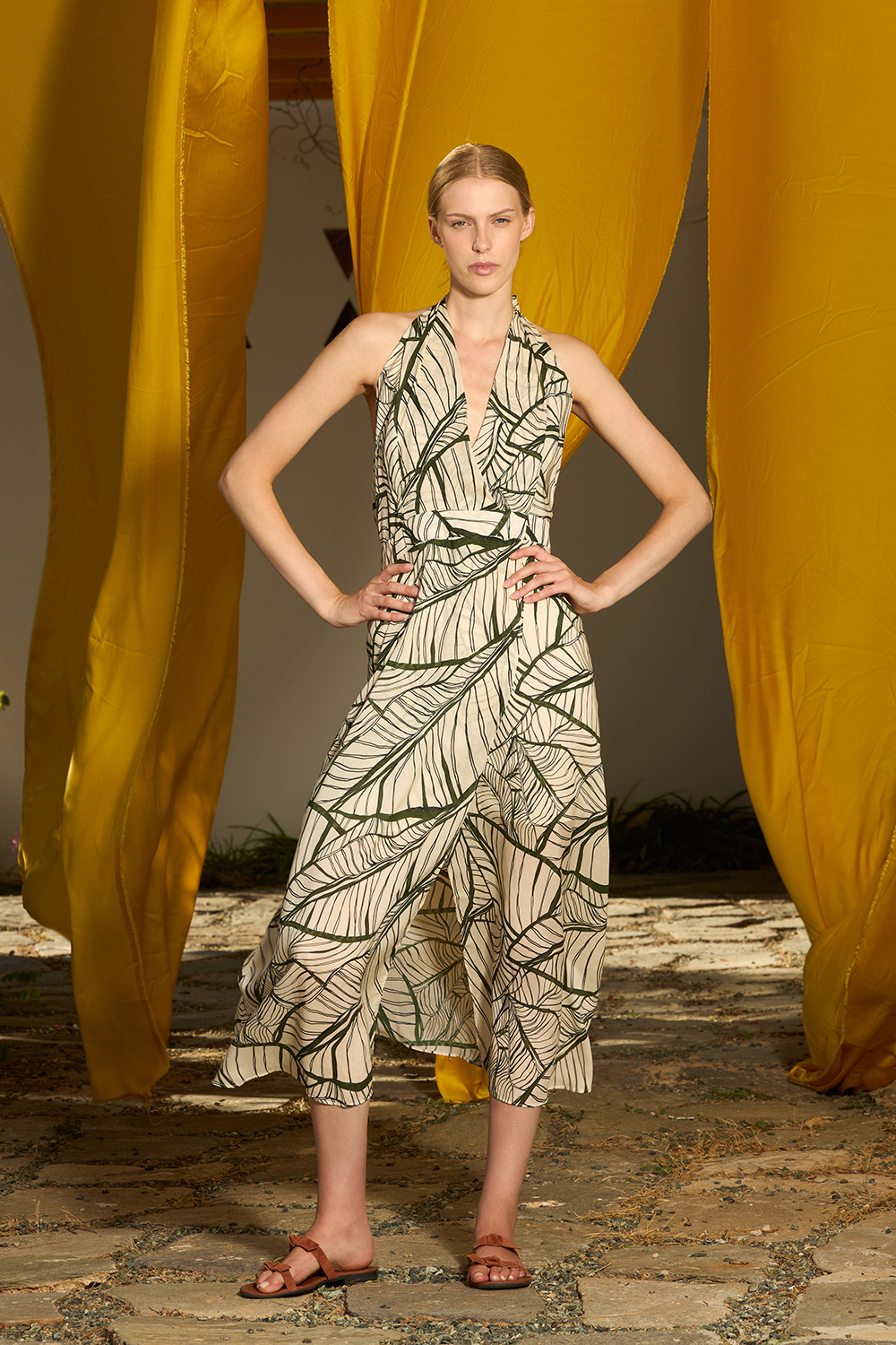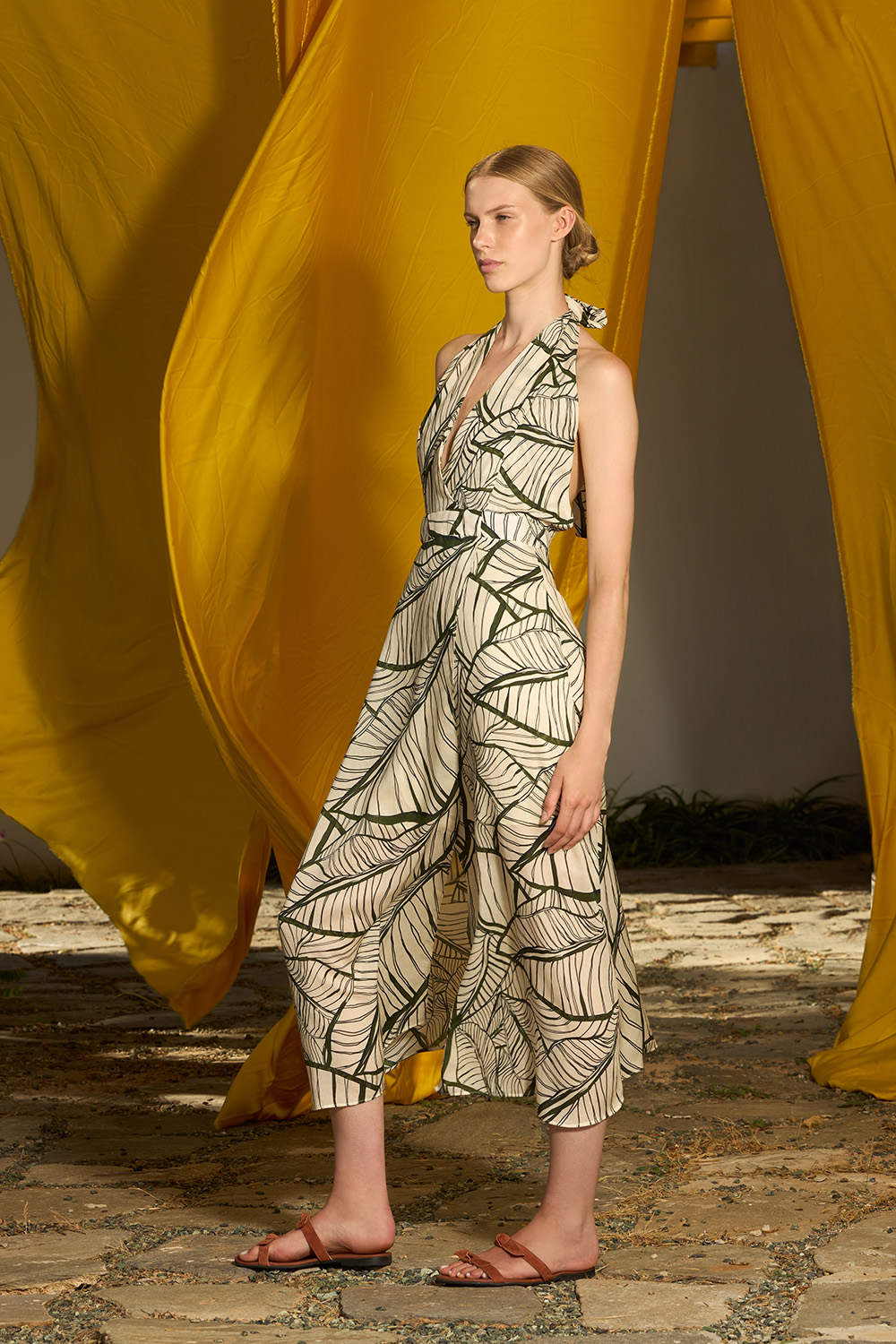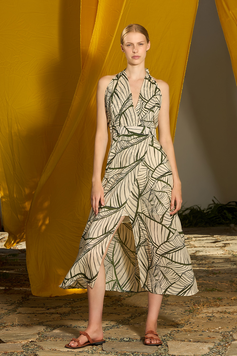The Eryn Green Dress is a midi length wrapped design made of tencel. The halter neckline that tights at the back of the neck allows the hands to feel the breeze while the open back gives away some extra summer feeling. The belt around the waist offers this dress even more charm and adjustment and the zipper on the center back makes it easy to wear.