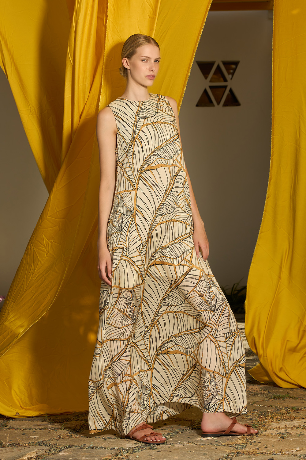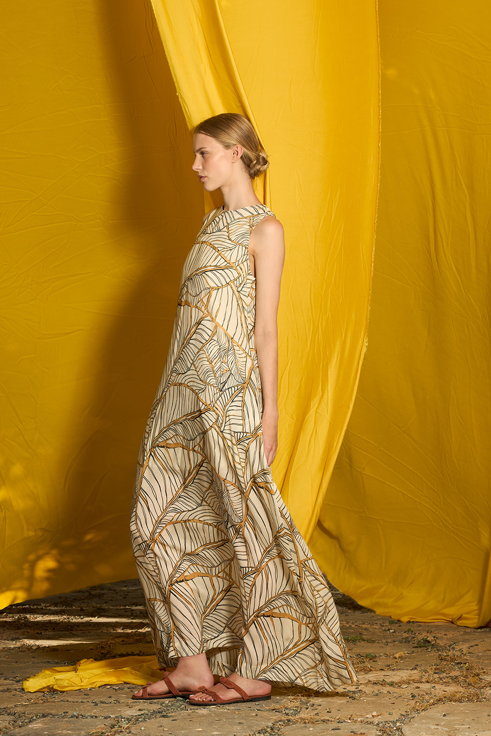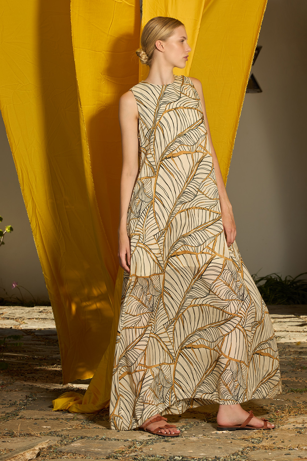 The Eryn Oak Maxi Dress is an A line sleeveless design made of tencel. The side pockets offer the hands some chilling while the round neckline that creates a keyhole on the back that closes with a button makes this dress the epitomy of endless summer.