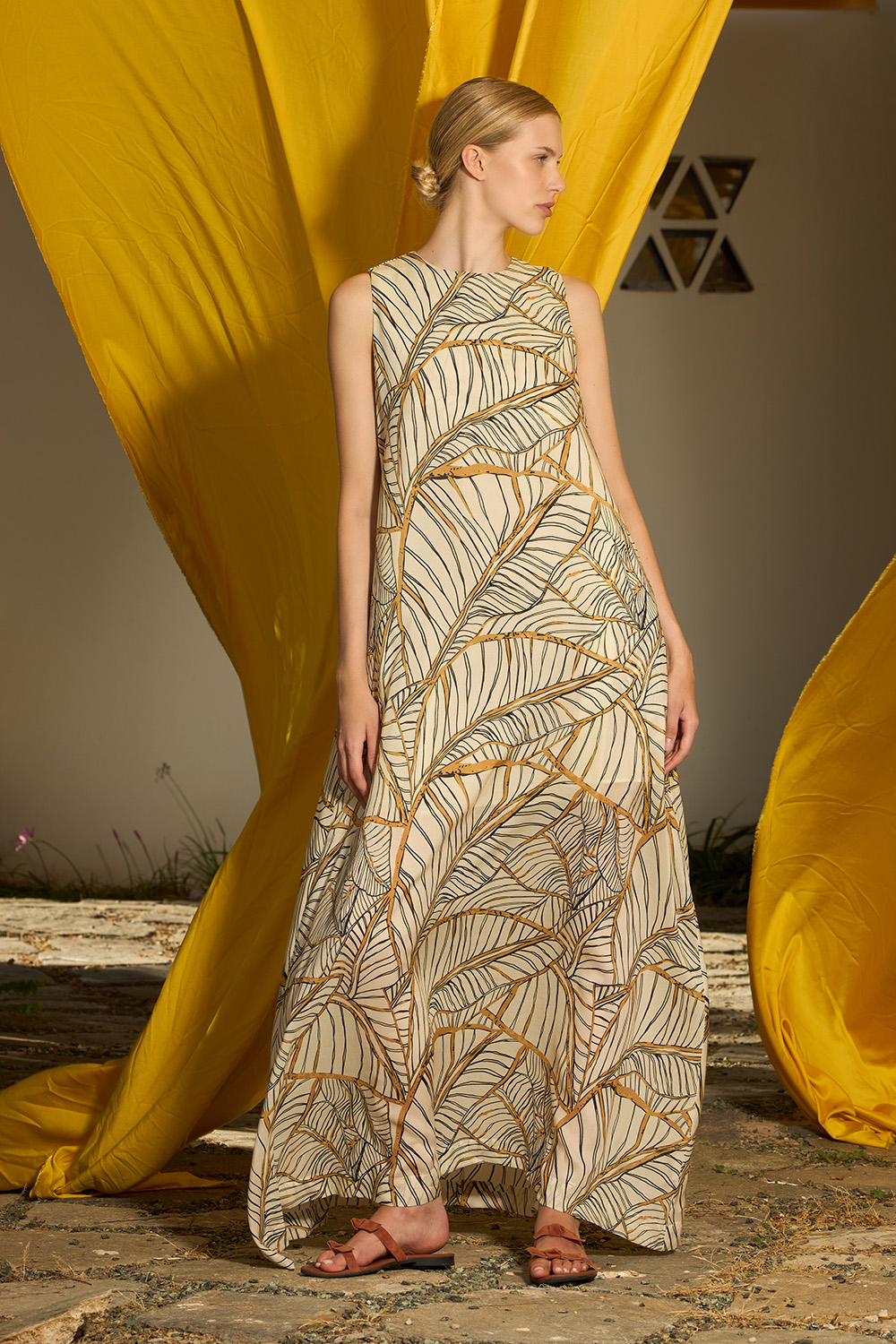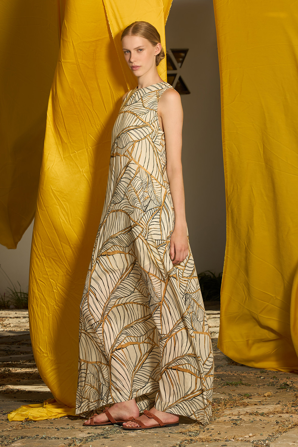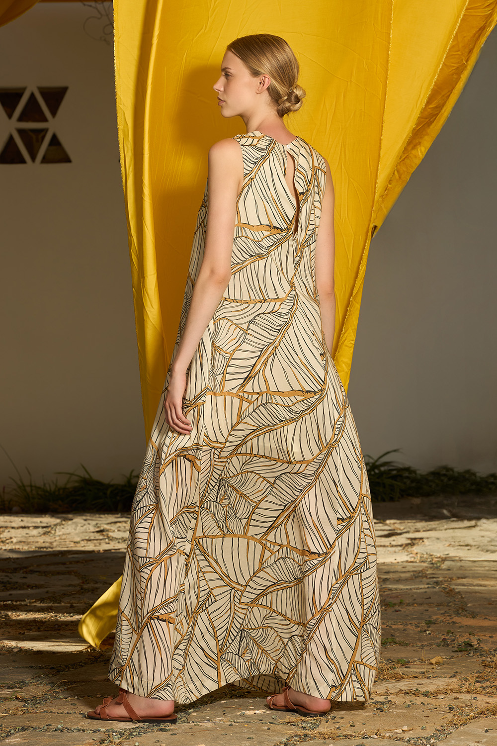 The Eryn Oak Maxi Dress is an A line sleeveless design made of tencel. The side pockets offer the hands some chilling while the round neckline that creates a keyhole on the back that closes with a button makes this dress the epitomy of endless summer.