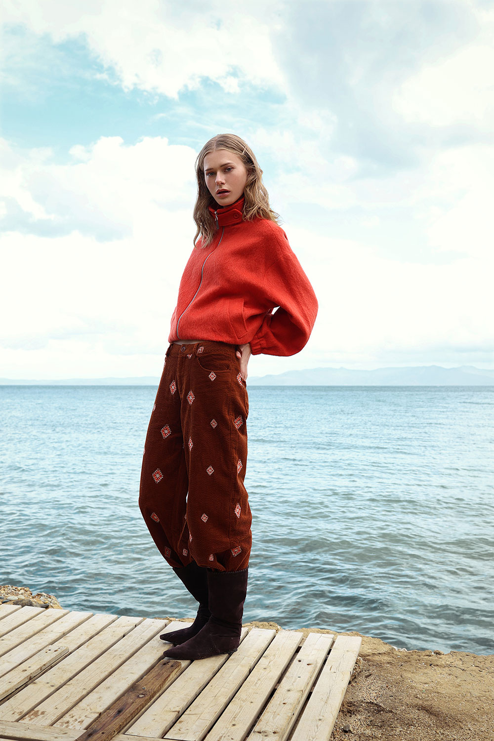 The jasmine pants are a practical yet elegant option for the winter. It has a warm brown color and an orange and white embroidery pattern that adds a bit of fun and whimsy. Its corduroy texture, wide legs and five pocket style will make you fall in love with it.