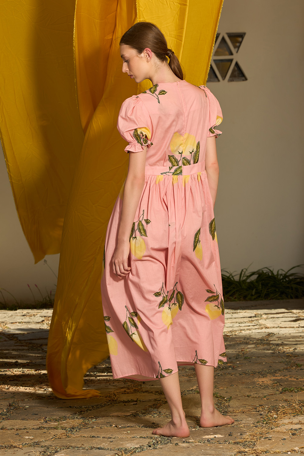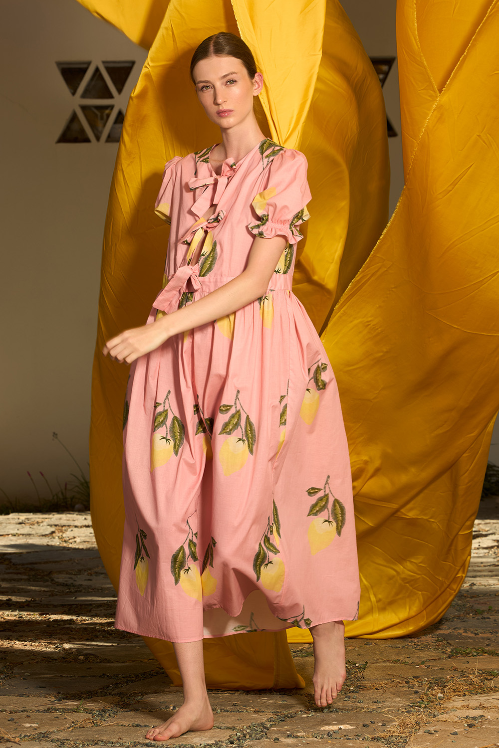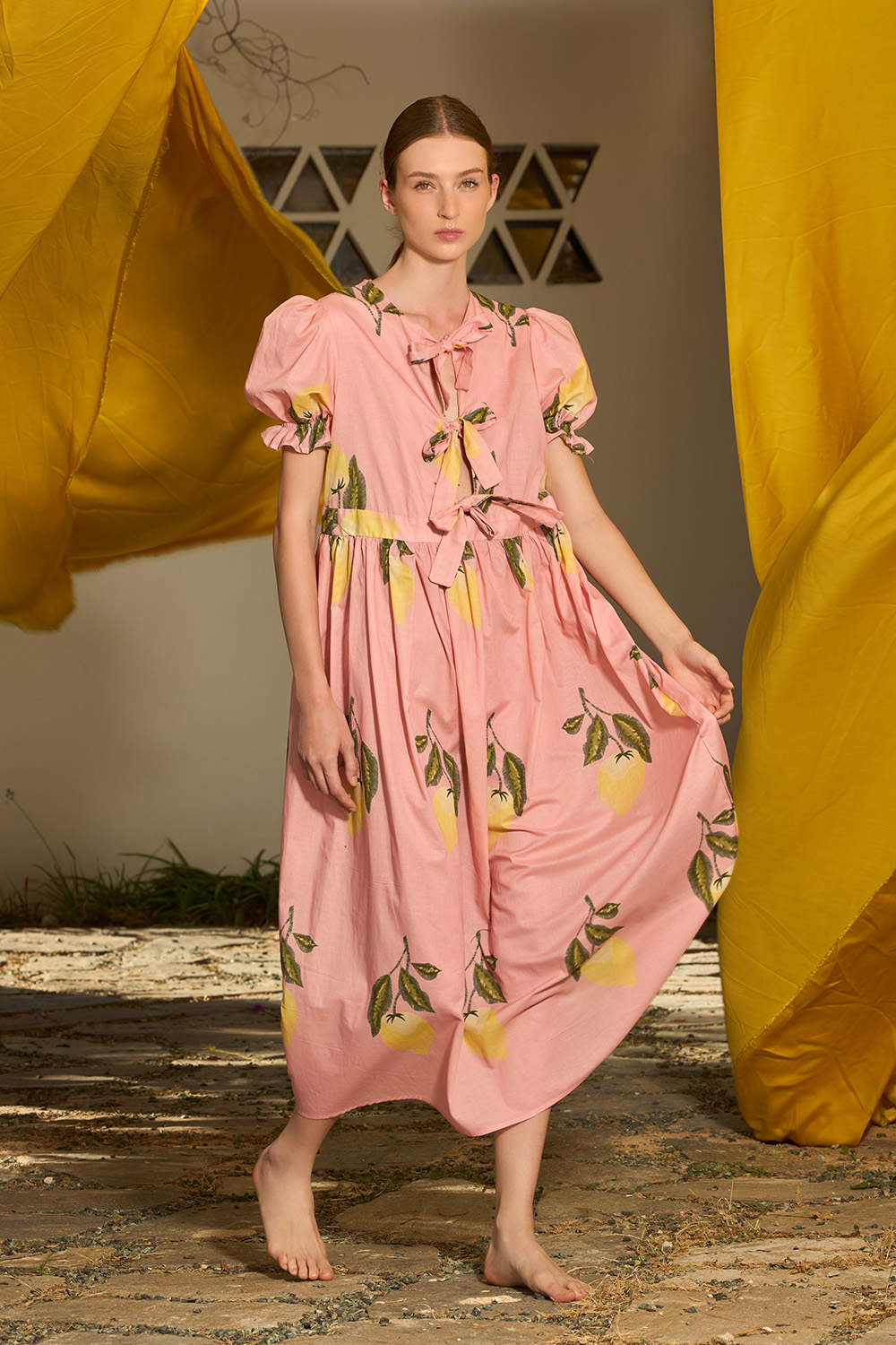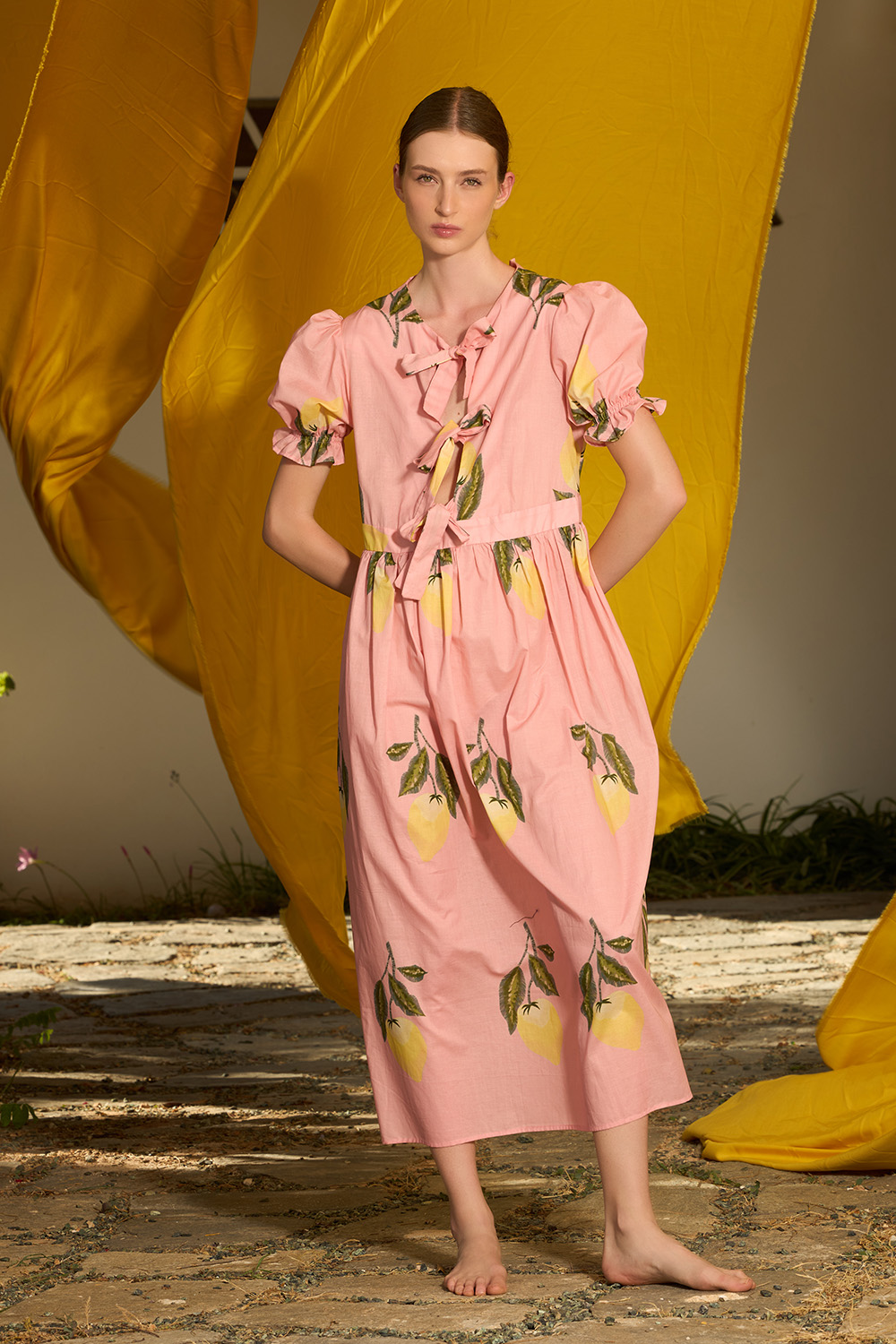 The Liam Dress is a beautiful midi piece made of cotton. Its print features the summerish inspiration of lemons. Its short puffy sleeves and string front closures that tie as cute bows that go up to the waist showing part of the sternum make it romantic yet daring.