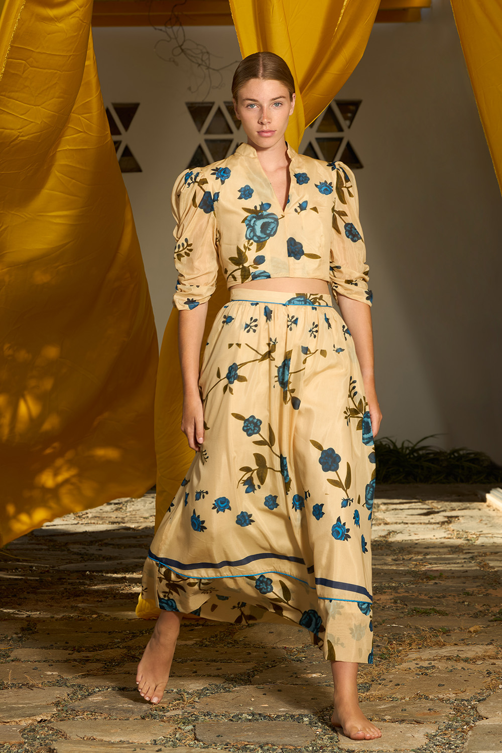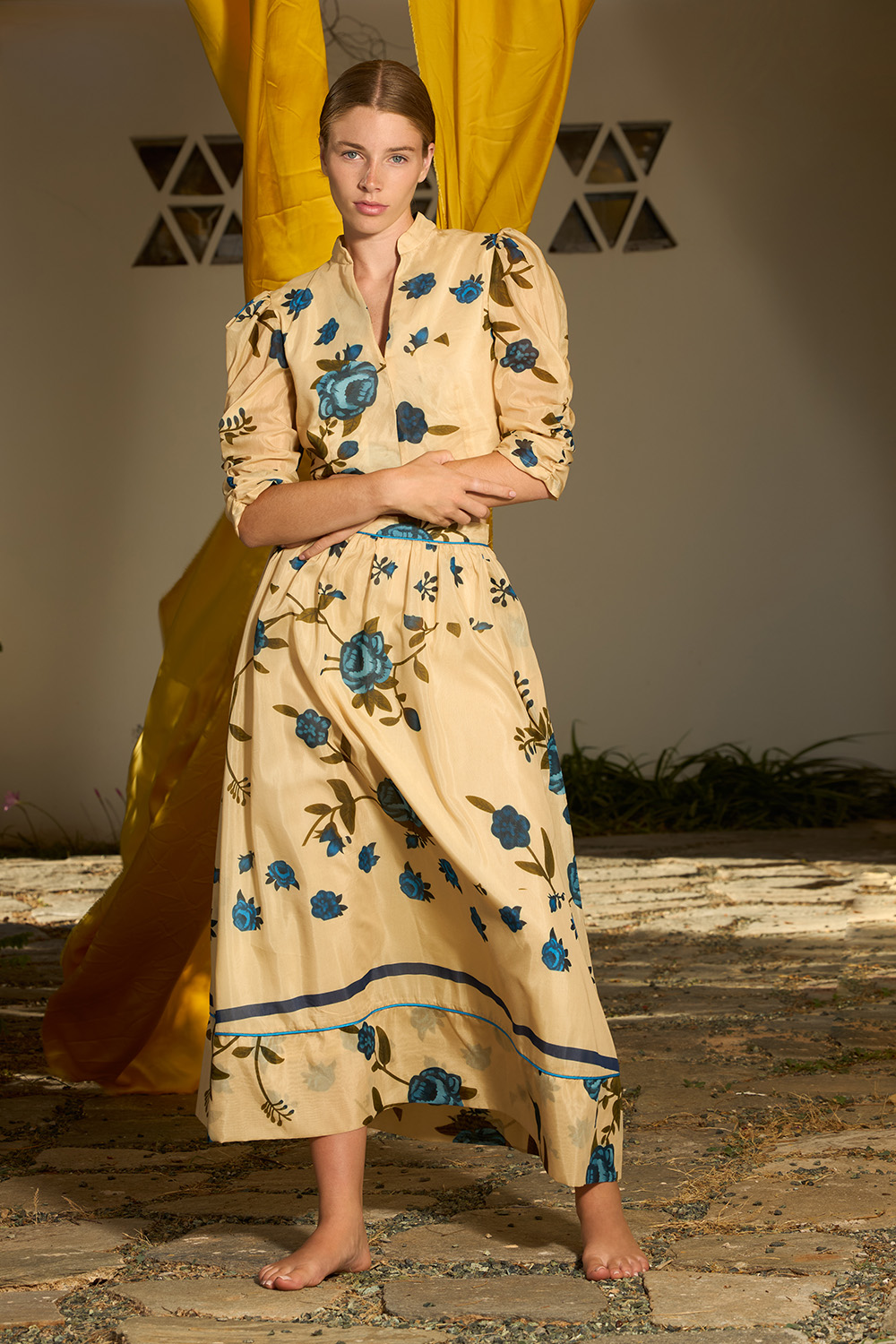 The Lucia Blue Skirt is a high waisted maxi skirt with delicate folds around the waist. The distinctive pipping around the waistband and the hem showcases the modern vibe of this chic design while the side pockets add even more coolness to this effortless look. The zipper on the back makes it very easy to wear this charming piece made of the fine combination of silk and cotton.
