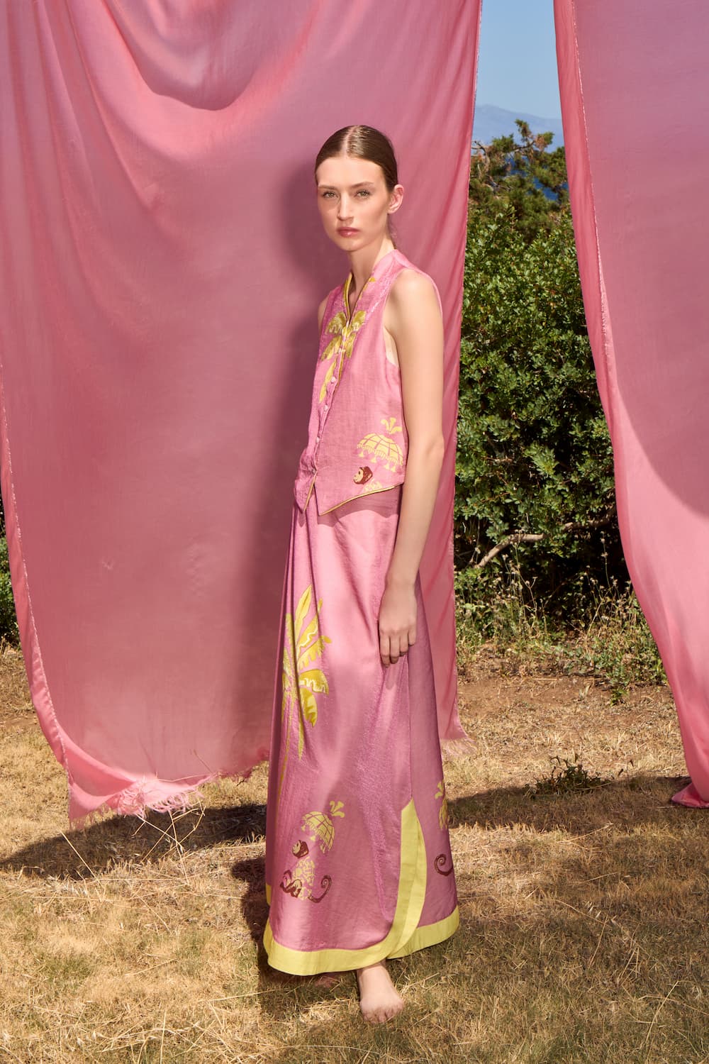 Mankey Pink Skirt is an elegant and artistic maxi skirt featuring a bold pattern. The high waist along with the round hem and the slits are creating an unforgettable image. Crafted from a unique combination of fabrics this skirt offers effortless movement and a sophisticated silhouette.