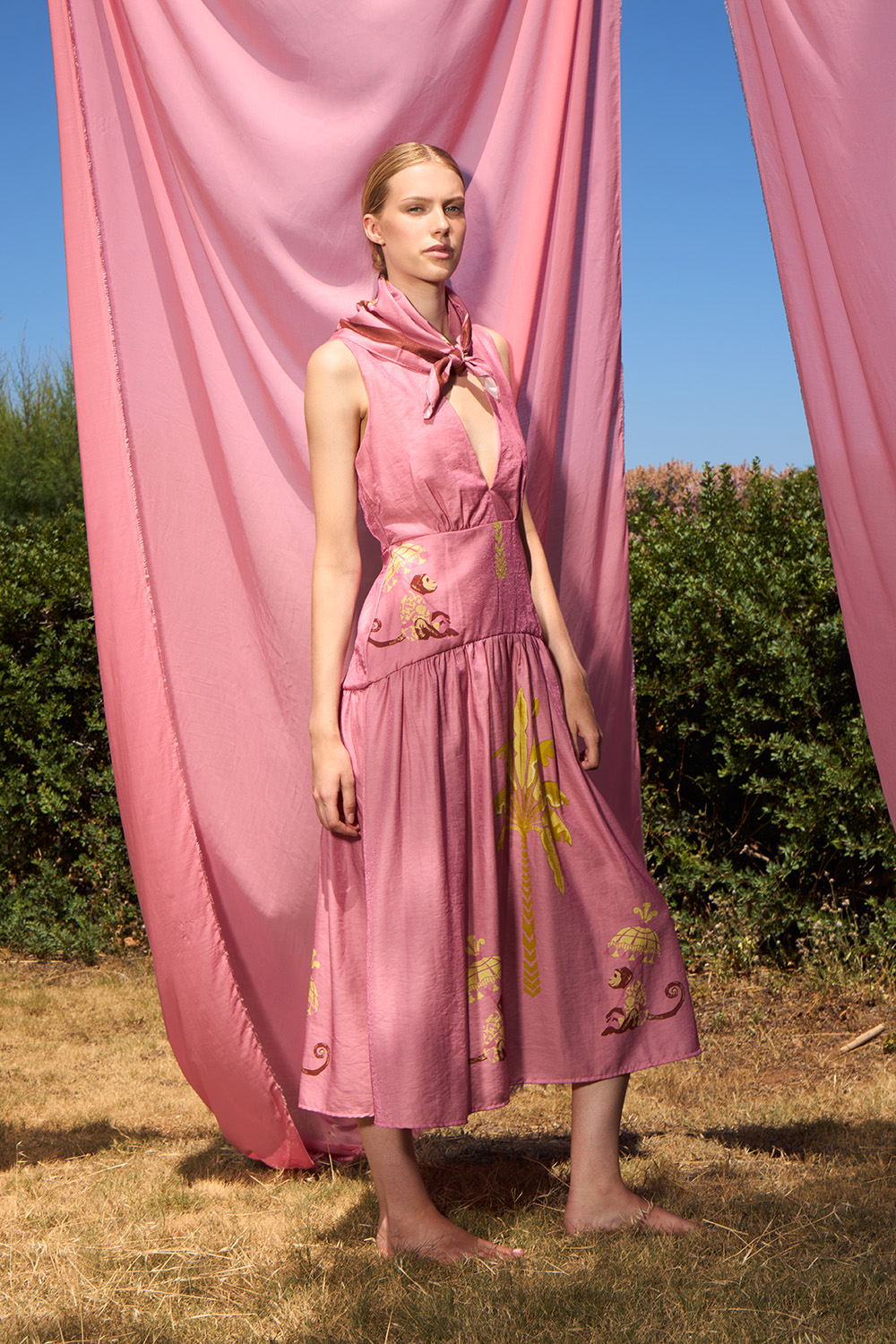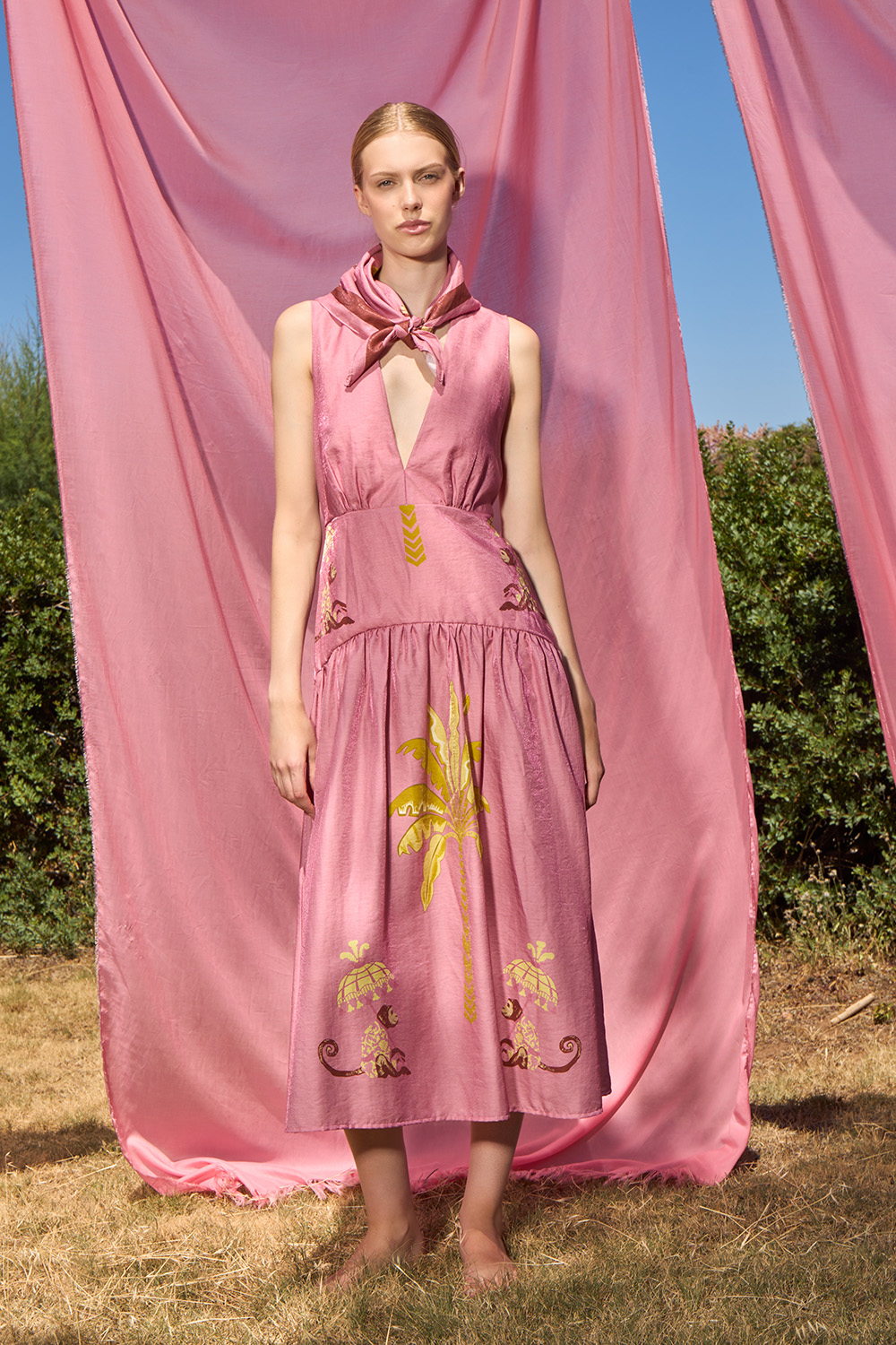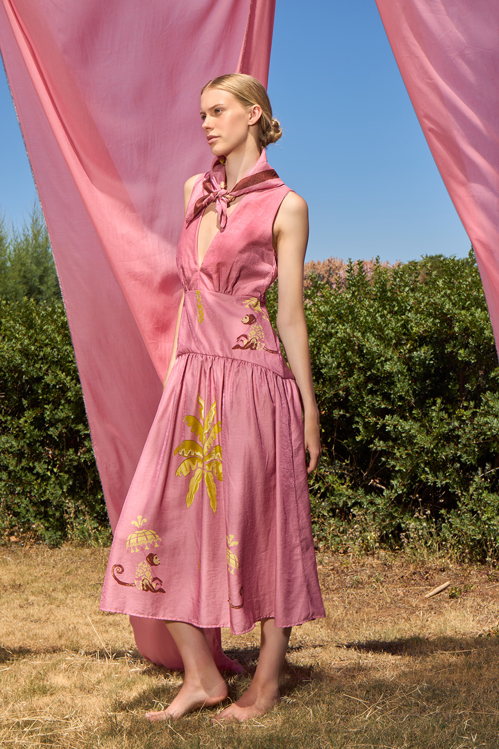 The Mankey Pink Dress is a slim fit sleeveless design full of charm. The deep V neckline along with the fitted waistband are creating an unforgettable feminine image. The frills on the bottom are offering some more charm to the airy bottom part that is generously giving away the romance of the summer era.