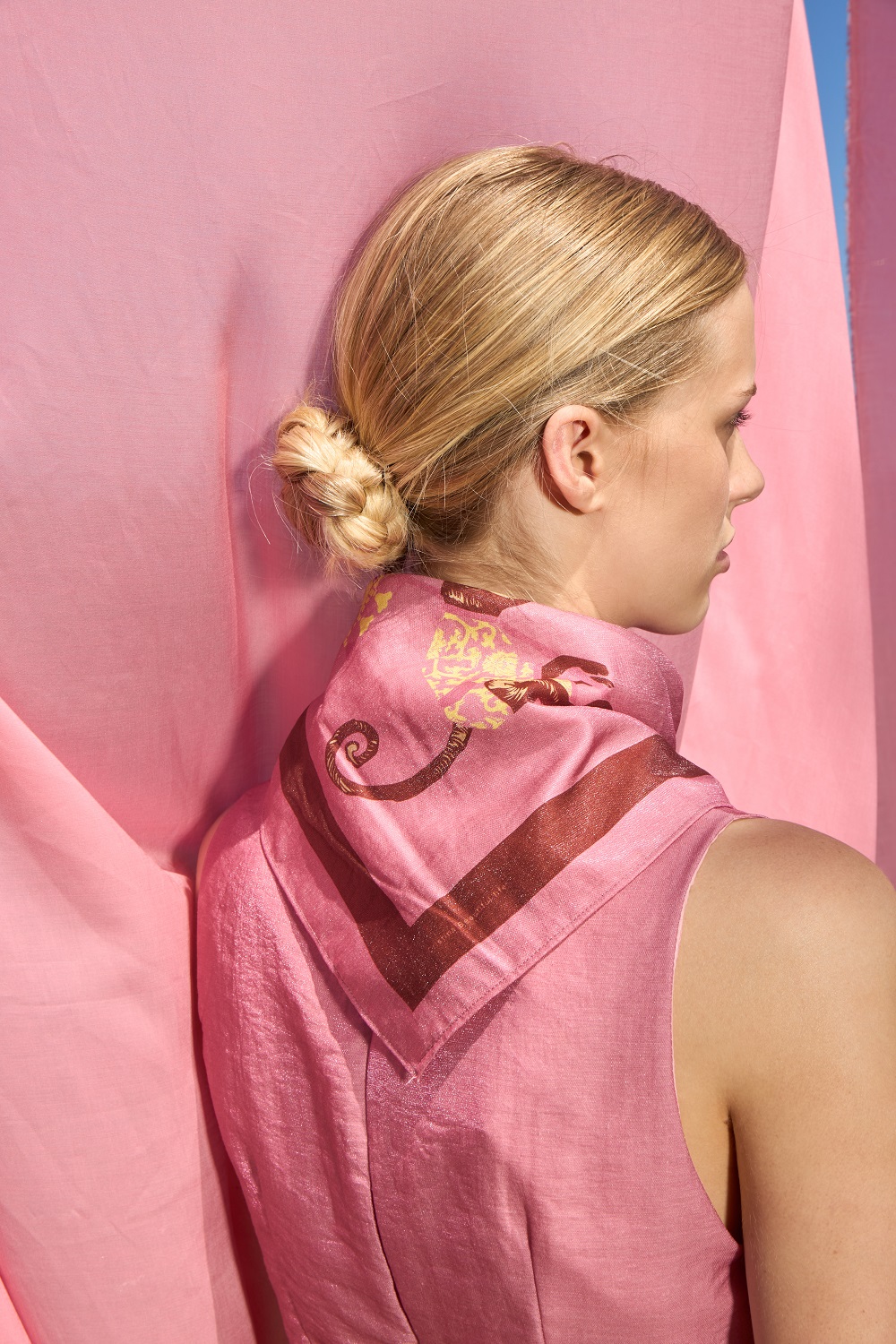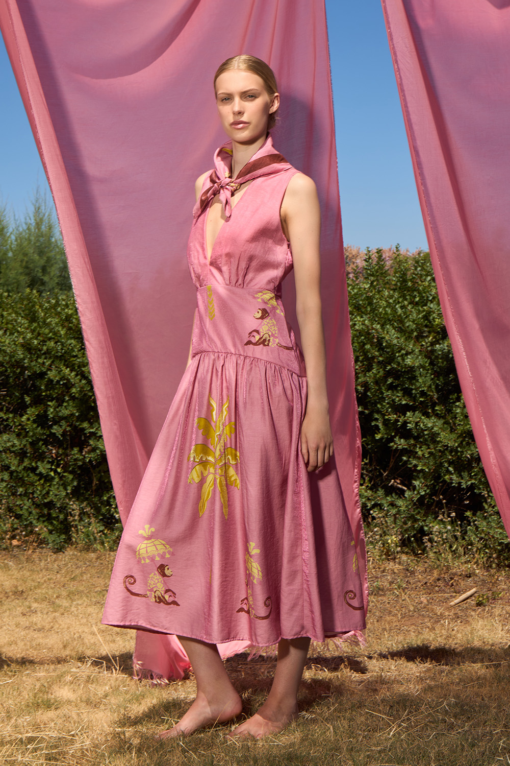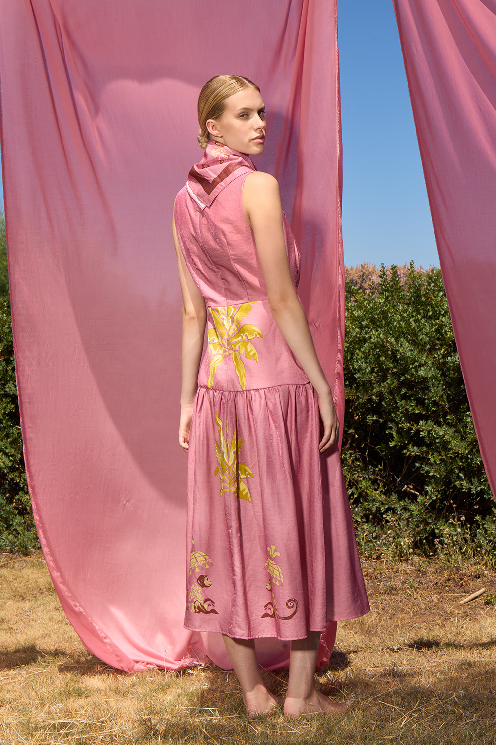 The Mankey Pink Dress is a slim fit sleeveless design full of charm. The deep V neckline along with the fitted waistband are creating an unforgettable feminine image. The frills on the bottom are offering some more charm to the airy bottom part that is generously giving away the romance of the summer era.