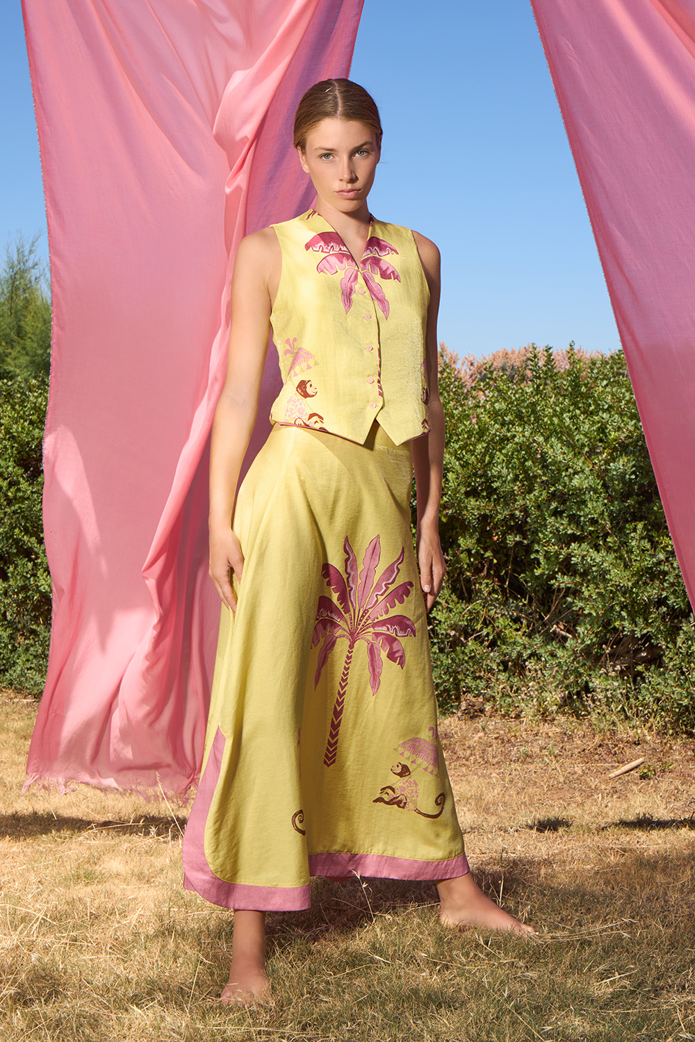 The Mankey Yellow Vest is an asymmetrical slim fit design full of charm. The distinctive buttons on the front along with the V neckline are creating an unforgettable image that is generously giving away the romance of the summer era.
