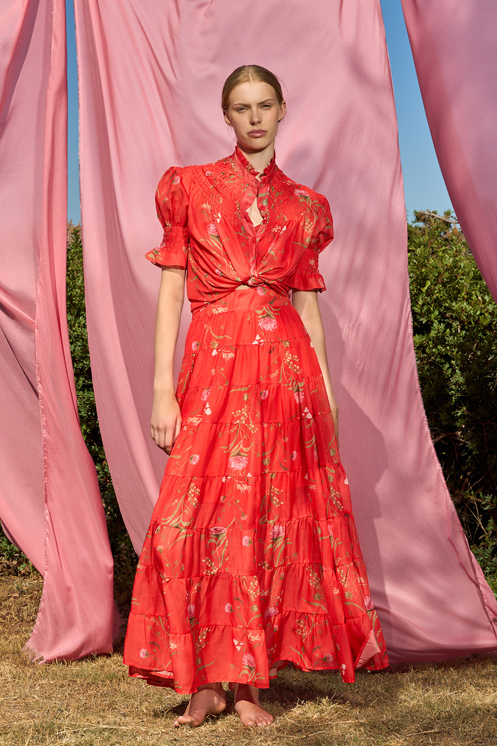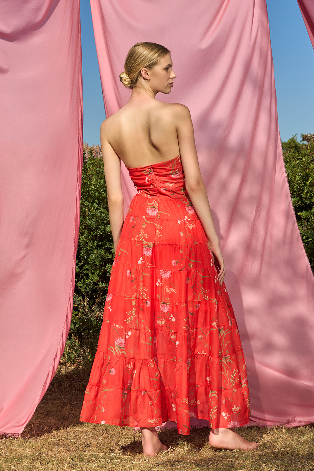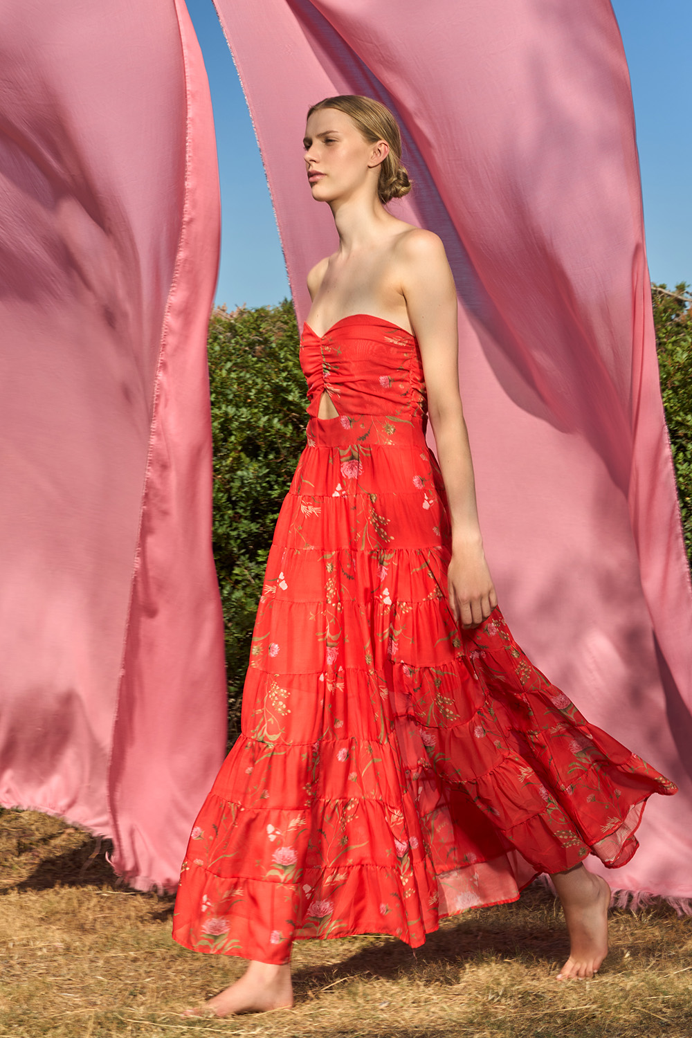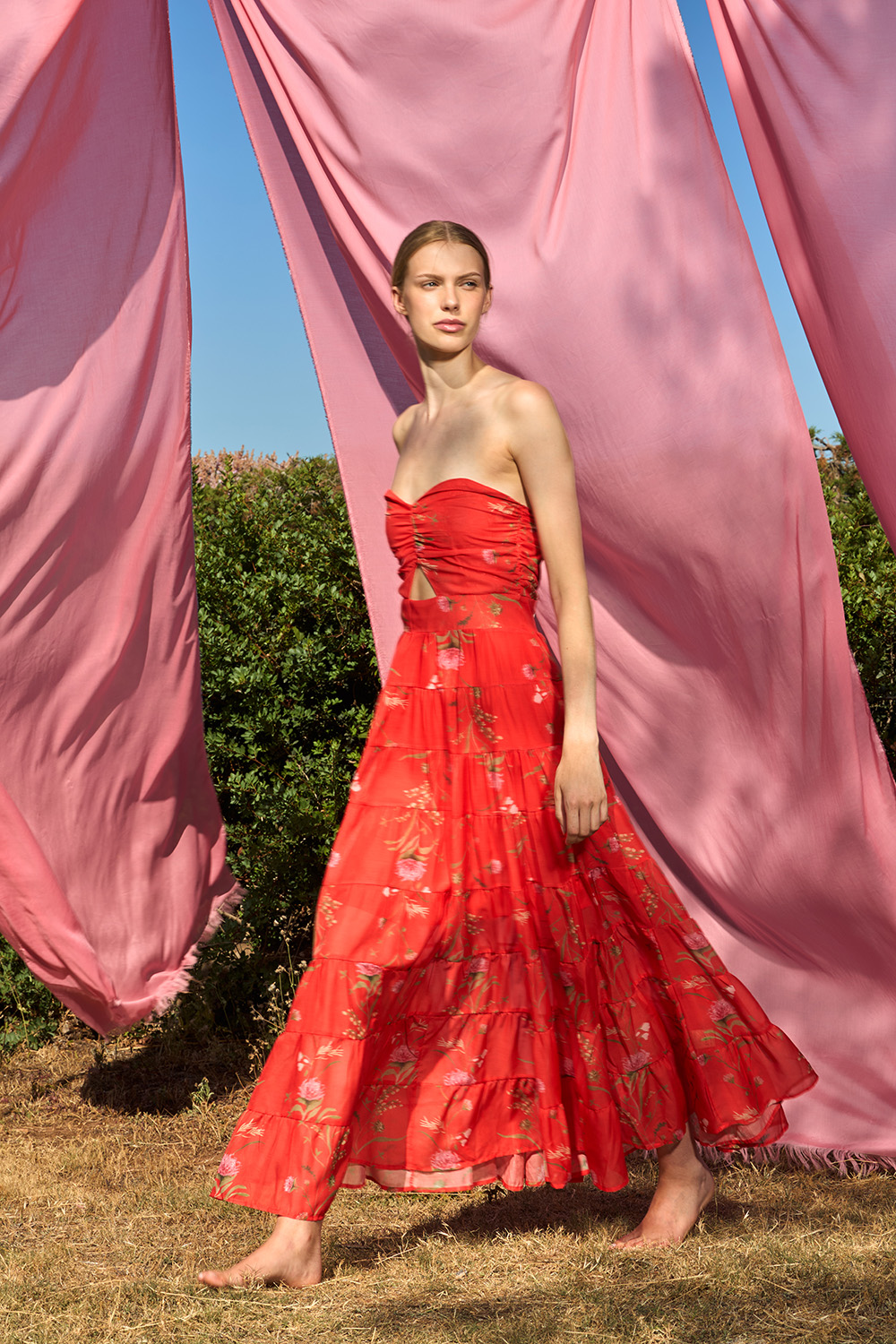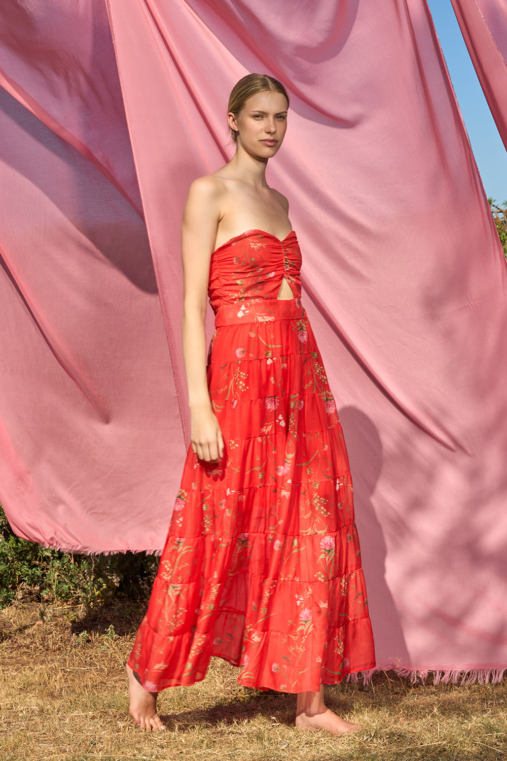 The Risty Red Dress is an exquisite strapless dress made of the fairest dreams. A combination of many symmetrical ruffles that generate the most charming steps. With a delicate cut right under the bust and a zipper on the center back this dress has a unique aura that you can easily transform depending on how you are going to use its belt.