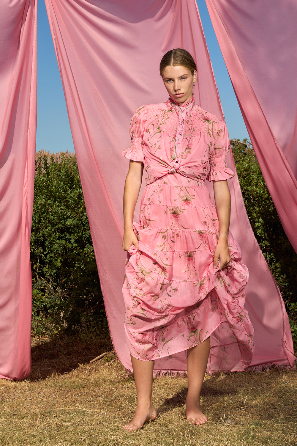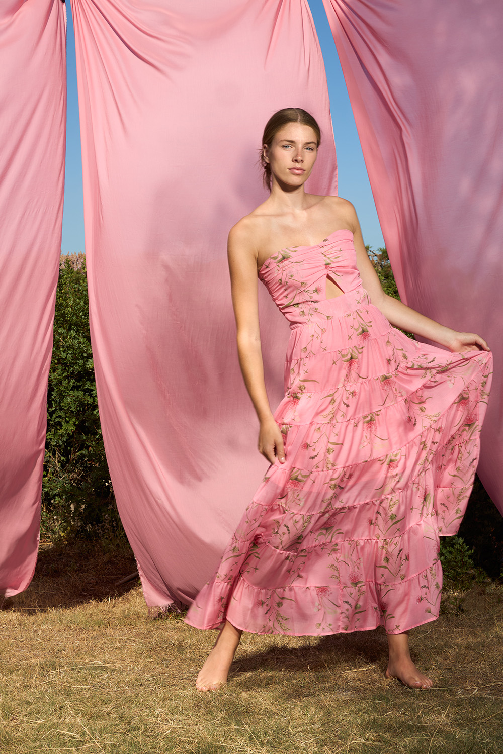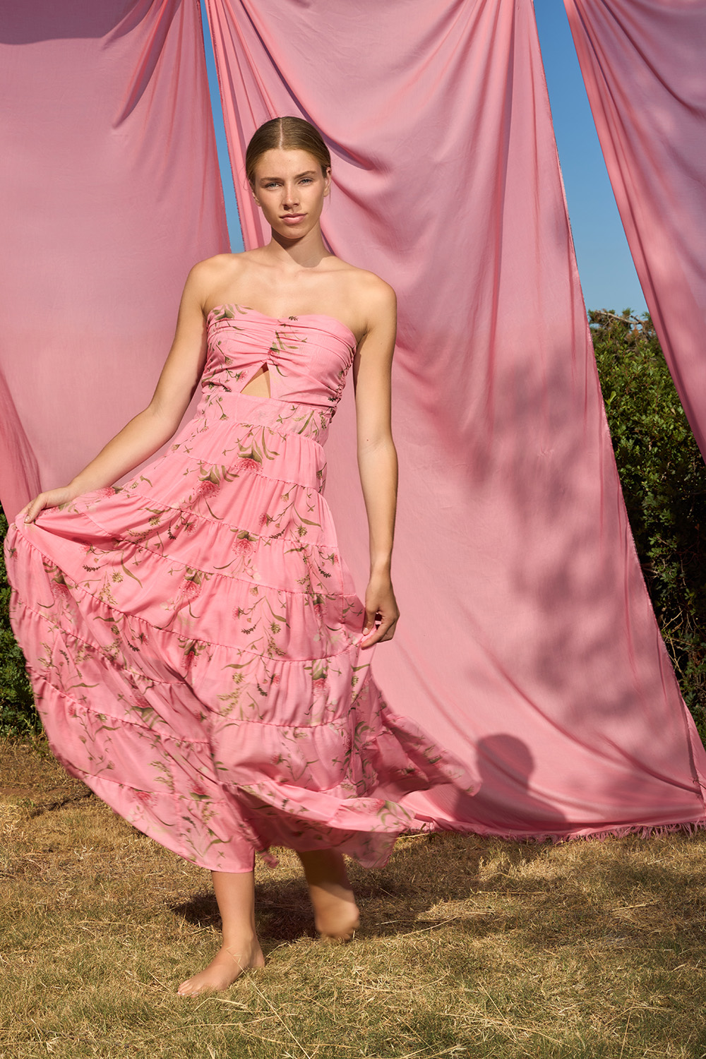 The Risty Pink Dress is an exquisite strapless dress made of the fairest dreams. A combination of many symmetrical ruffles that generate the most charming steps. With a delicate cut right under the bust and a zipper on the center back this dress has a unique aura that you can easily transform depending on how you are going to use its belt.