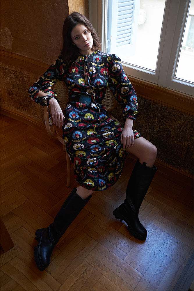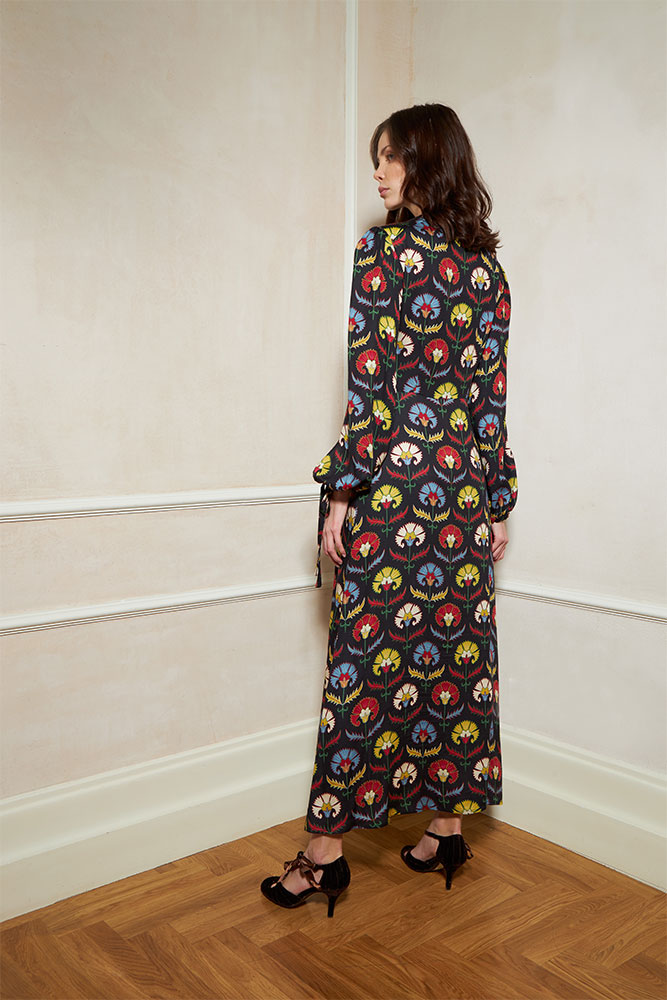 Long-sleeved dress with asymetrical waist, zipper on the side and ties on the neck and sleeves.