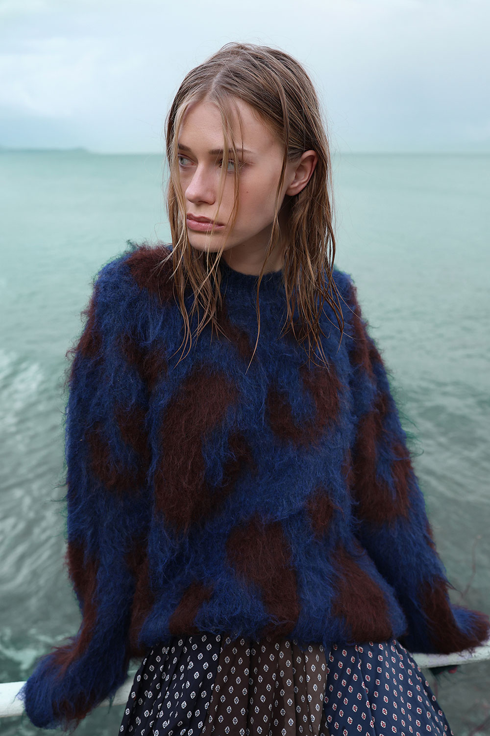 The SEPPIRE SWEATER is a fluffy woolen knit with an oversized fit and a wide neckline. It is navy blue with large deep chocolate abstract elements making it warm cozy yet interesting.