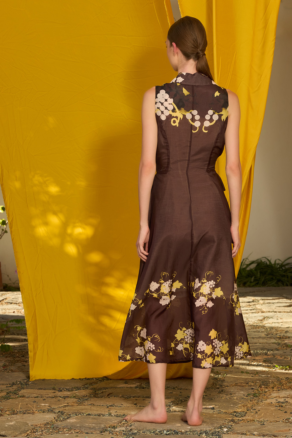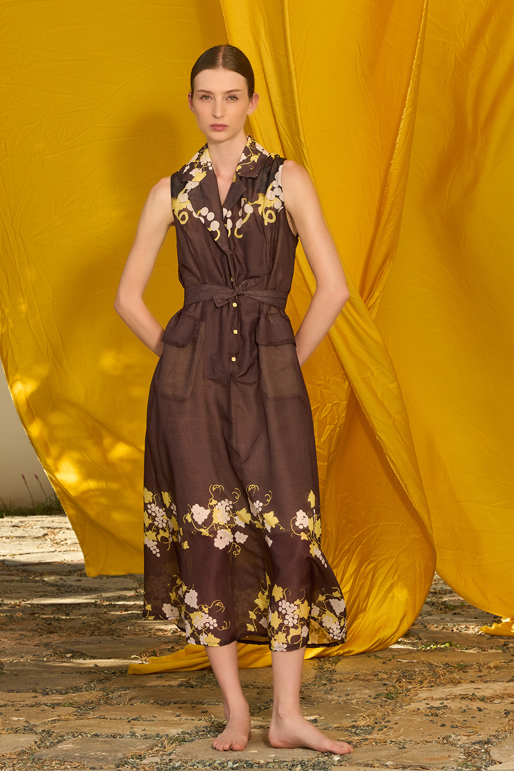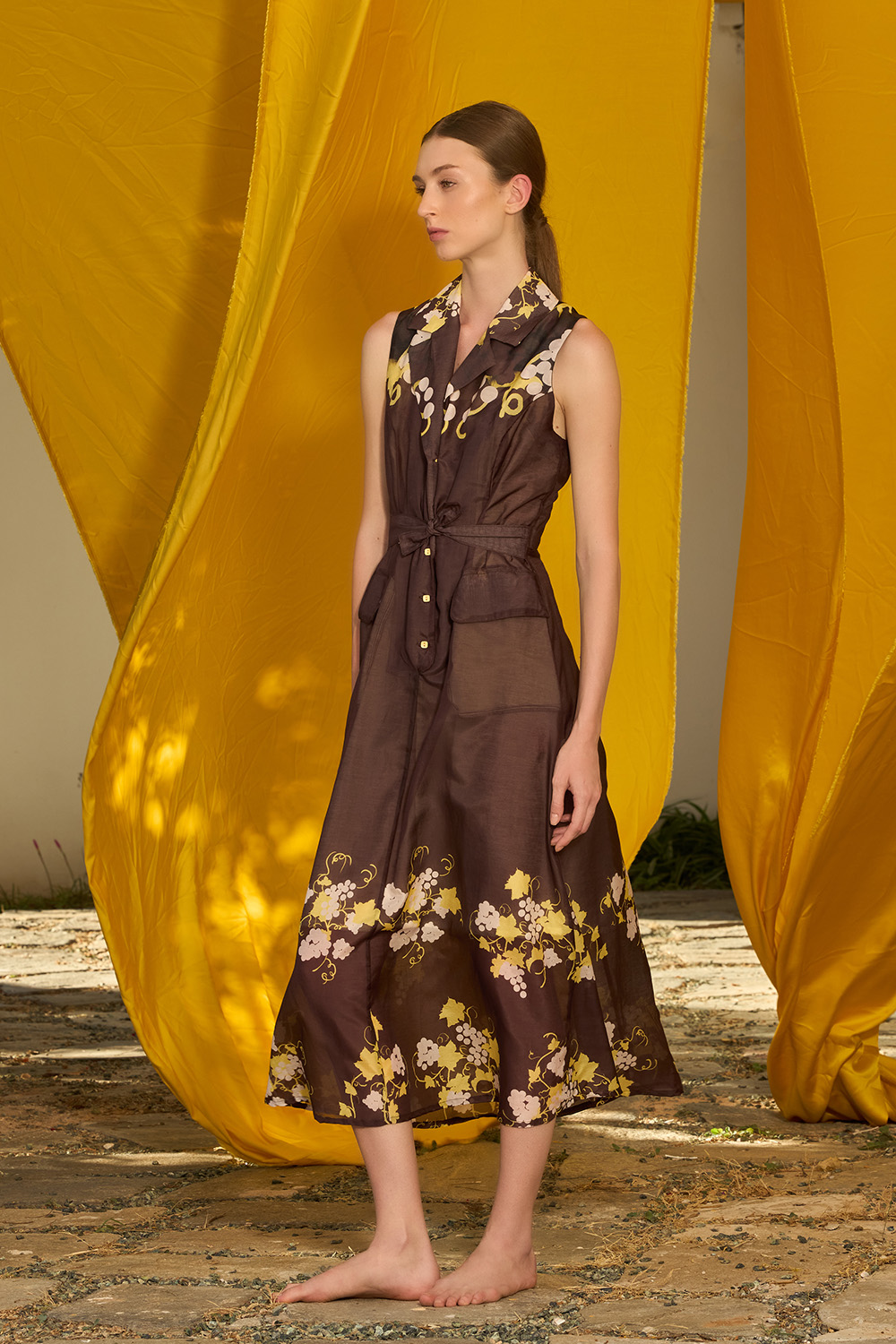 The Vinetbloom Chocolate Dress is a slim fit midi design full of charm and elegance. The distinctive notched collar and the buttons on the front showcase an effortless yet stylish appearance while the external large pockets on the front make this look even more fashionable. The belt allows a slimmer waist for a more feminine look with this silk and cotton dress.