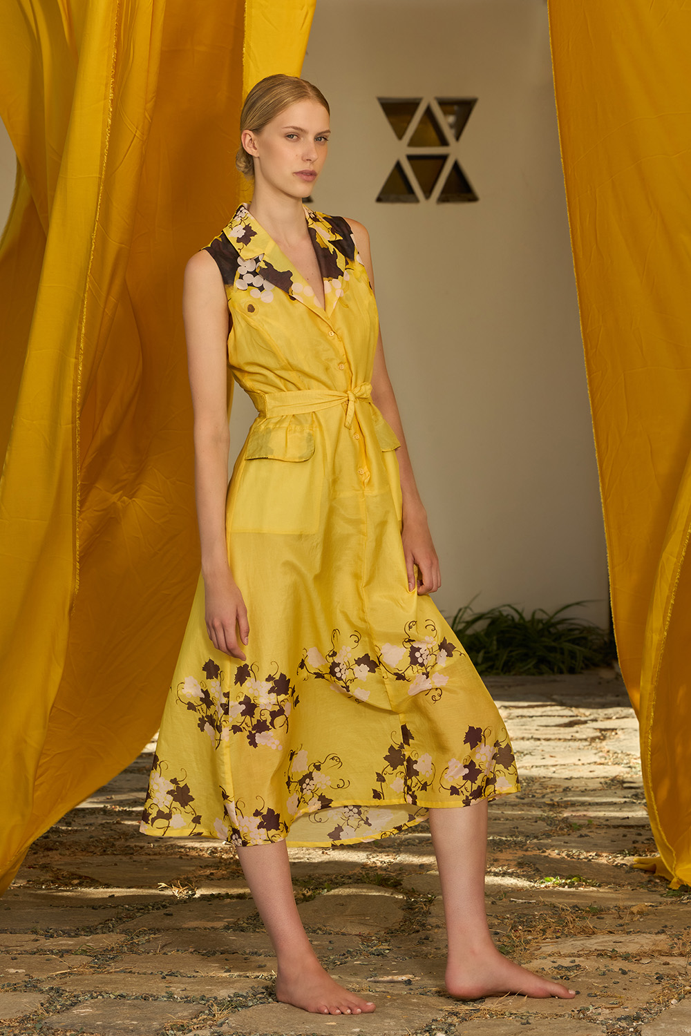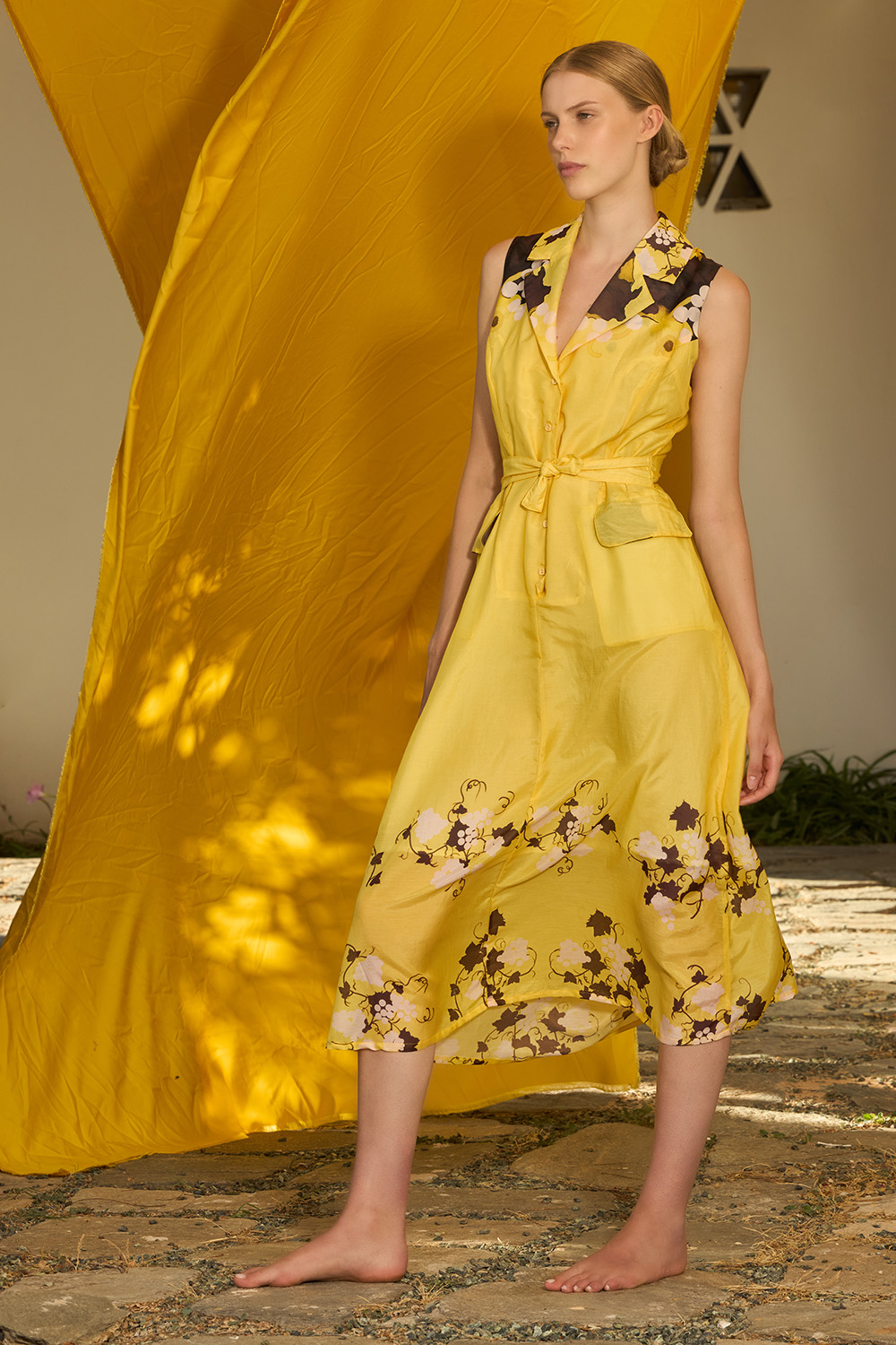 The Vinetbloom Yellow Dress is a slim fit midi design full of charm and elegance. The distinctive notched collar and the buttons on the front showcase an effortless yet stylish appearance while the external large pockets on the front make this look even more fashionable. The belt allows a slimmer waist for a more feminine look with this silk and cotton dress.