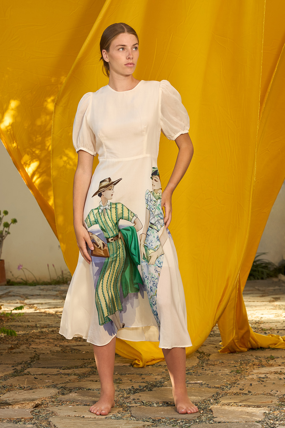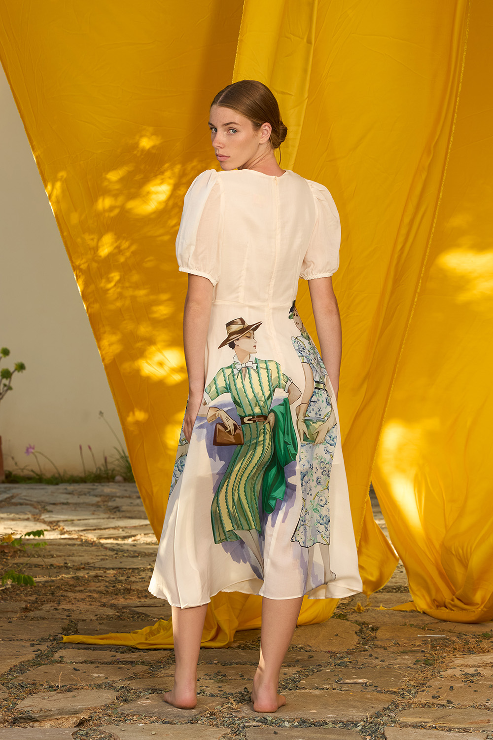 The Adela Dress is a sophisticated slim fit midi design full of charm. The short sleeves are having a small elasticated band on the hem that allows them to have volume while the airy bottom with the so unique pattern gives away summer an endearing meaning. The zipper on the back allows this piece to have the perfect adjustment.