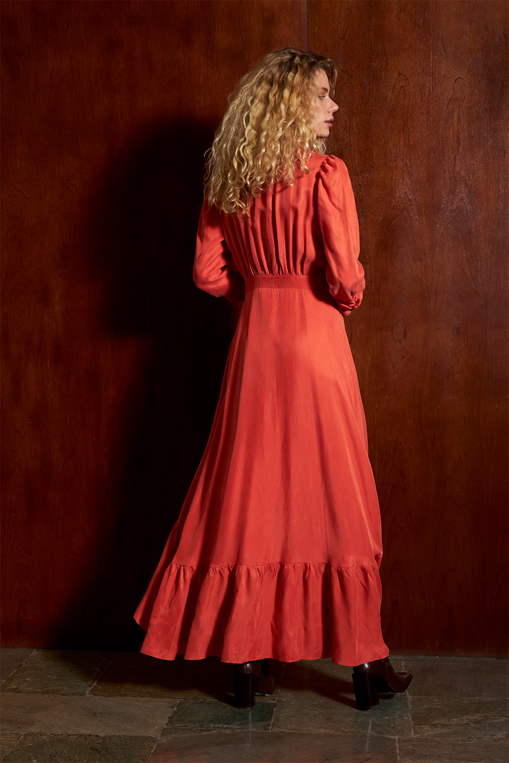 long, occasion dress with an assymetrical cut and frill finishing.