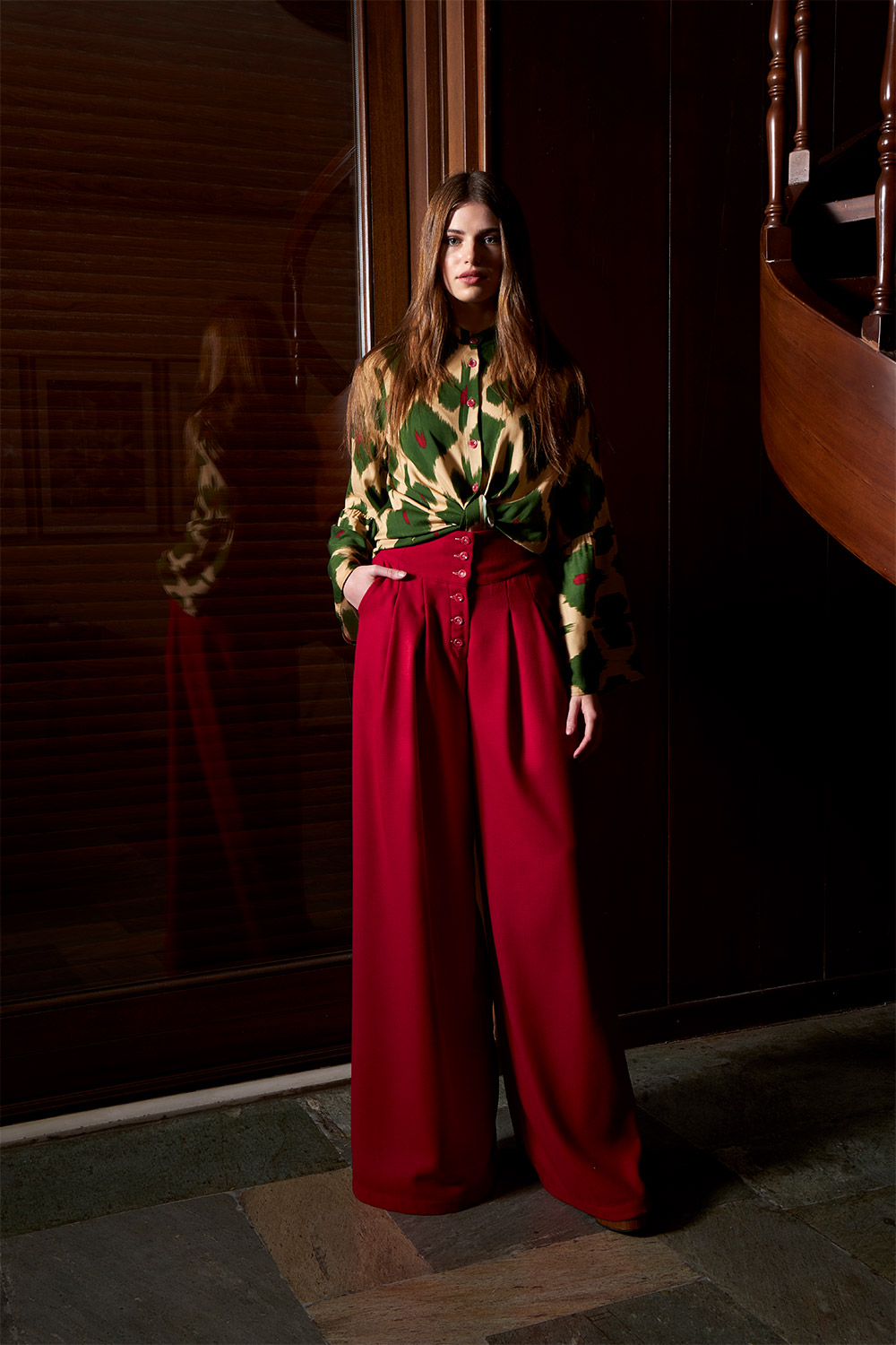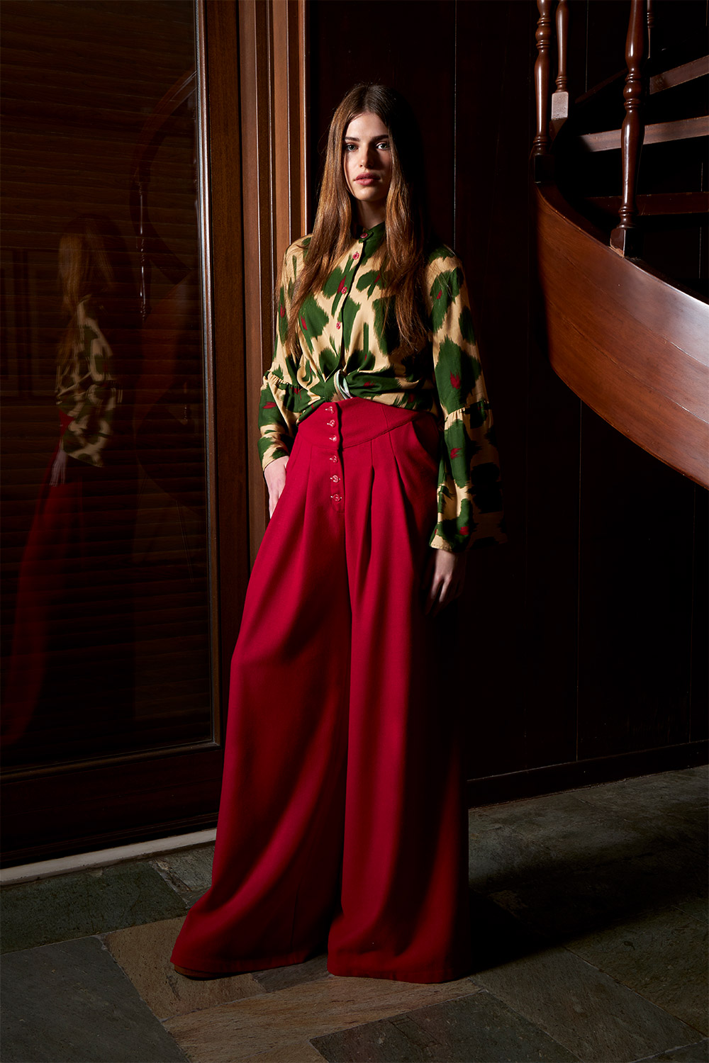 loose fitted shirt with coloured buttons and long frilled sleeves.