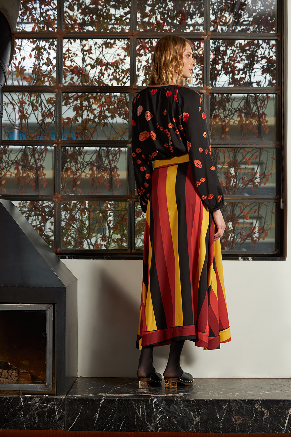 Maxi skirt with diagnonal stripes and a zipper in one side. With a piping around the waist and at the end.