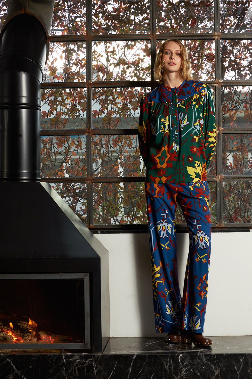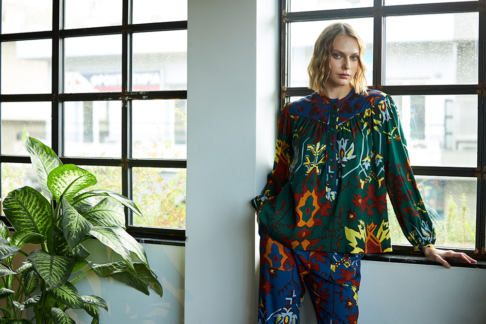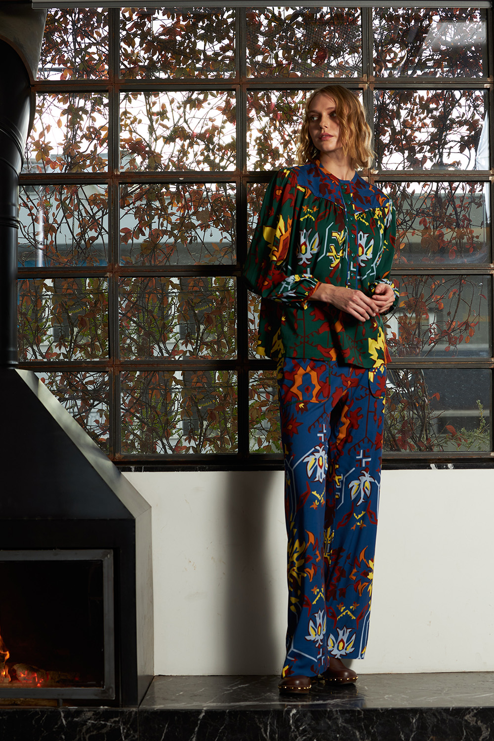 Regular fit shirt with a shoulder blade in a different colour and frills around it and around the end of the sleeve.