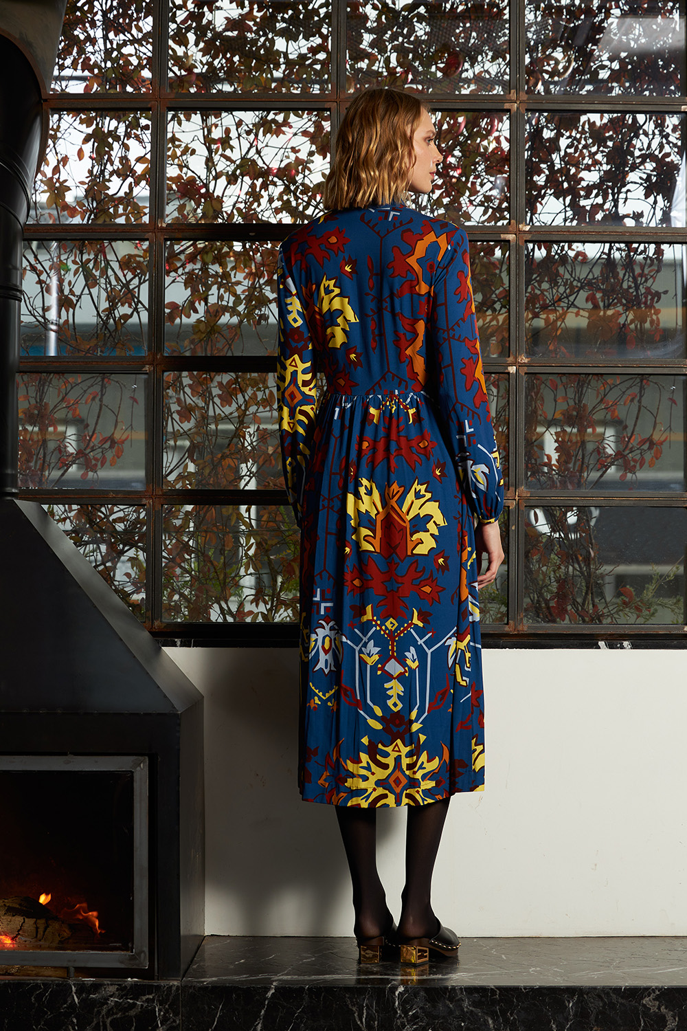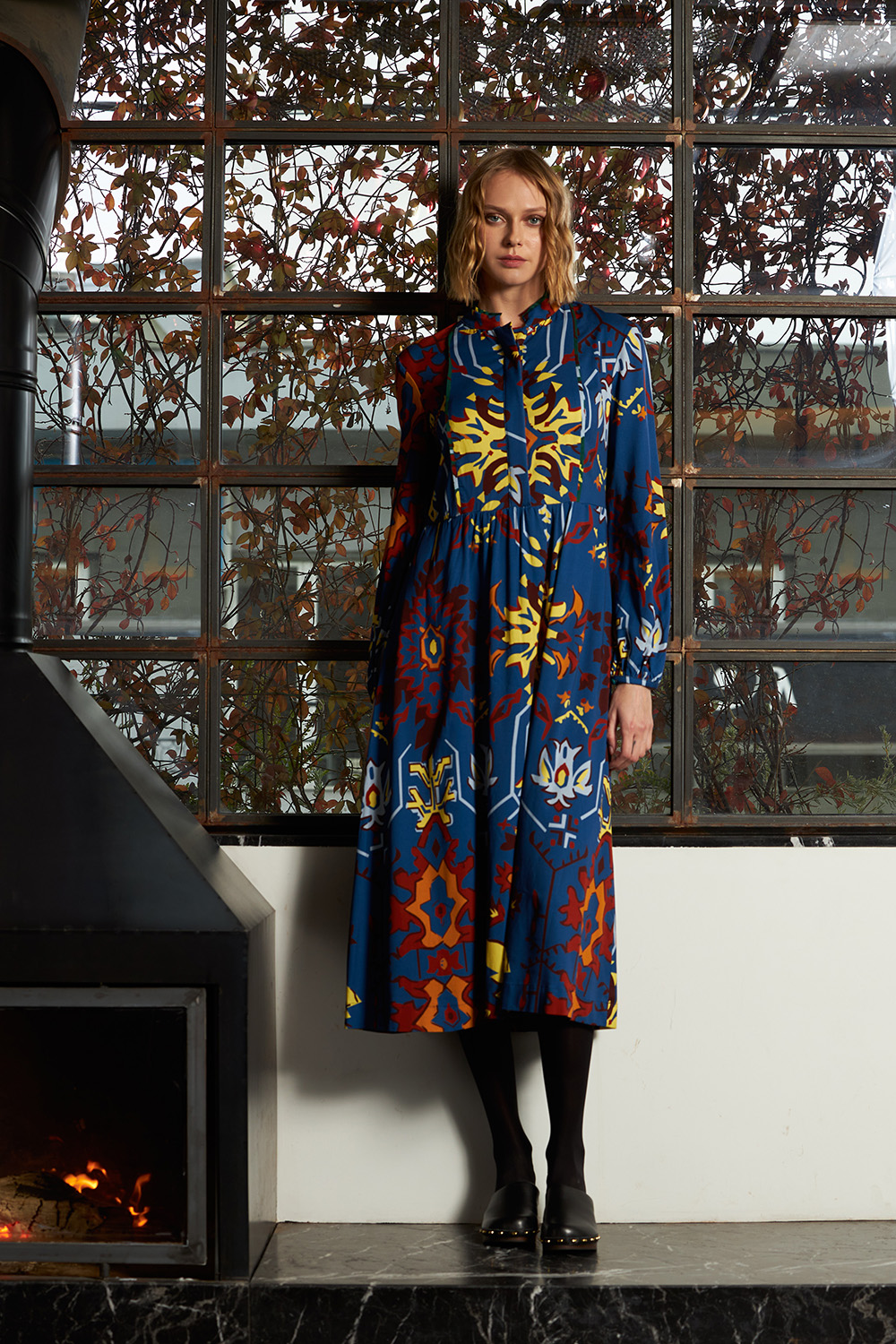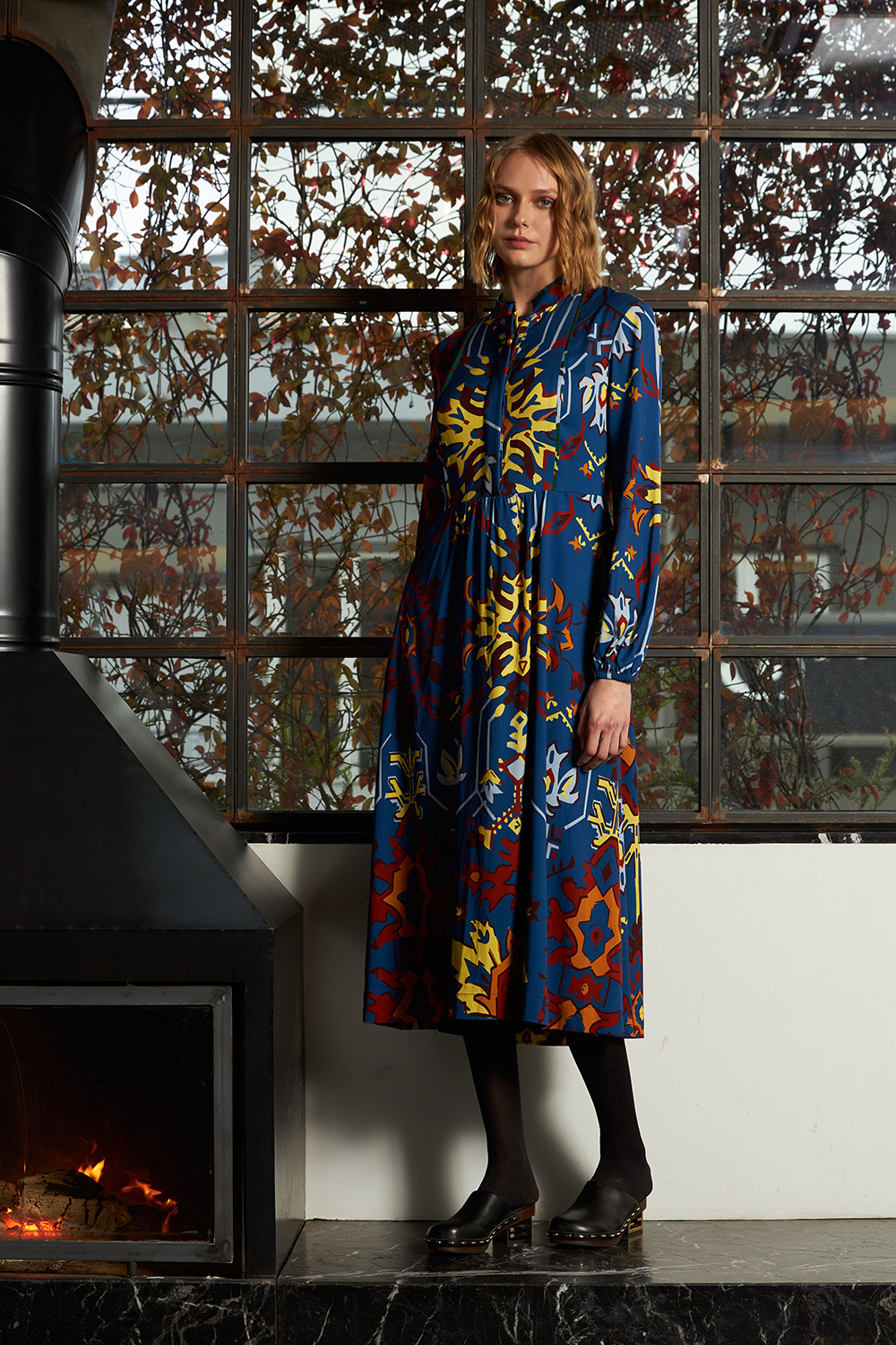 Midi dress with long sleeves, side pockets and a stand collar. With a hidden placket on the front, frills around the waist and at the end of the sleeve.