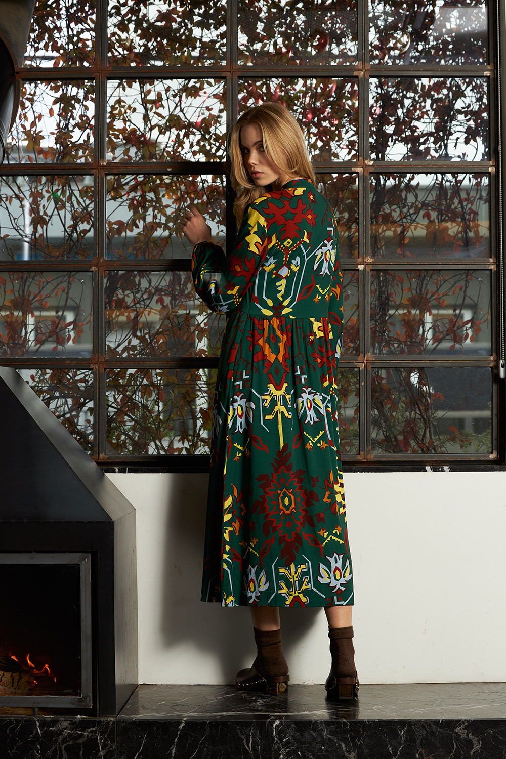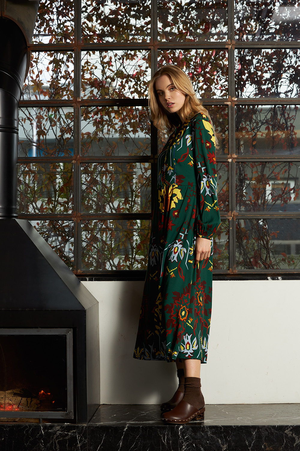 Midi dress with long sleeves, side pockets and a stand collar. With a hidden placket on the front, frills around the waist and at the end of the sleeve.