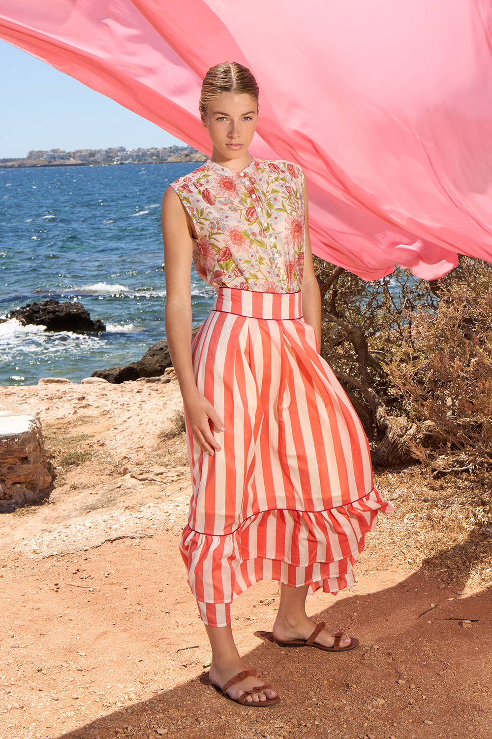 The Antheia Pink Skirt is a slim fit high waisted piece made for a unique appearance. The maxi length along with the large waistband and the playful ruffles at the end are giving away the most delightful vibes. The zipper on the center back offers the perfect adjustment.