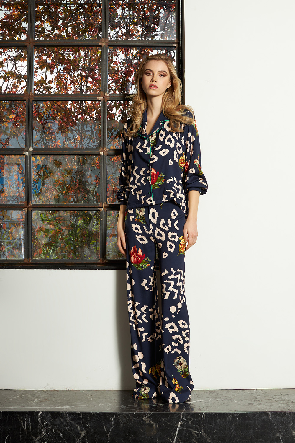 High waist pants with wide legs. With a button and a zipper on the front as well as with a distinctive piping around the waist.