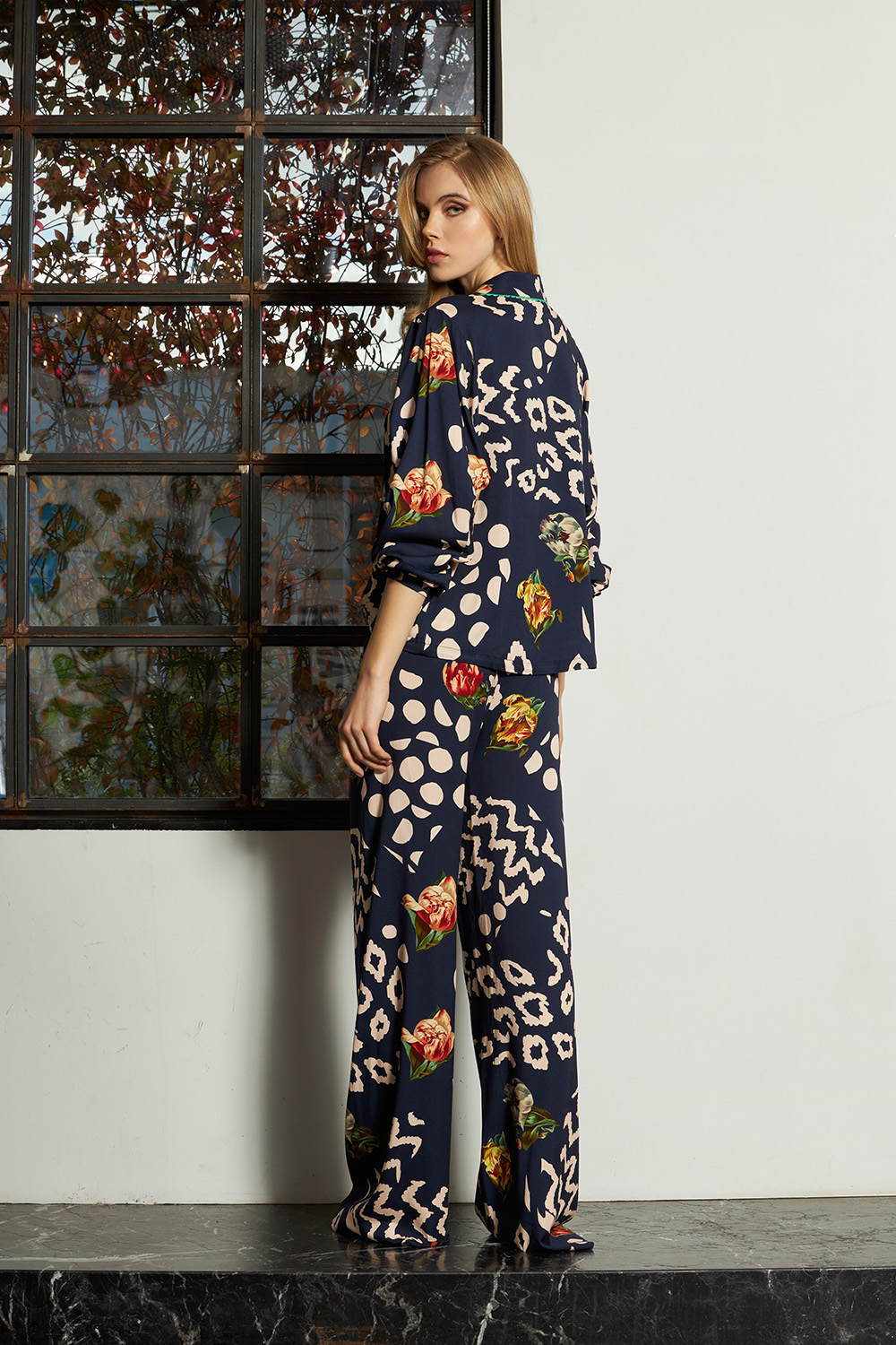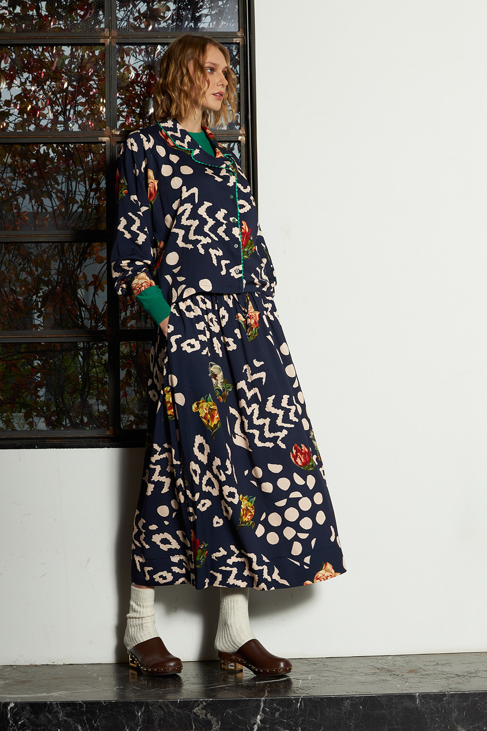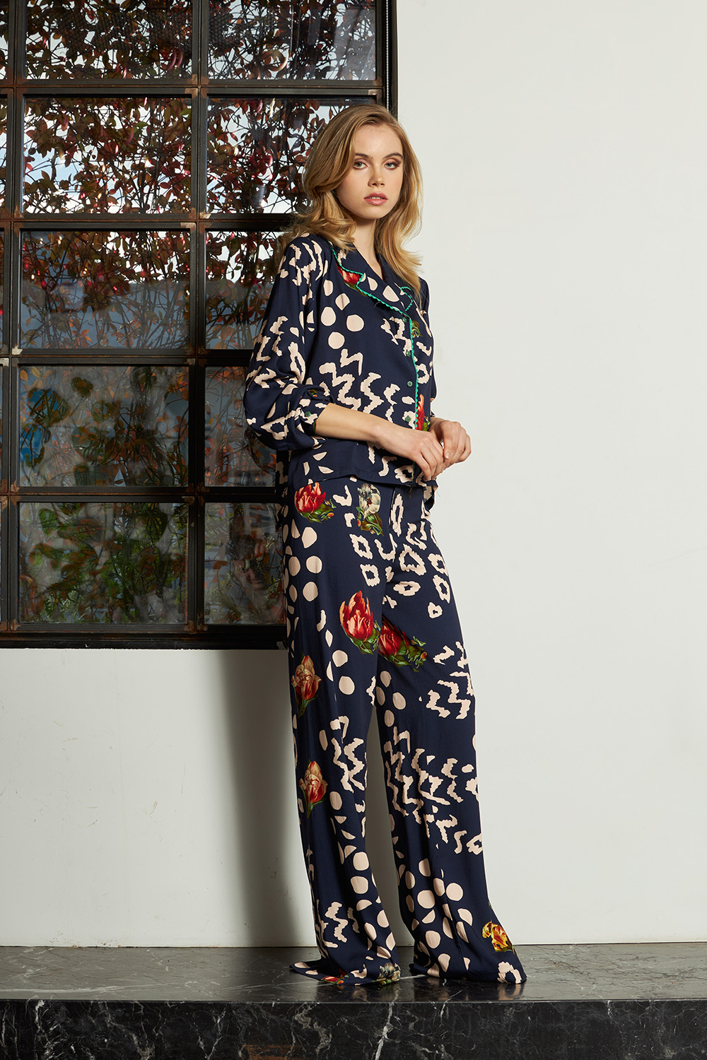 Bat sleeve shirt with a notched collar that has a distinctive piping around it and on the placket.