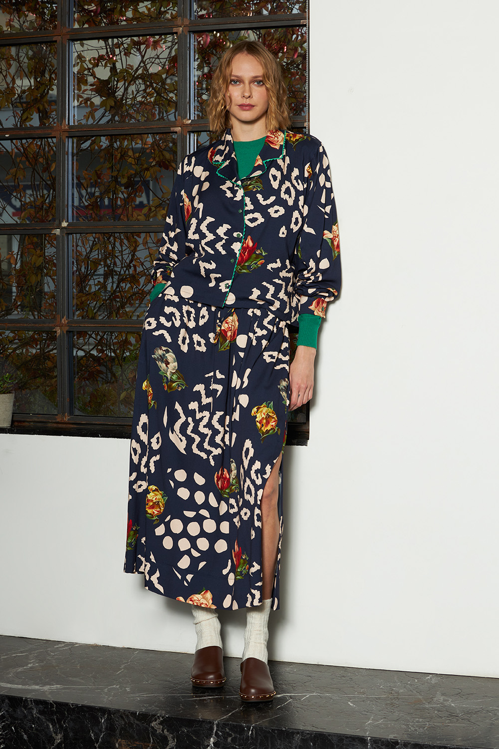 Midi skirt with an opening in one side. The waist is elasticated and it has strings that allow you to adjust it on your body.