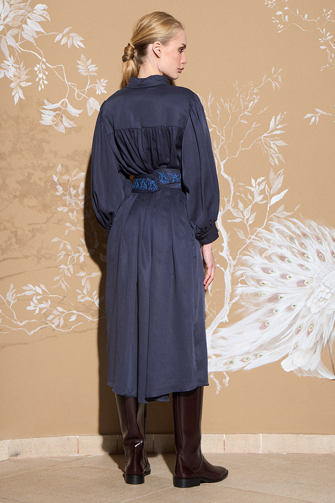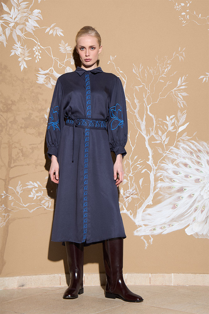 The Divina Embroidery Blue Dress is your call to start living into this season. This absolute regular fit dress with the so unique large bishop sleeves and the classic collar showcases all the beauty winter can hide. The embroidery to the sleeves and to the hidden placket on the center front takes this endearing piece to another level of beauty. There is also a belt with embroidery too that helps you transform your silhouette. The small slits on both sides offer an even easier walk while the side pockets will make sure that your hands will take a break.