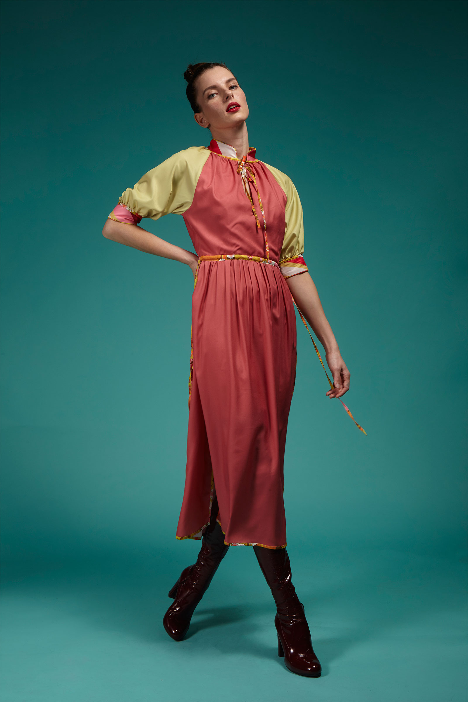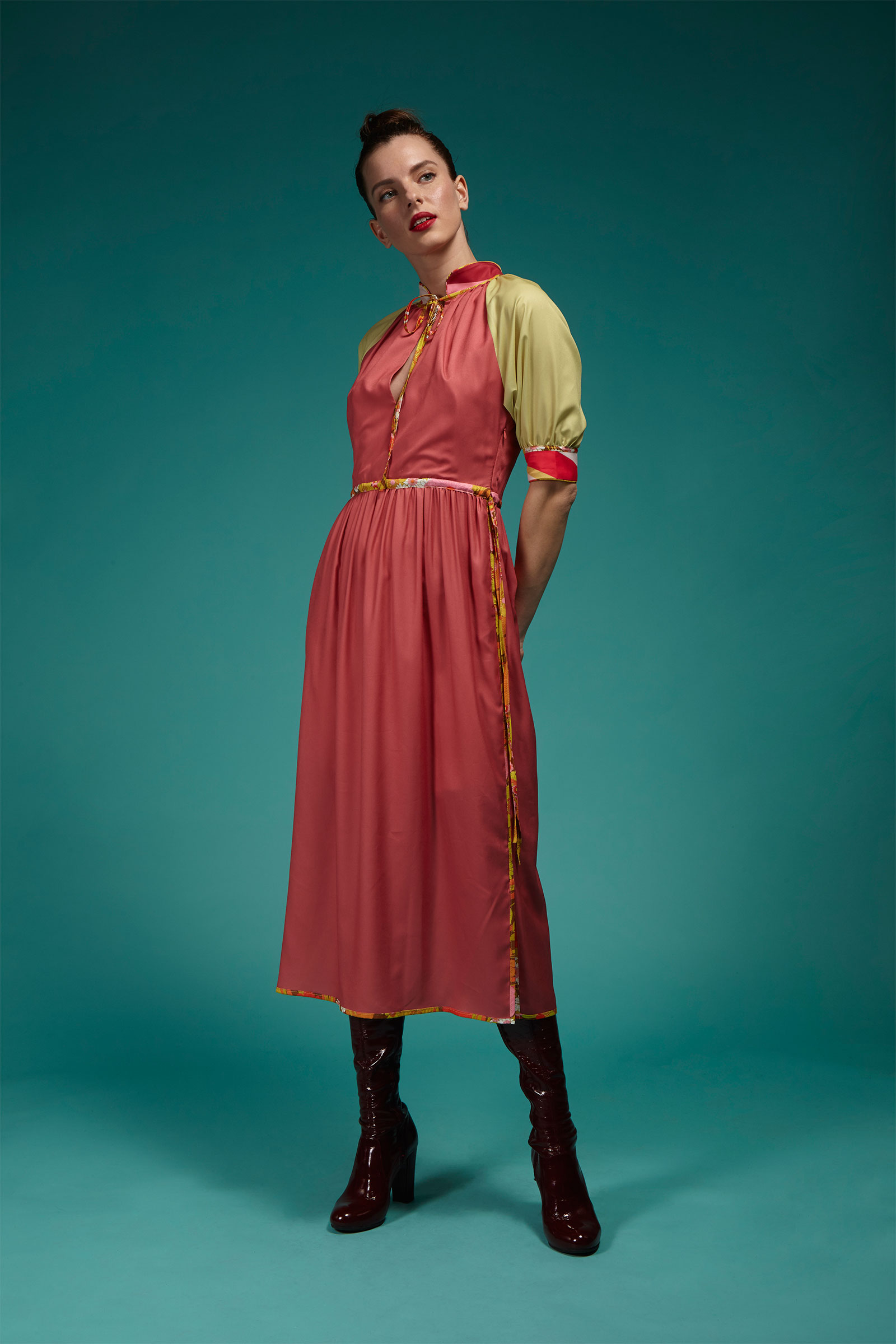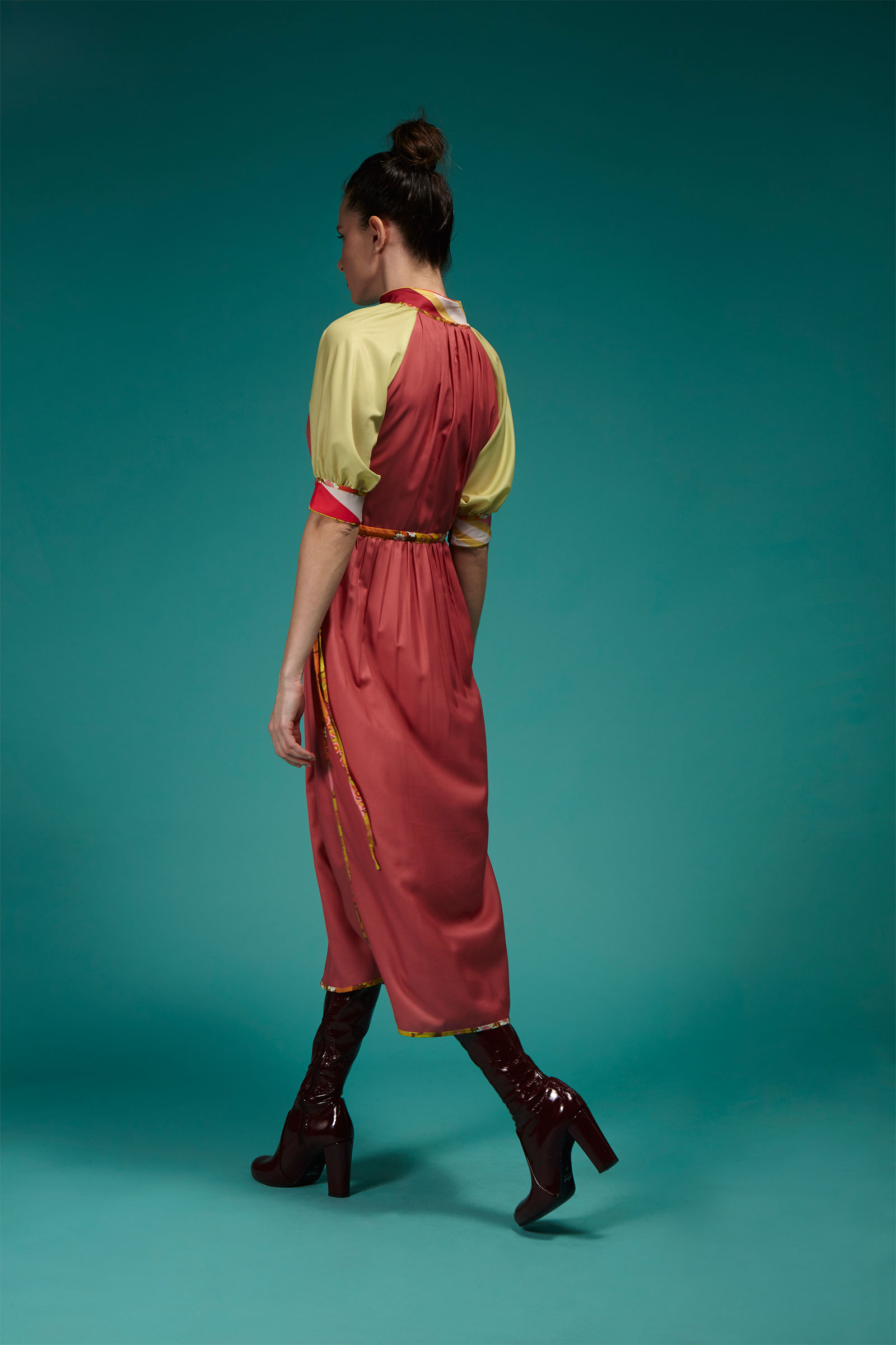 Short sleeves midi dress with small cuts on the sides and detailed straps that adjust the waist.