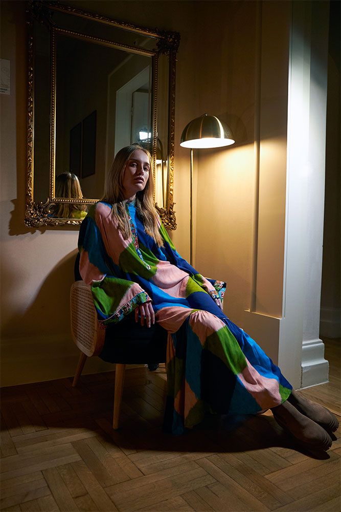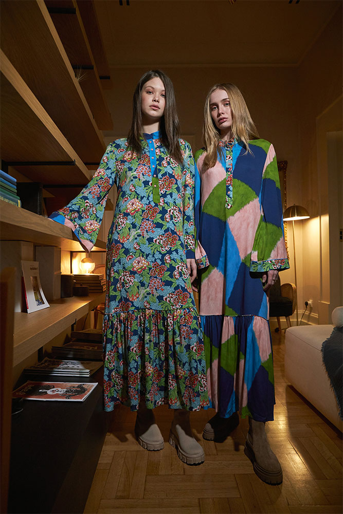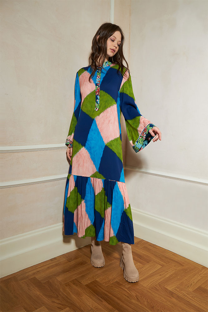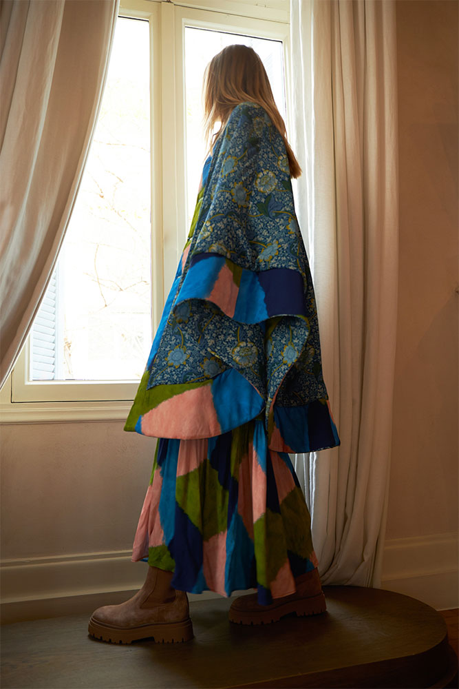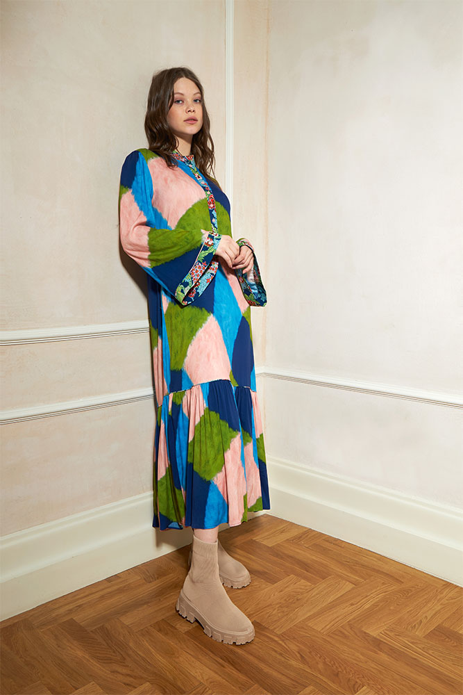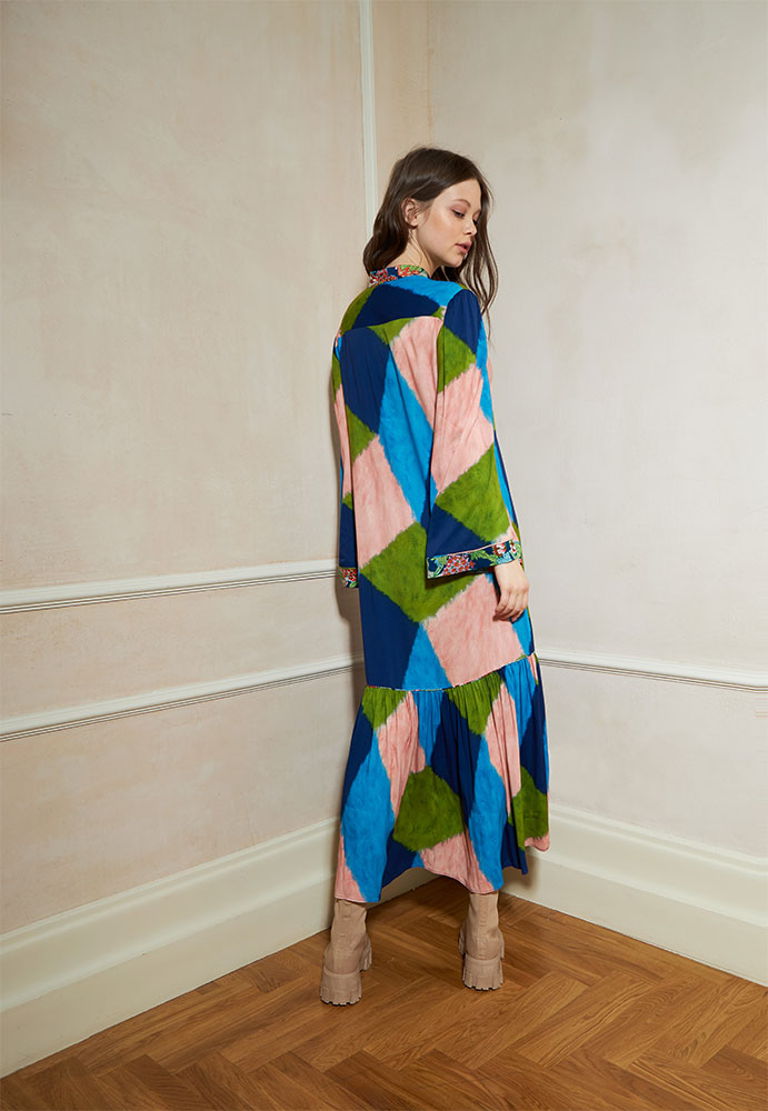 bell sleeved mao coral dress with frill on the bottom.