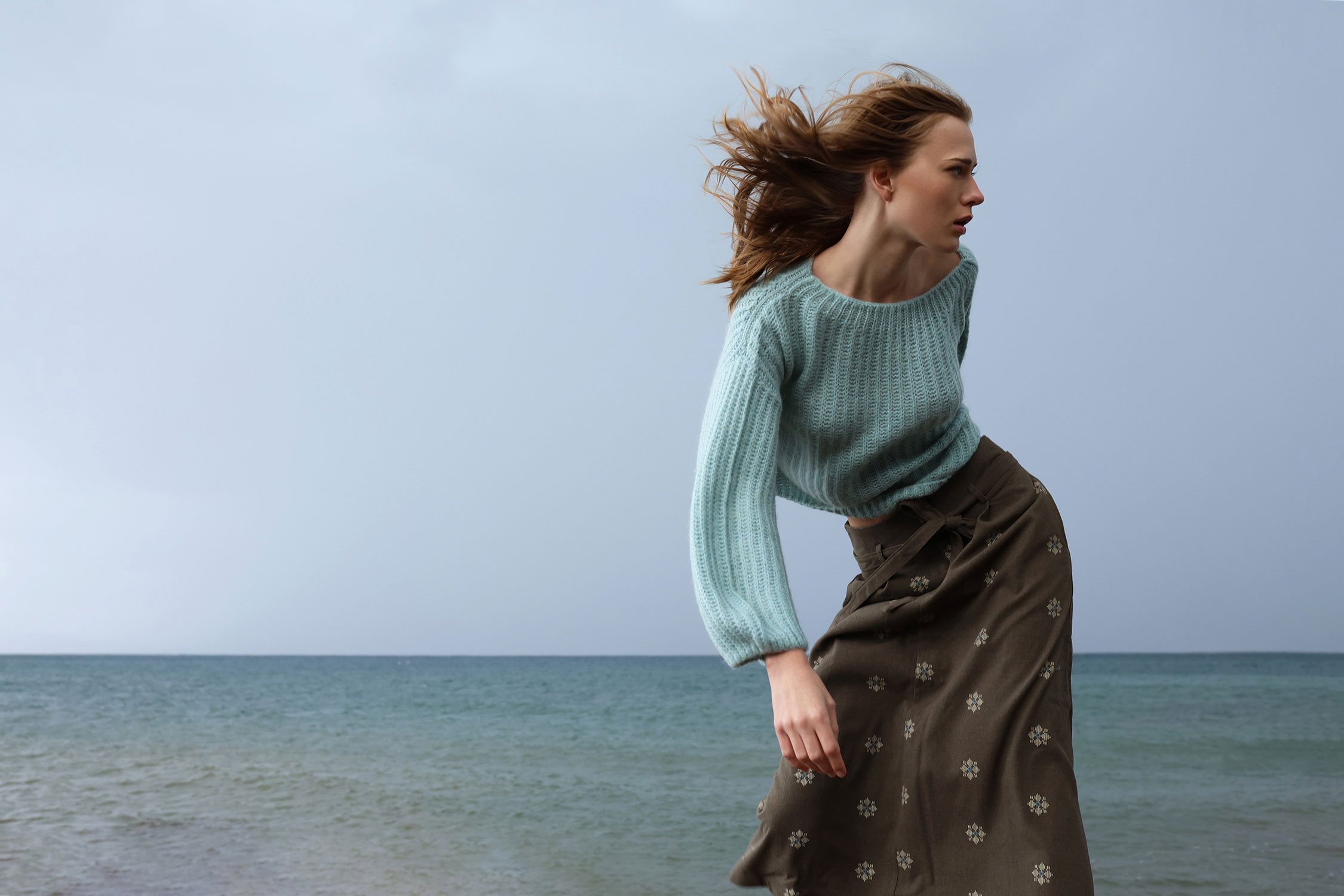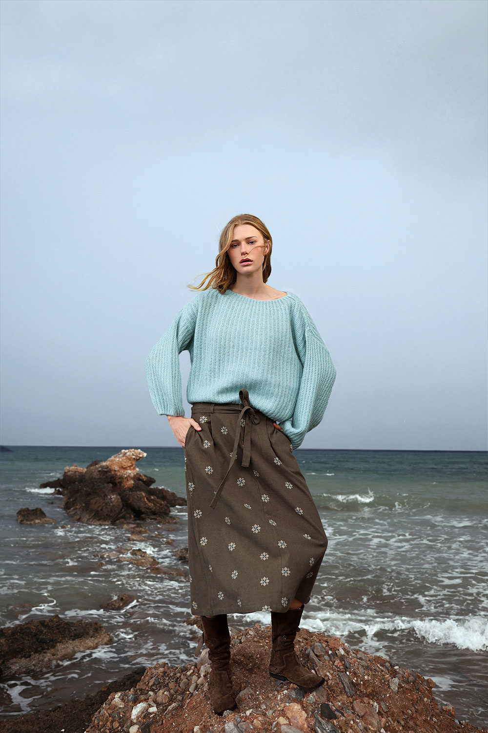 The Emma skirt is a mid length piece that distinct for its interesting design and versatility. Its desaturated color, belt loops and geometric floral embroidery design, with an A line fit make it a comfortable option that will keep you company from fall to winter.