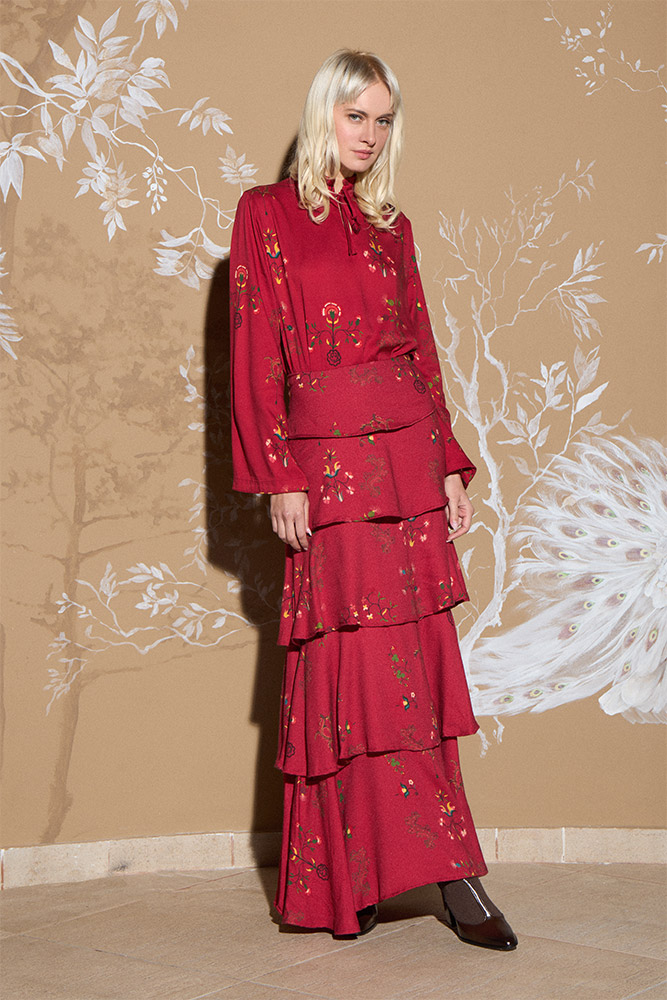 The Estefania Red Skirt is a high waist slim fit design made to impress. The ethereal pattern on this delicate piece covers thoroughly and elegantly the symmetrical ruffles while a zipper on the center back creates the perfect adjustment for the waistline. An easy yet fascinating way to experience this season.