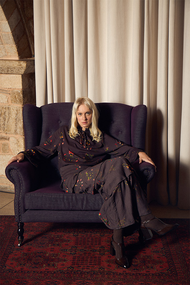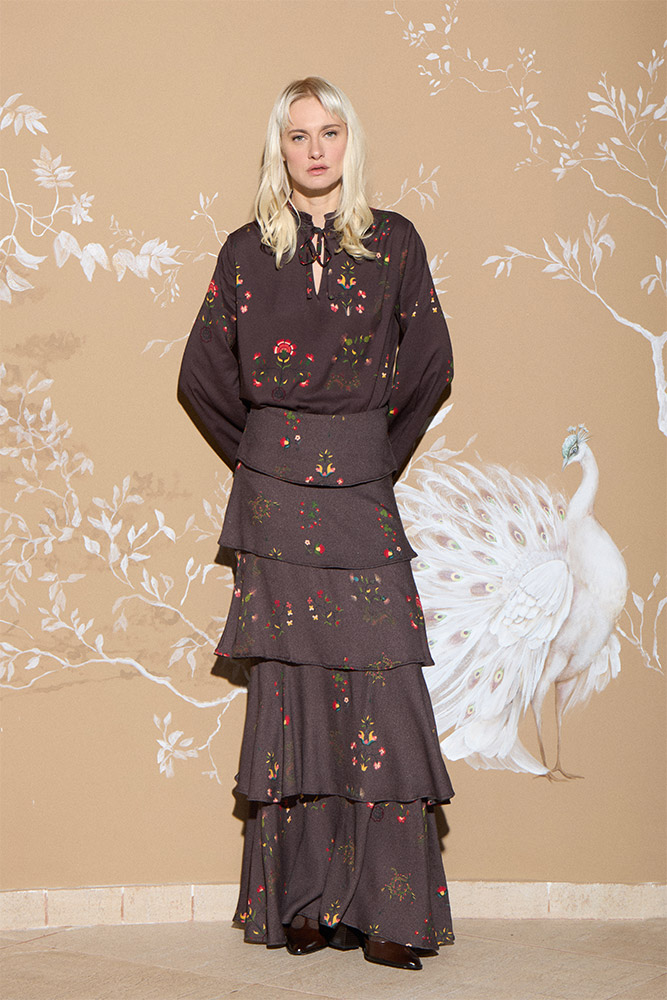 The Estefania Chocolate Skirt is a high waist slim fit design made to impress. The ethereal pattern on this delicate piece covers thoroughly and elegantly the symmetrical ruffles while a zipper on the center back creates the perfect adjustment for the waistline. An easy yet fascinating way to experience this season.