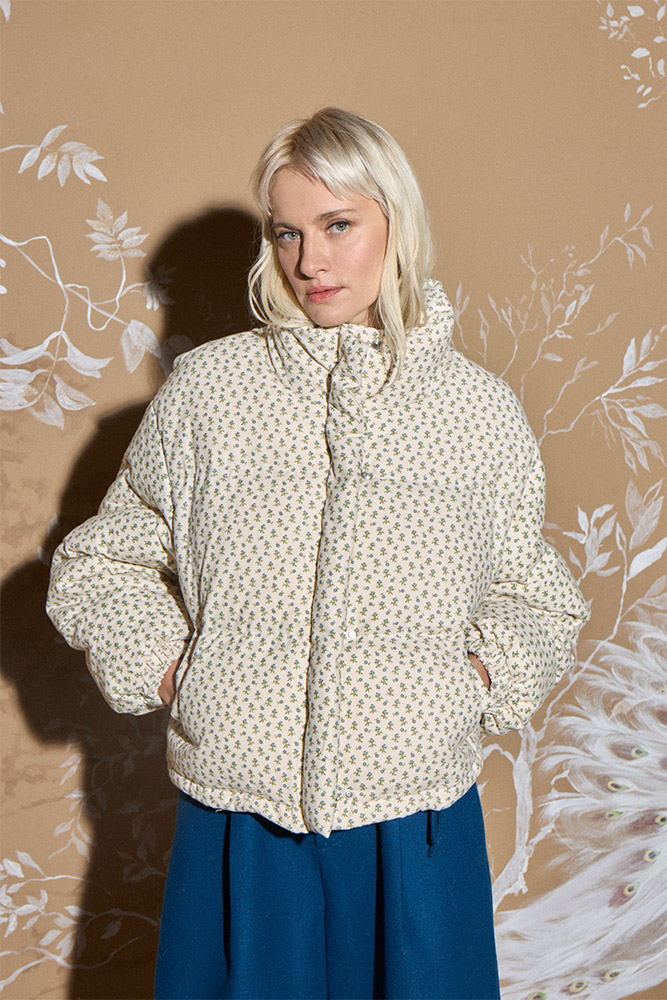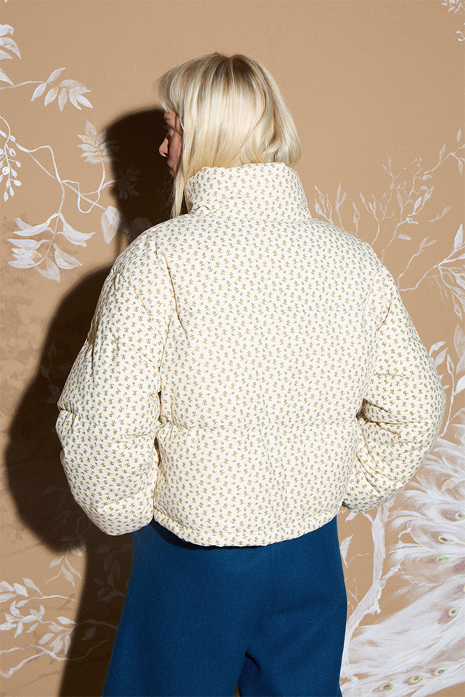 The Glenda Jacket is the most romantic puffer Jacket that manages to blend a very modern crop silhouette with a coquet print of a white surface with a blue floral design. It has a zipper as well as hooks and eyes. With pockets a high collar and elastic in both of its long sleeves it promises to keep you warm during the coldest winter days.