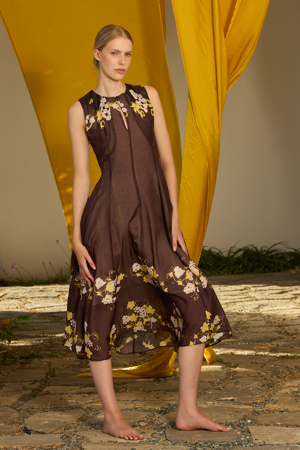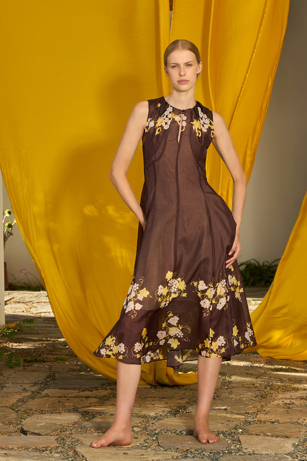 The Grape Dress is a sleeveless midi length graceful design made of silk and cotton. It is distinguished by its slim fit on the top that pleasantly gets more flary on the bottom. The keyhole neckline showcases an even more elegant appearance and the side pockets allow some rest of the hands. The zipper on the center offers the perfect adjustment.