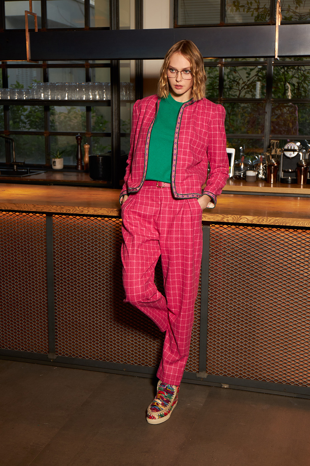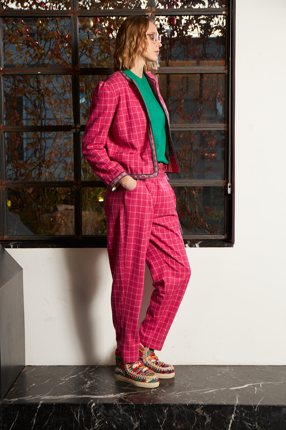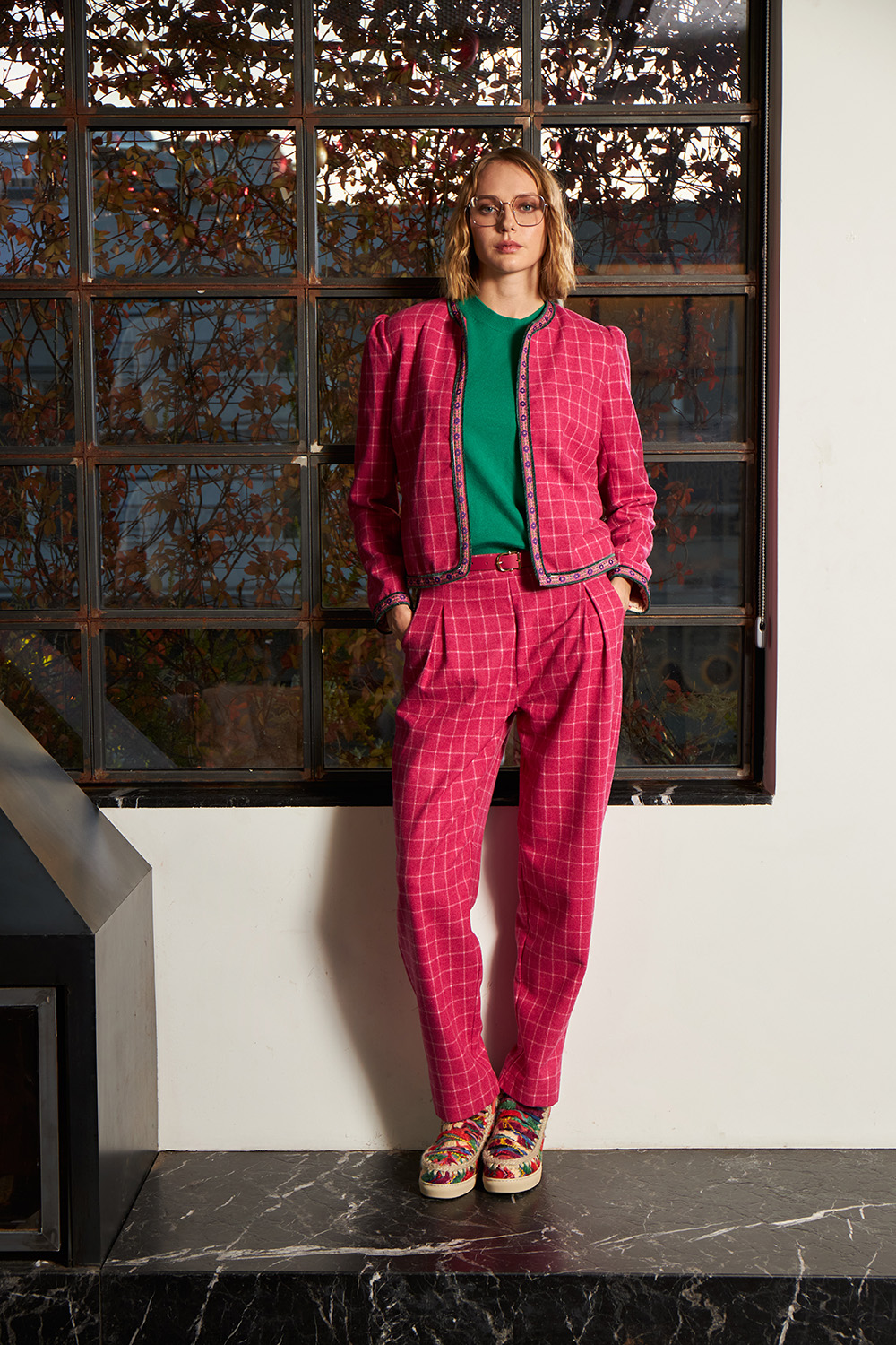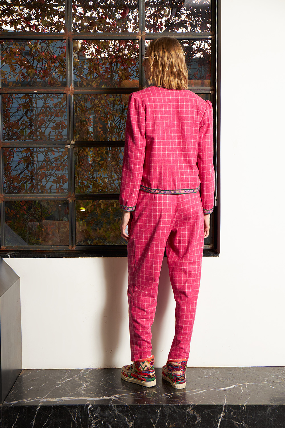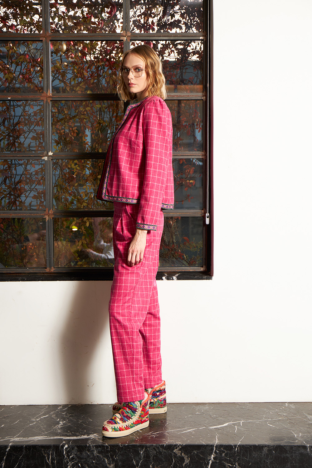 Slim fit jacket with shoulder pads and a unique piping all around at the end of the main body as well as at the end of the sleeves.