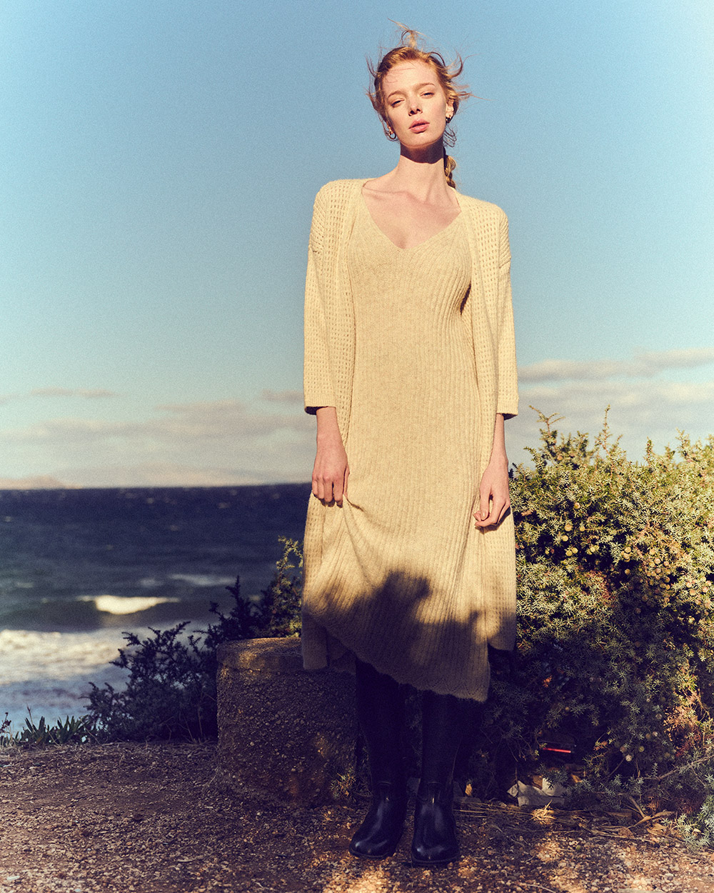 Midi sleeveless dress with spaghetti straps. Both the front and the back neckline are in the shape of a V, as well as the armpit.