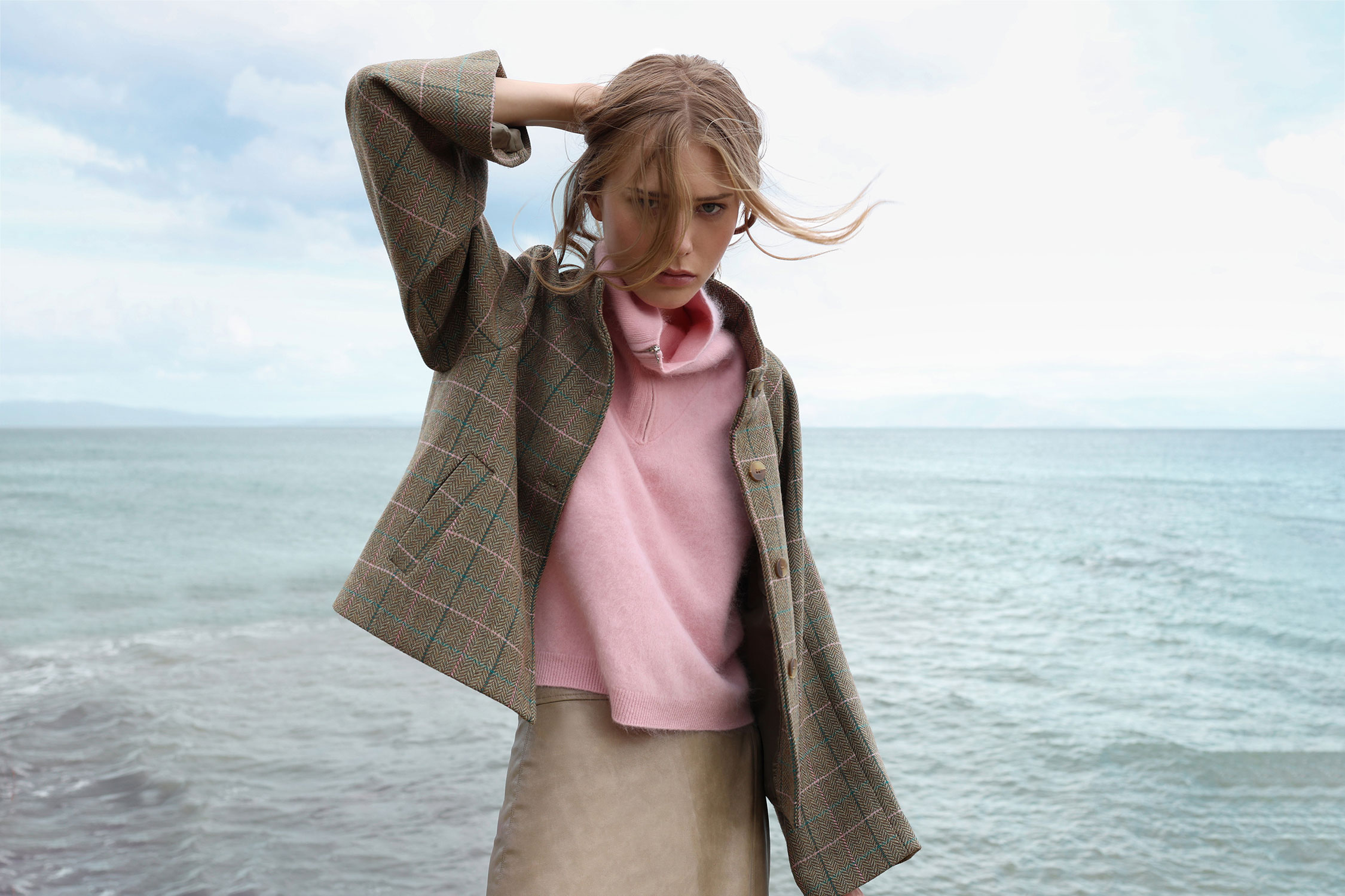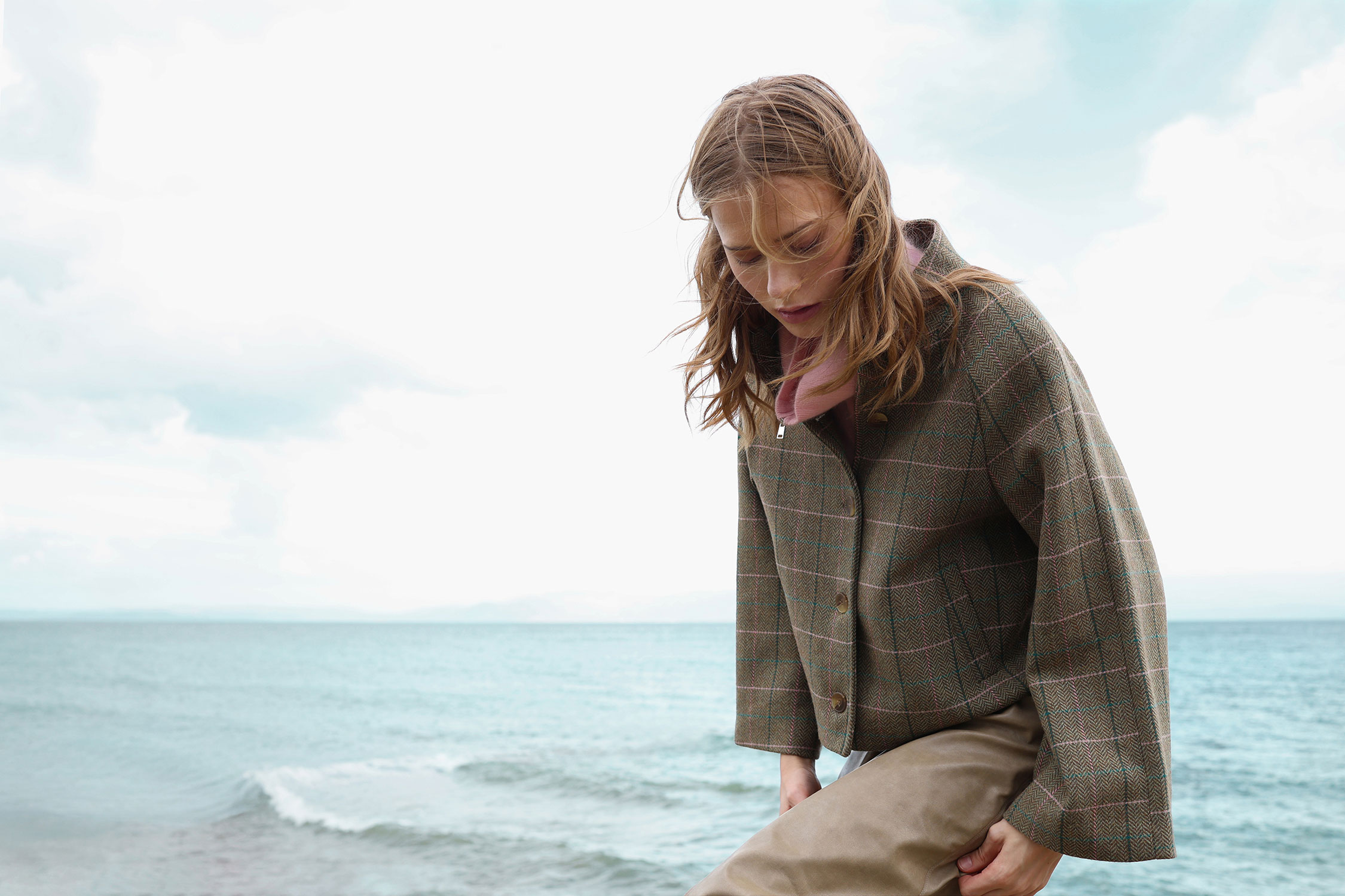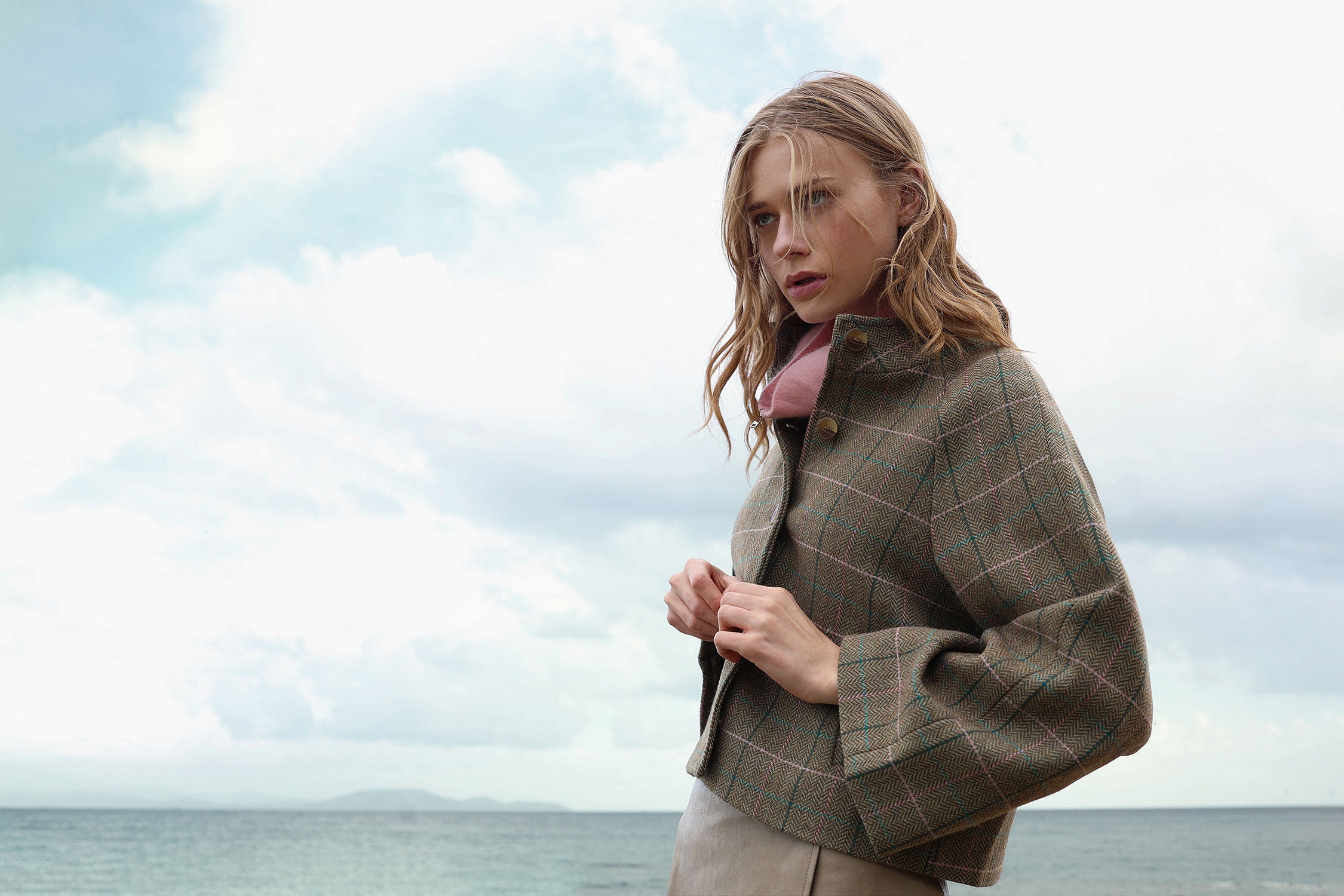 The Andrea coat is a cropped number with an A line fit bell shaped sleeves and button closures. The desaturated oil color, pink and brown checkered lines and tweed fabric add a bit of fun to this elegant design.