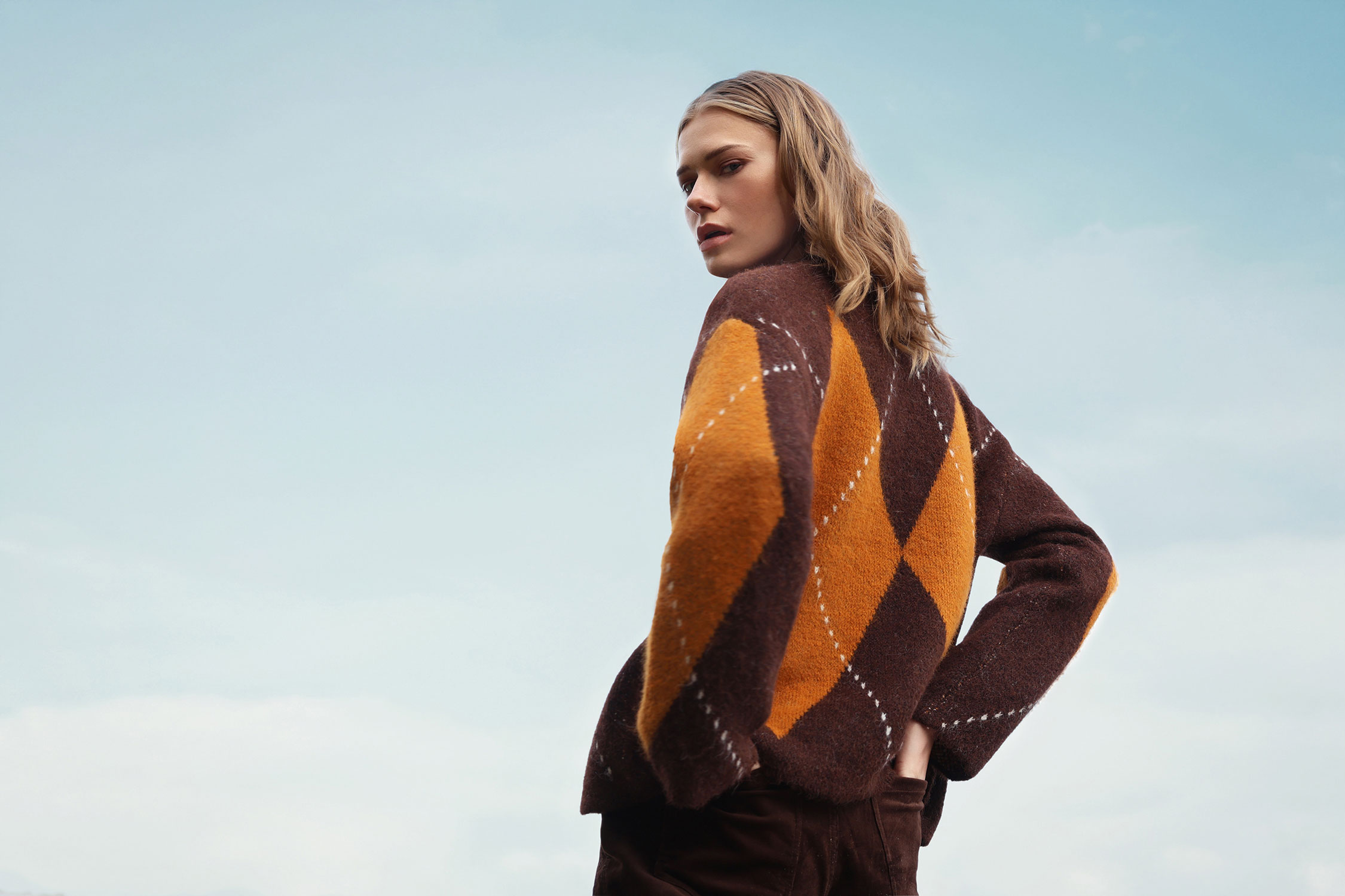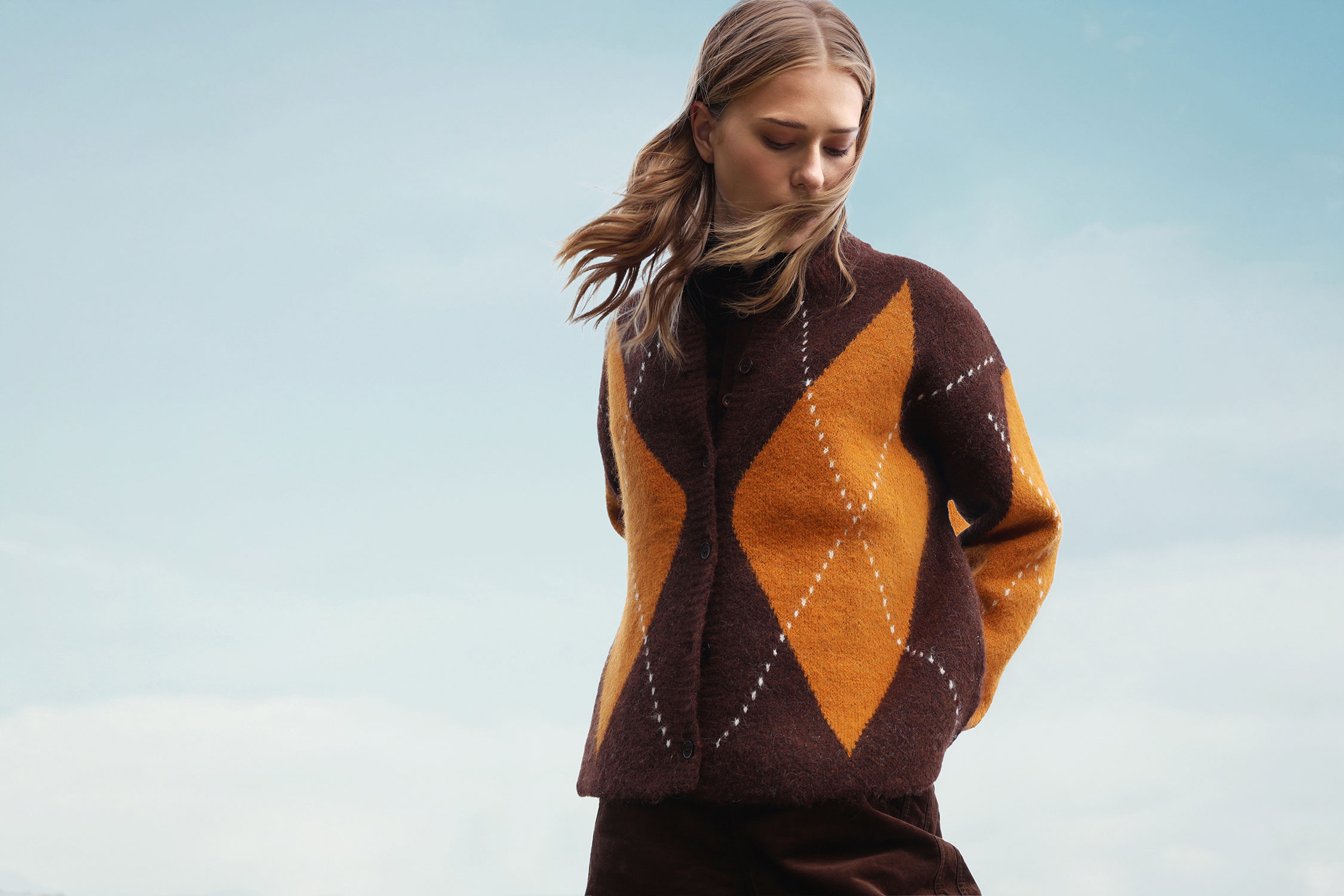 The Laiza Cardigan, is a wool and viscose knit that promises comfort and warmth all winter long. It is soft to the touch yet has an interesting yellow rhombus pattern with white lines on a brown background. Its wide fit and button closure add to its practicality.