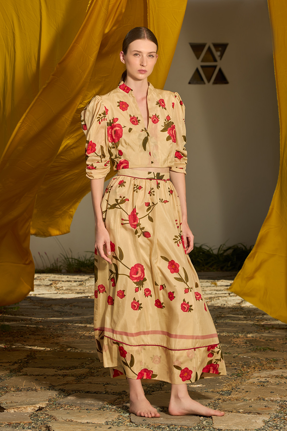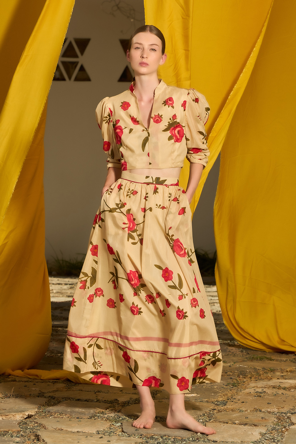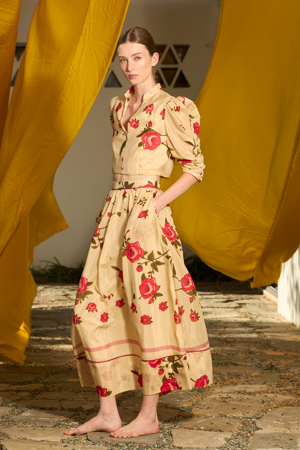 The Lucia Red Skirt is a high waisted maxi skirt with delicate folds around the waist. The distinctive pipping around the waistband and the hem showcases the modern vibe of this chic design while the side pockets add even more coolness to this effortless look. The zipper on the back makes it very easy to wear this charming piece made of the fine combination of silk and cotton.