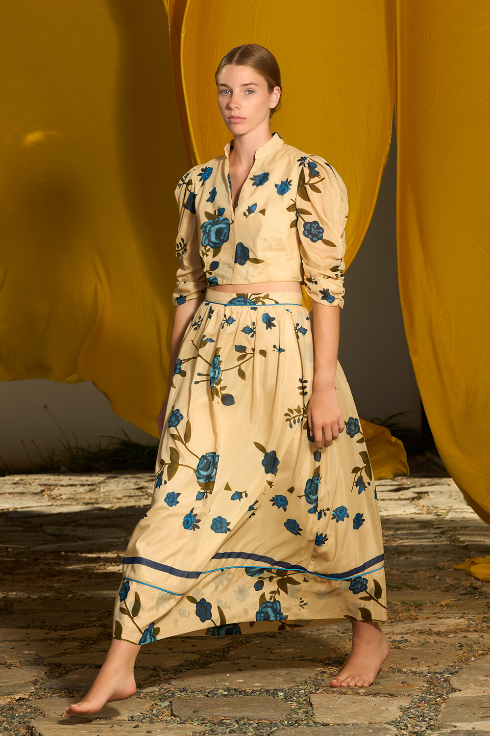 The Lucia Blue Skirt is a high waisted maxi skirt with delicate folds around the waist. The distinctive pipping around the waistband and the hem showcases the modern vibe of this chic design while the side pockets add even more coolness to this effortless look. The zipper on the back makes it very easy to wear this charming piece made of the fine combination of silk and cotton.