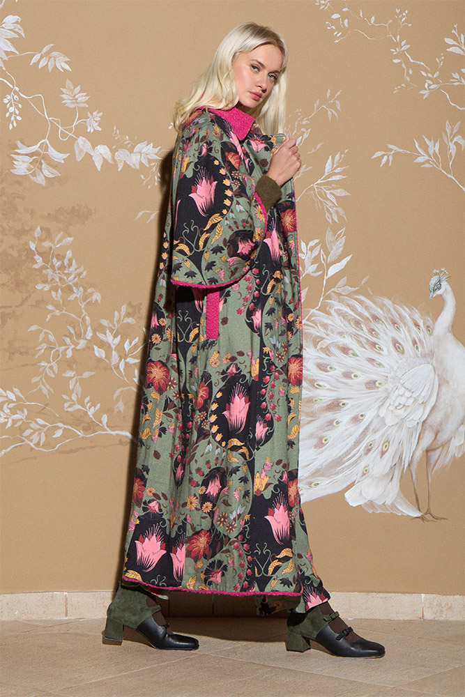 The exquisite Mabel Double Face Cape is an one of a kind piece full of design feminity and beauty. Either worn monochromatic or with the appealing oil based print this so unique cape will captivate everyone who will face it. The large three quarter bell sleeves along with the classic collar and the side pockets add some more elegance to this unmatchable look.