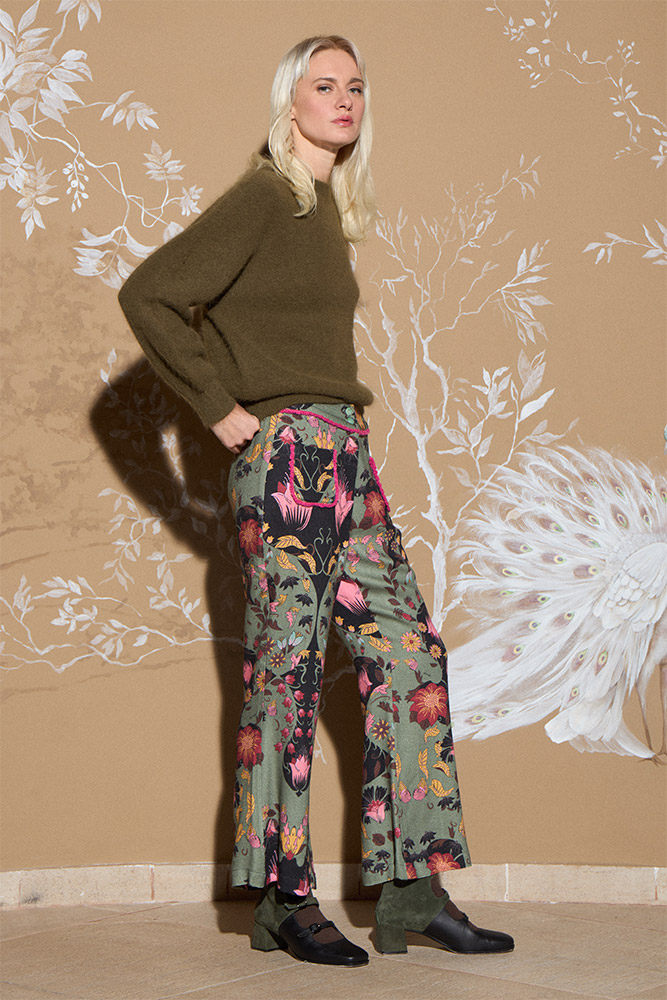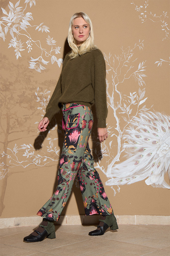 The Mabel Oil Pants is a combination of comfort and coziness. The slim fit of this design along with its external pocket on the front surrounded by a hot pink piping that creates the perfect contrast offers the ultimate feeling for this season. An easy to wear look with two large buttongs and a zipper on the front.